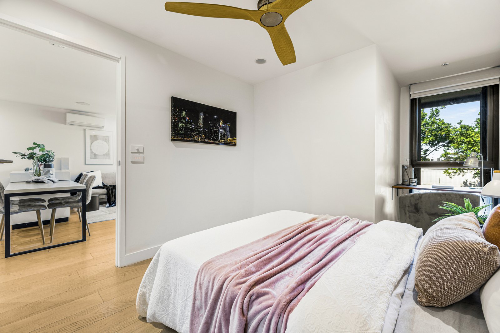 The master bedroom offers a clever study nook, while the second bedroom enjoys floor-to-ceiling windows and a peaceful aspect. Both bedrooms feature built-in robes and block-out/screening blinds, creating restful spaces day and night. A modern bathroom and European laundry complete the internal layout.