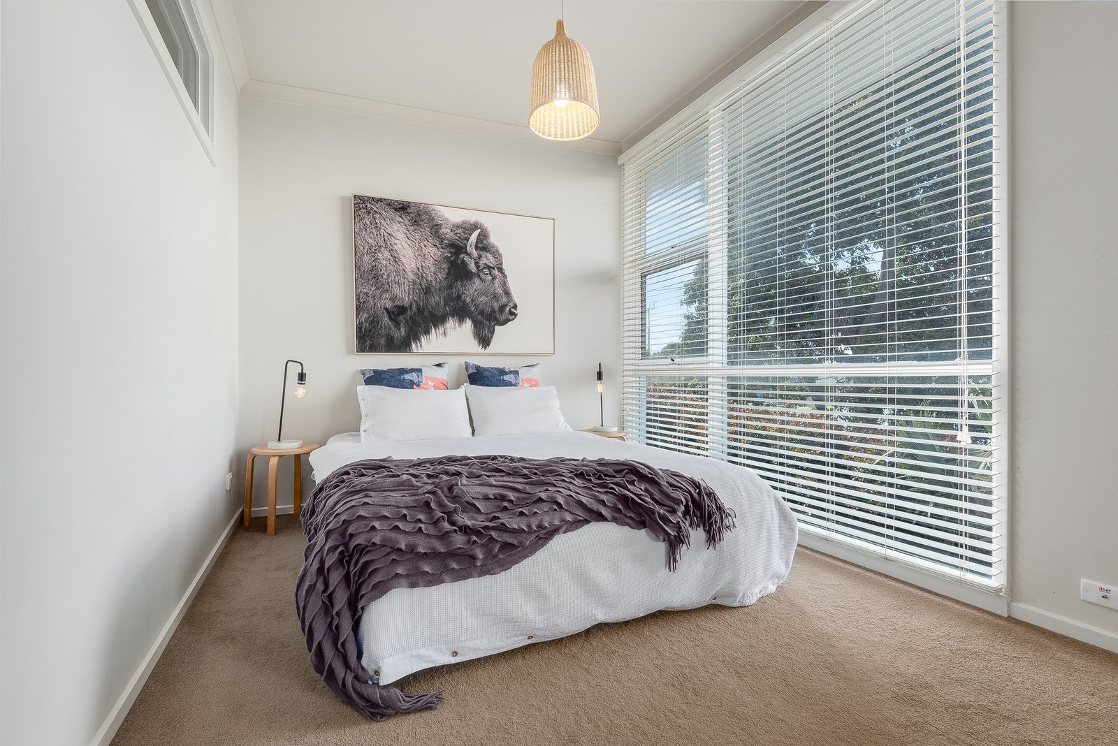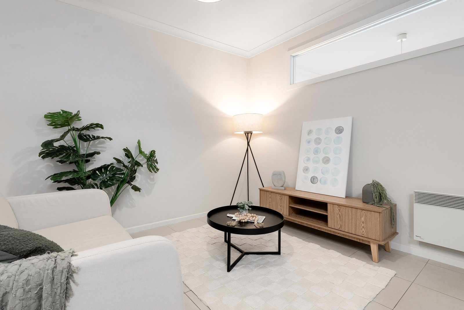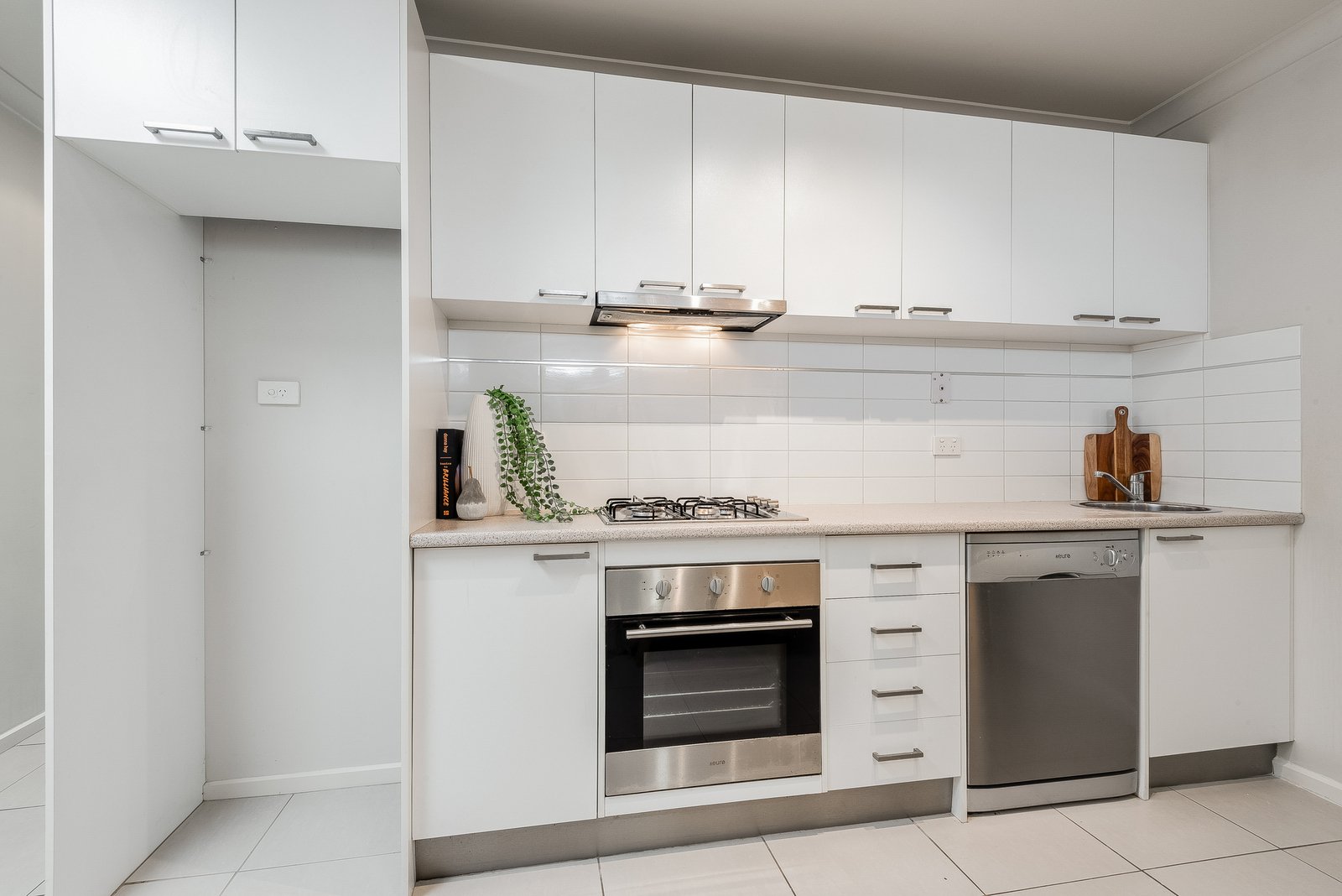 Entry to the apartment reveals an open plan kitchen, dining and living area, featuring an elegant neutral colour scheme, with a skylight and internal window enhancing natural light. The kitchen features euro appliances including a 600mm oven, gas cooktop, rangehood, dishwasher, well-equipped for everyday living. A Noirot electric panel heater creates a cosy atmosphere throughout.