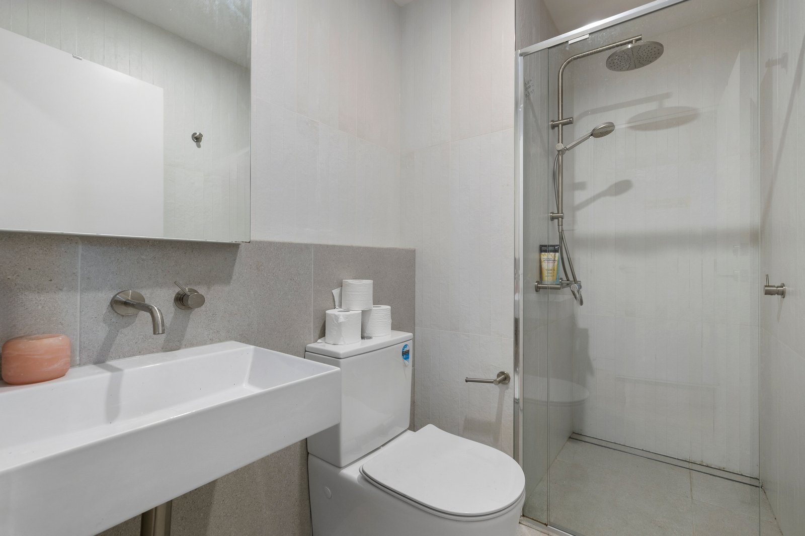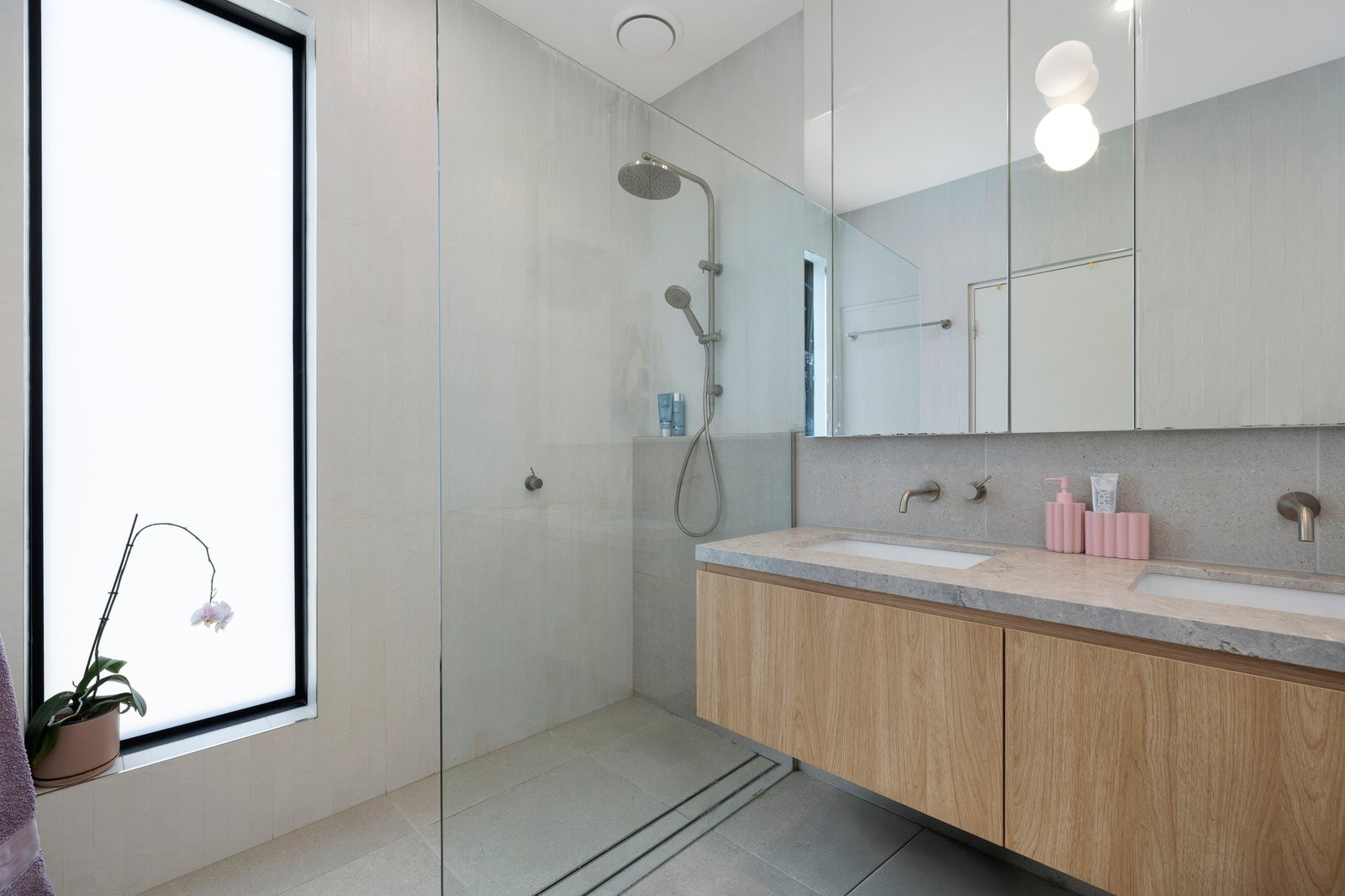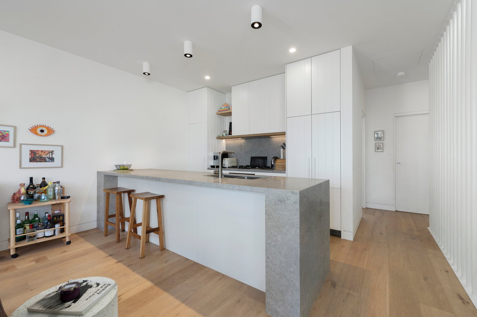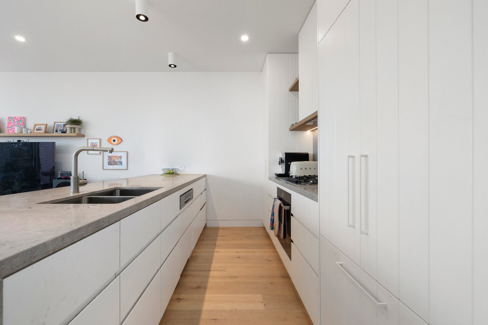 Upstairs, the open plan living/dining zone spills outside to a sheltered BBQ terrace. Perfectly positioned for indoor and outdoor hosting is a stunning kitchen with premium appliances – including a semi-integrated dishwasher & gas cooktop – lavish waterfall-edge stone and a fully integrated fridge/freezer.