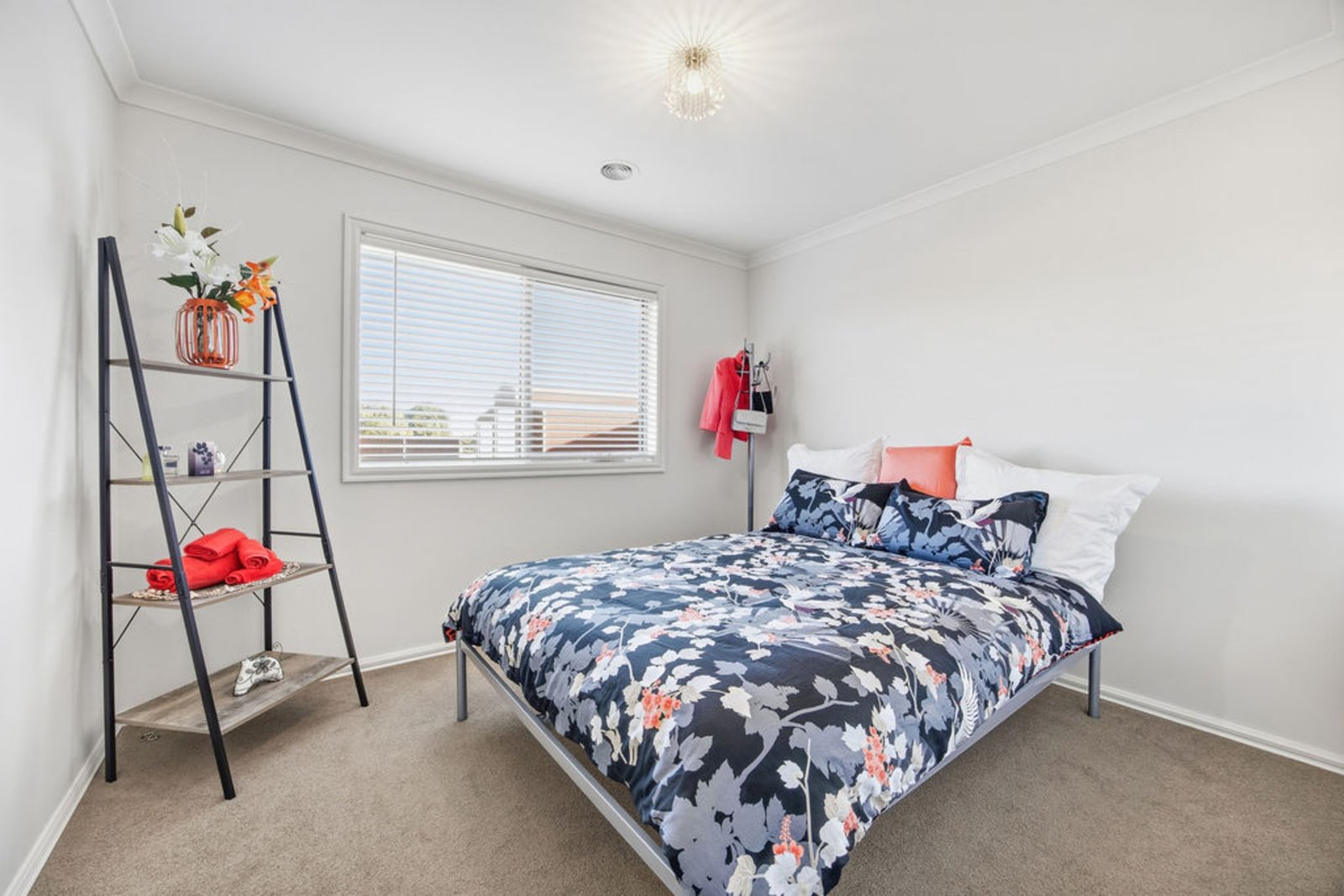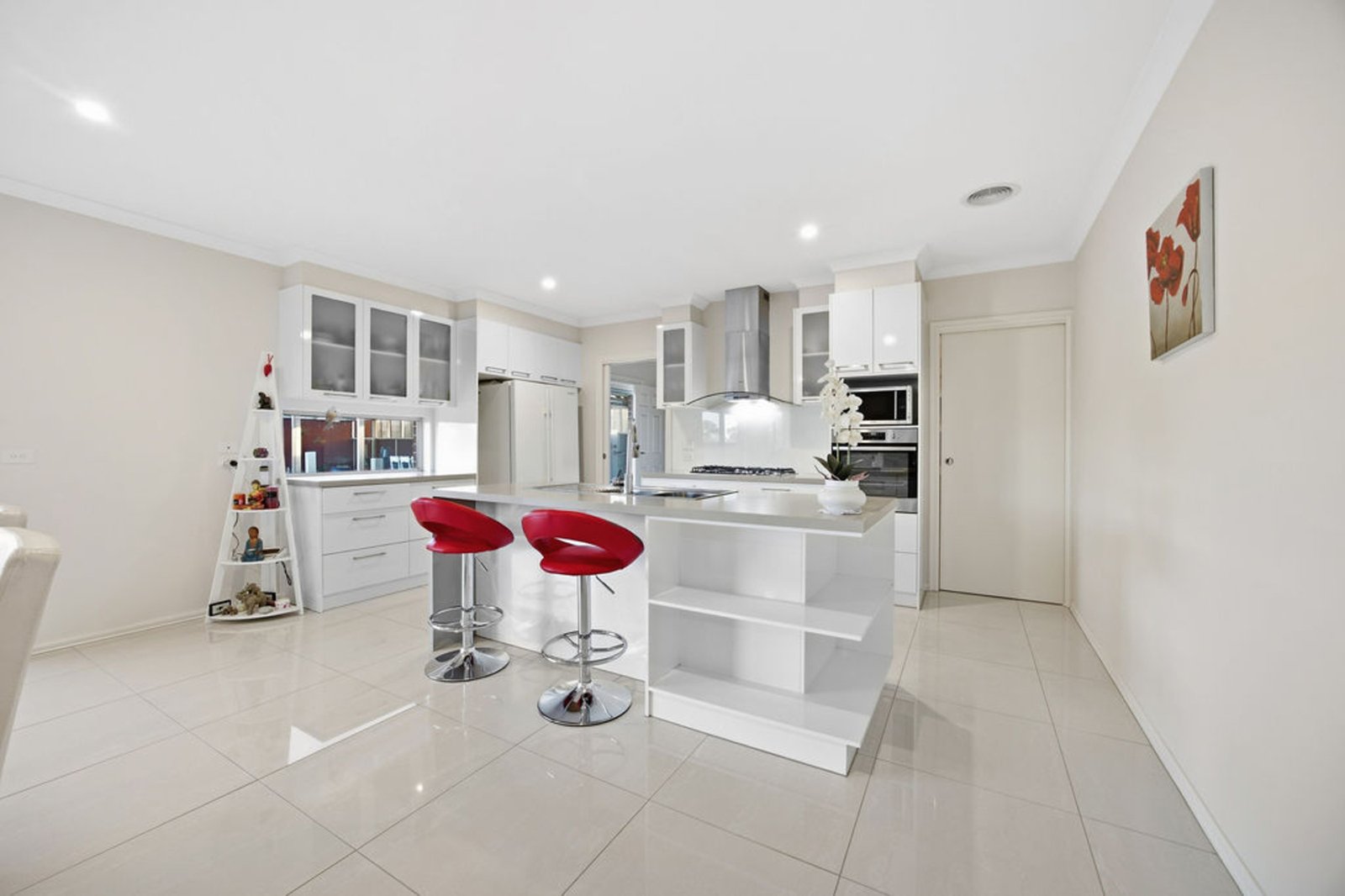At the front of the home, a formal living space with plantation shutters creates a welcoming retreat. The open-plan kitchen, living and dining area is the heart of the home, complete with stone benchtops, a 900mm cooktop, wall oven and an abundance of storage. Comfort is maintained year-round with gas central heating, double-glazed windows and a split system to the main living area.