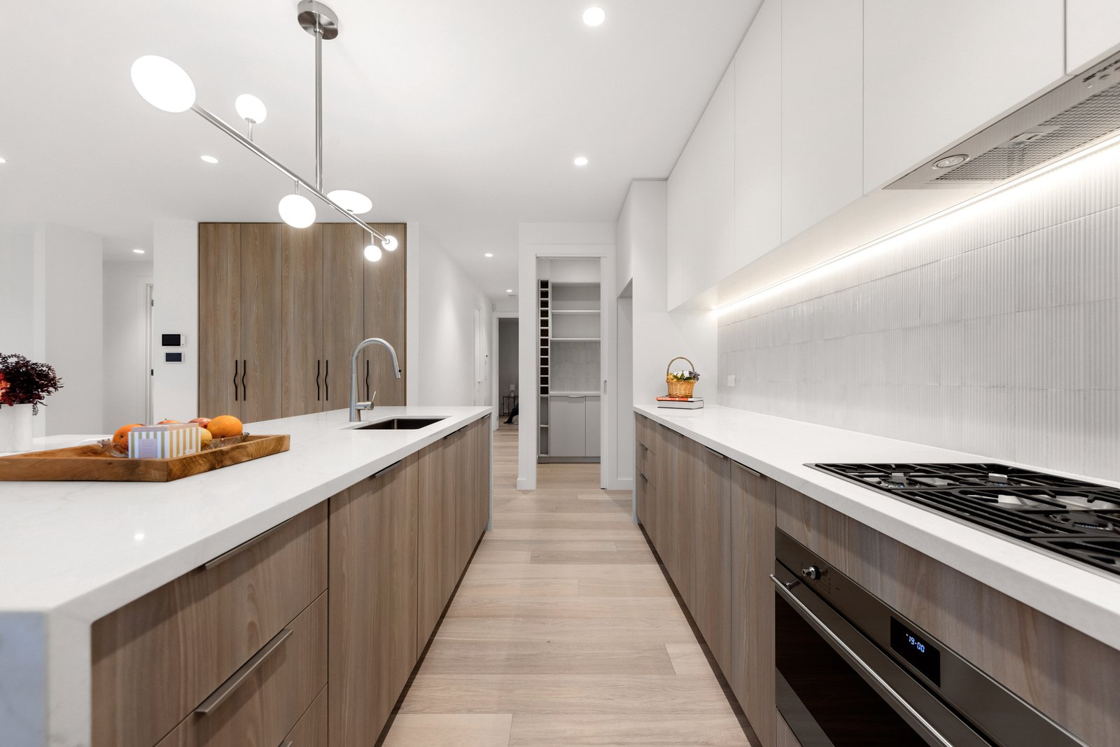 The ground floor showcases a striking porcelain island-bench kitchen with 900mm Smeg cooktop/rangehood, integrated dishwasher, and built-in TV cabinetry. Overlooking the expansive open-plan dining and family area, broad sliding doors open to a north-facing BBQ/alfresco space, complemented by spacious front and side gardens. Premium woodcut timber flooring, high ceilings, and double-glazed windows enhance the sense of style and light. A ground-floor master suite with ensuite, powder room, walk-in pantry, built-in storage, and a separate laundry with deck access complete the level.