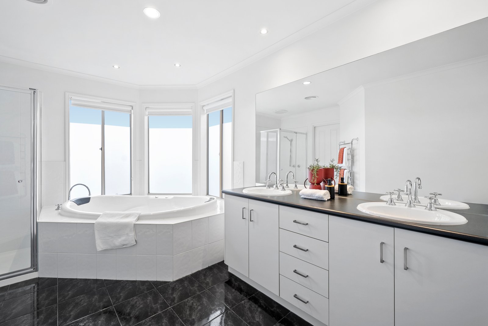 Immensely accommodating with a full-width master-domain with room to retreat, a spectacular spa-ensuite and views over the pool to the sparkling city, this adaptable design features a clever ground-floor home-office to double as an overflow fifth bedroom, and classic quality bathrooms - all with a private WC.