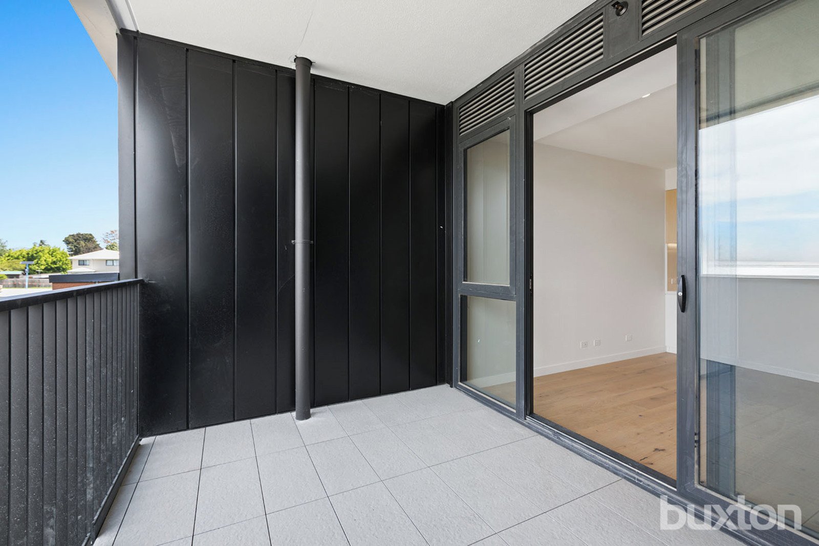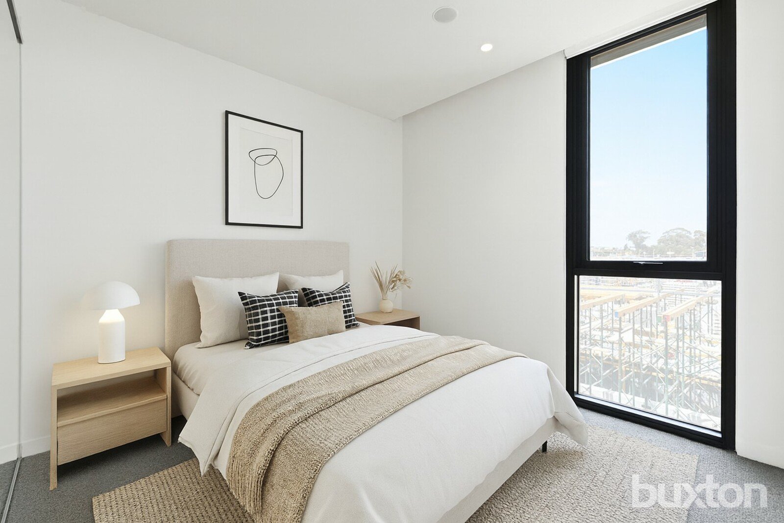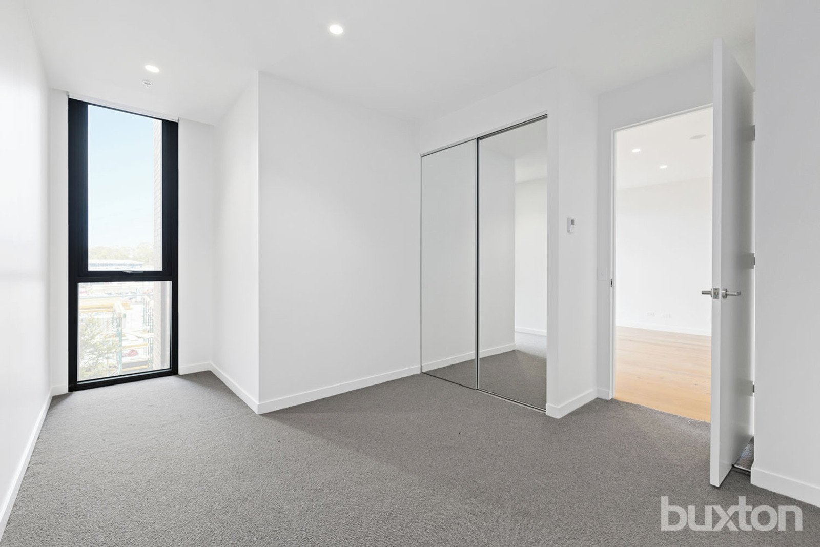The light-filled open-plan living and dining zone features pale oak flooring and full-height glazing, opening onto a private undercover balcony perfect for relaxed outdoor moments. The sleek kitchen is appointed with stone benchtops, soft-close cabinetry, integrated lighting and high-quality appliances. Both bedrooms include mirrored built-in robes and plush carpets, while the stylish bathroom offers a floating vanity, rain shower and refined matte fixtures.