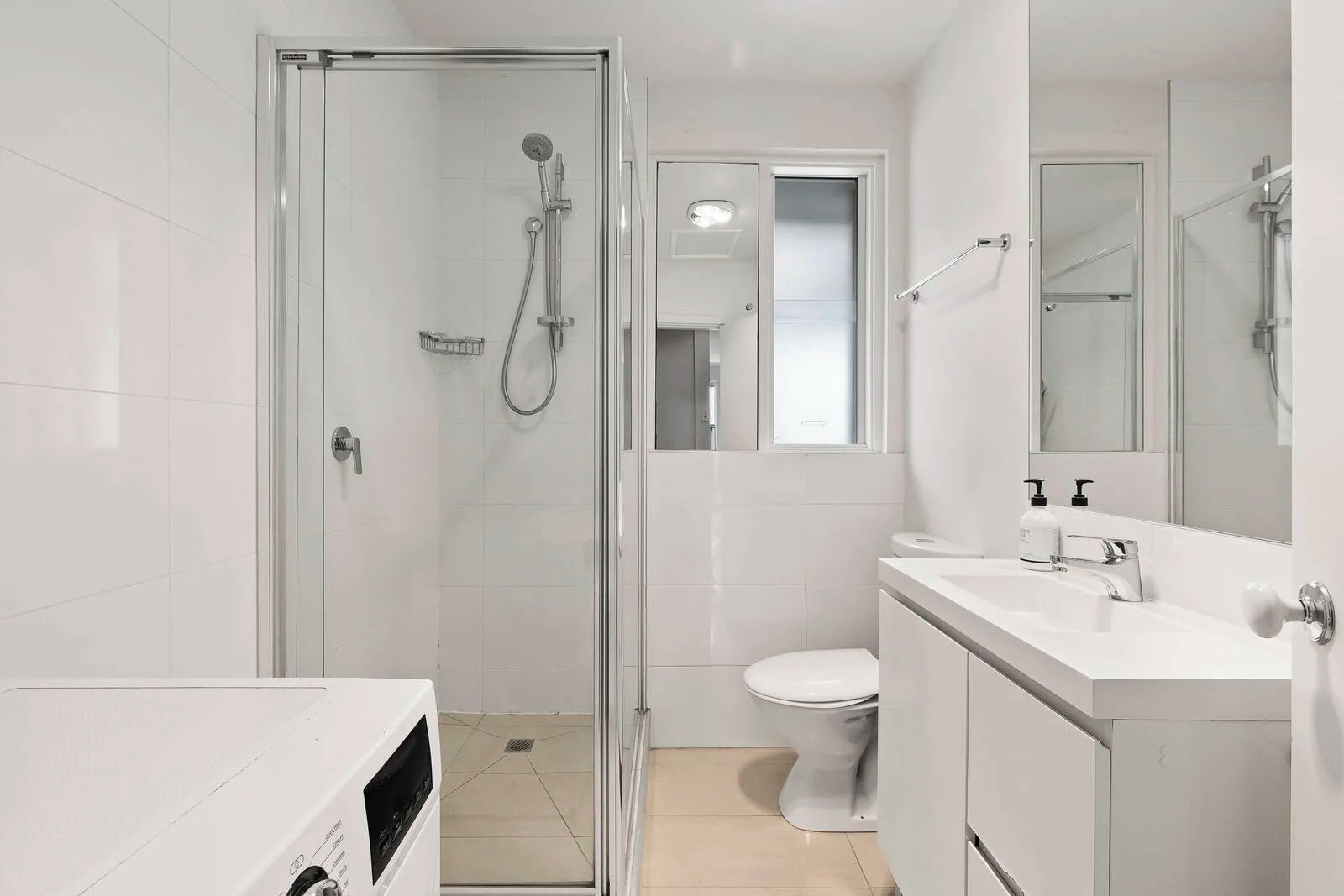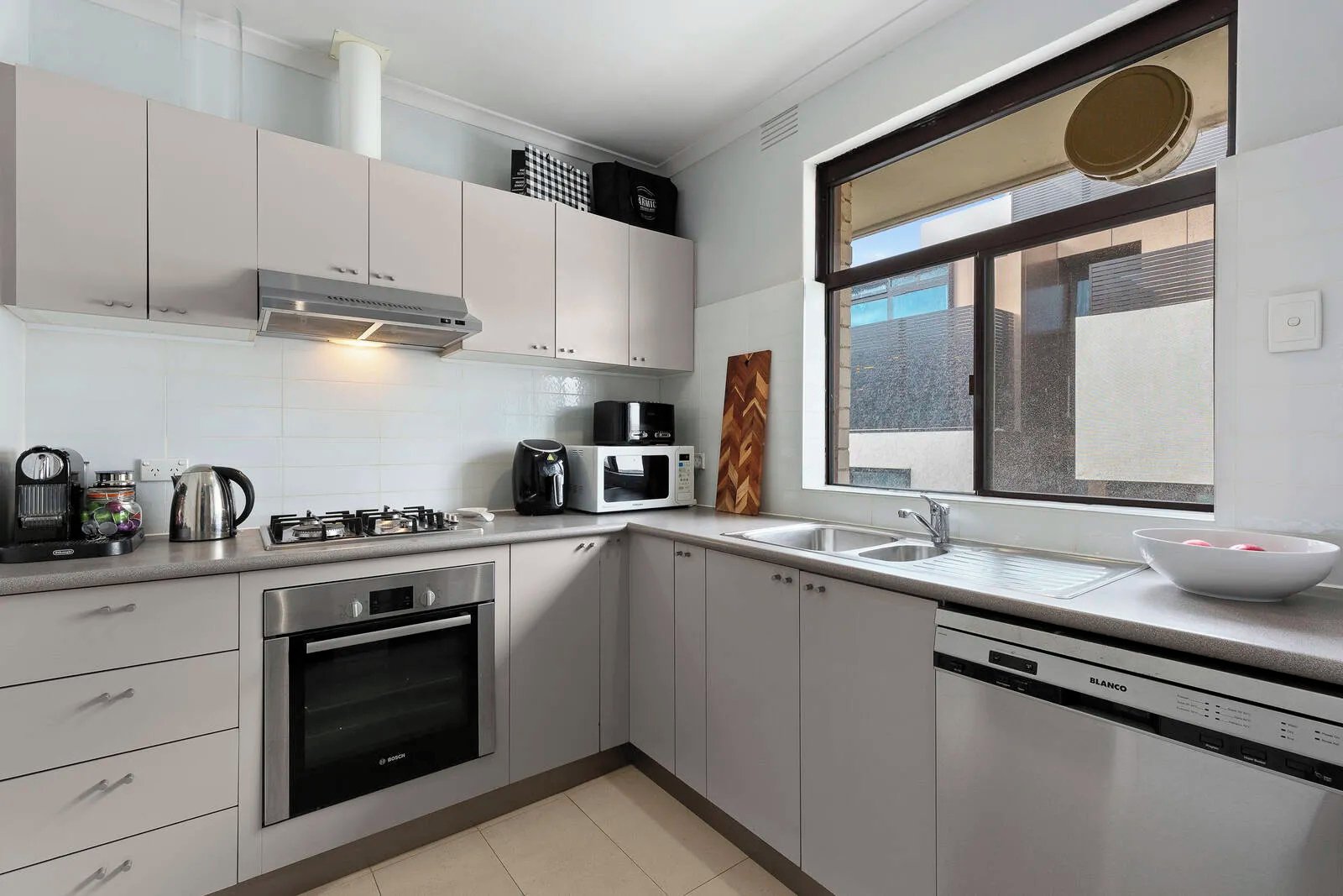 A central hallway leads you through to a generous light-filled living area that flows onto a full-depth undercover balcony, perfect for relaxed mornings or warm summer evenings. The modern kitchen is beautifully appointed with Bosch appliances, a dishwasher, and excellent storage, while both bedrooms feature quality soft-close built-in robes. The sleek central bathroom includes laundry taps and clever storage solutions to complete the picture.