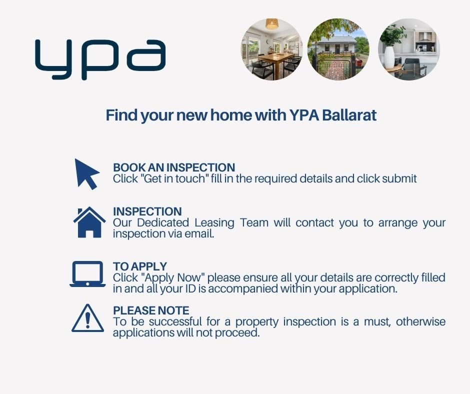 To APPLY for this property please copy and paste the following link into your browser: https://www.ypa.com.au/downloads/ypa-rental-application-form-fillable.pdf - once completed please submit your application to Ballaratpm@ypa.com.au