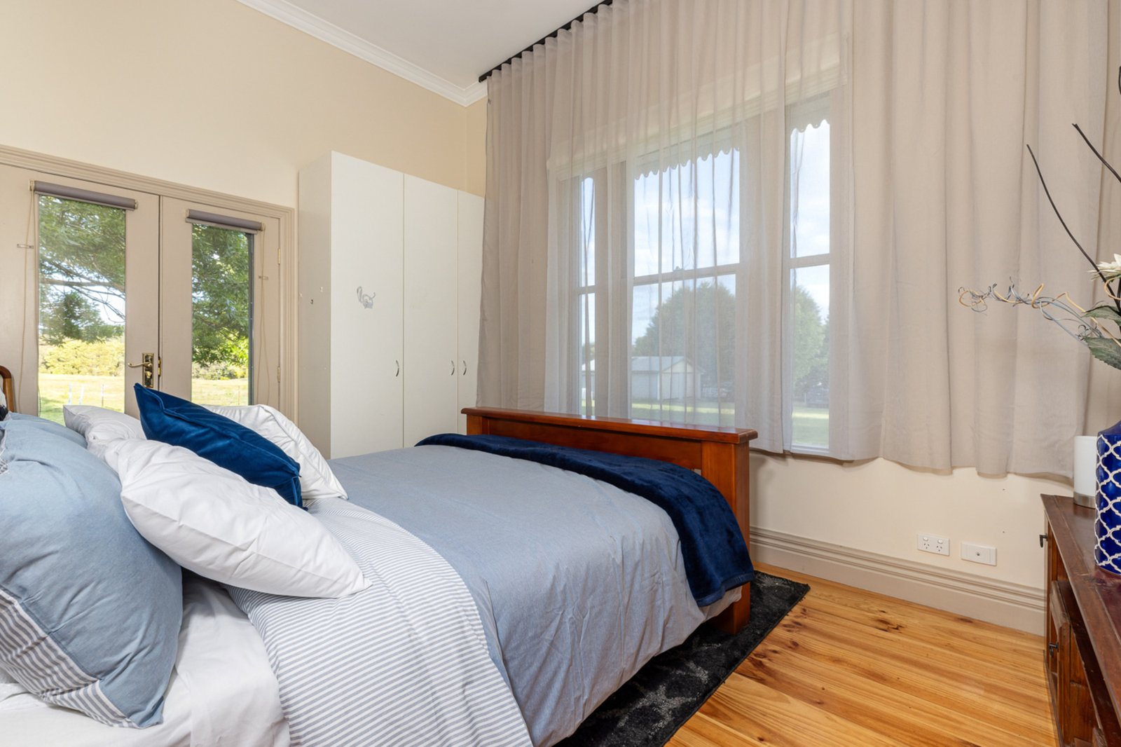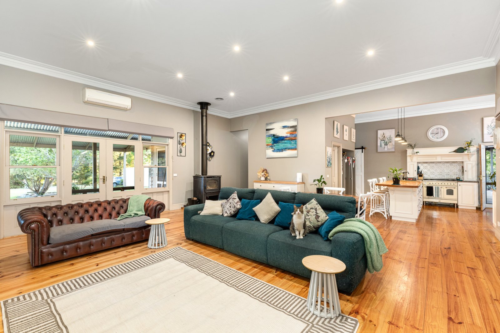 Step inside to a wide welcoming entrance with timber floorboards and striking sliding barn doors that lead into both the study and main living zone. The spacious study with built-in desk flows seamlessly into the light-filled living area, enhanced by large windows and a cosy wood fireplace, with split systems ensuring year-round comfort. The expansive open-plan kitchen and meals area features high ceilings, superb natural light, a timber-top island, double sink, abundant bench and storage space and a large walk-in pantry. The master suite offers a true retreat with a generous walk-in wardrobe, a spacious ensuite with bath, shower, vanity and toilet, plus direct access to the verandah. Three additional bedrooms each include robes and are serviced by a central bathroom. A practical mudroom with direct verandah access, separate laundry and linen storage add to the home’s excellent functionality. Multiple verandahs wrap the home, with one side connecting to a fully enclosed alfresco featuring a pizza oven, creating the perfect setting for all-season entertaining. Outside, the property offers a large carport, an outdoor firepit area, planted gardens and paved surrounds, along with sweeping open land ideal for families, pets or simply enjoying the quiet expanse of the countryside. All of this is beautifully framed by stunning rural views in every direction.