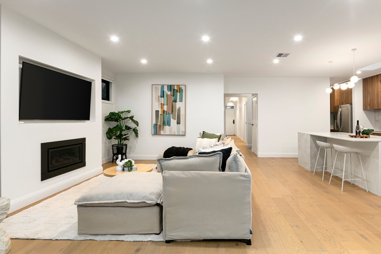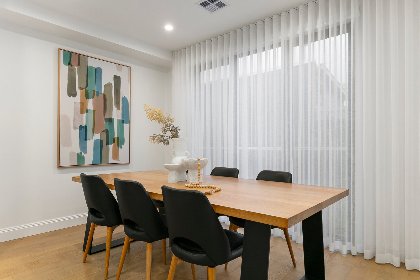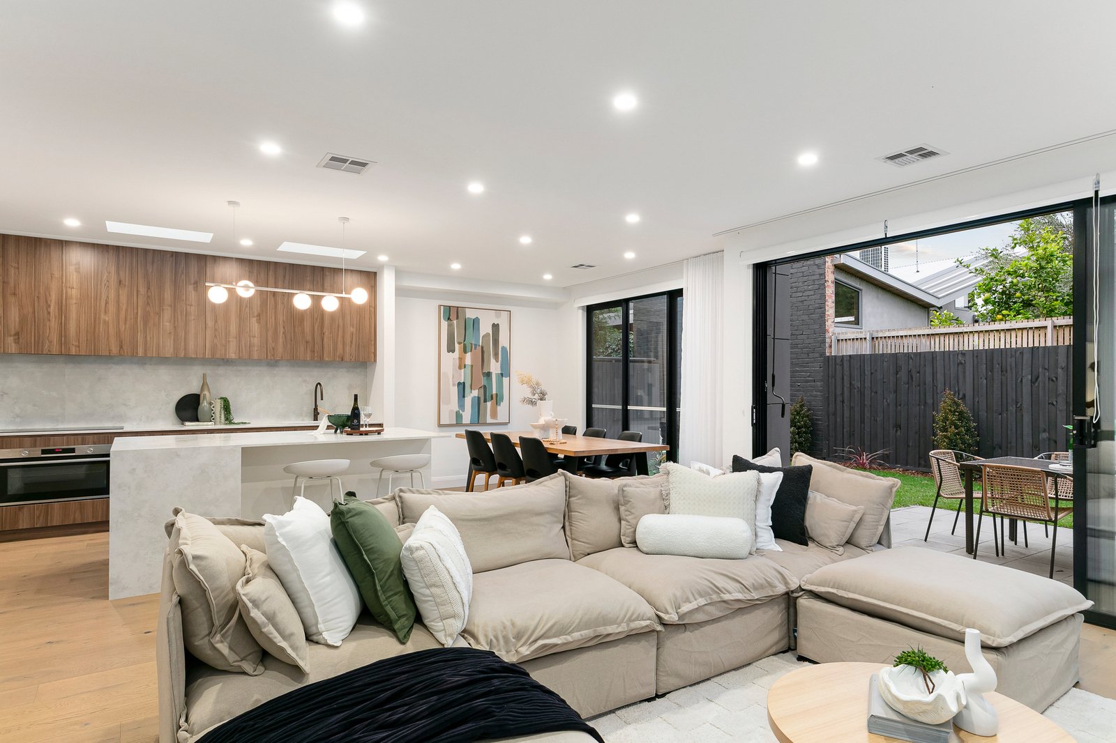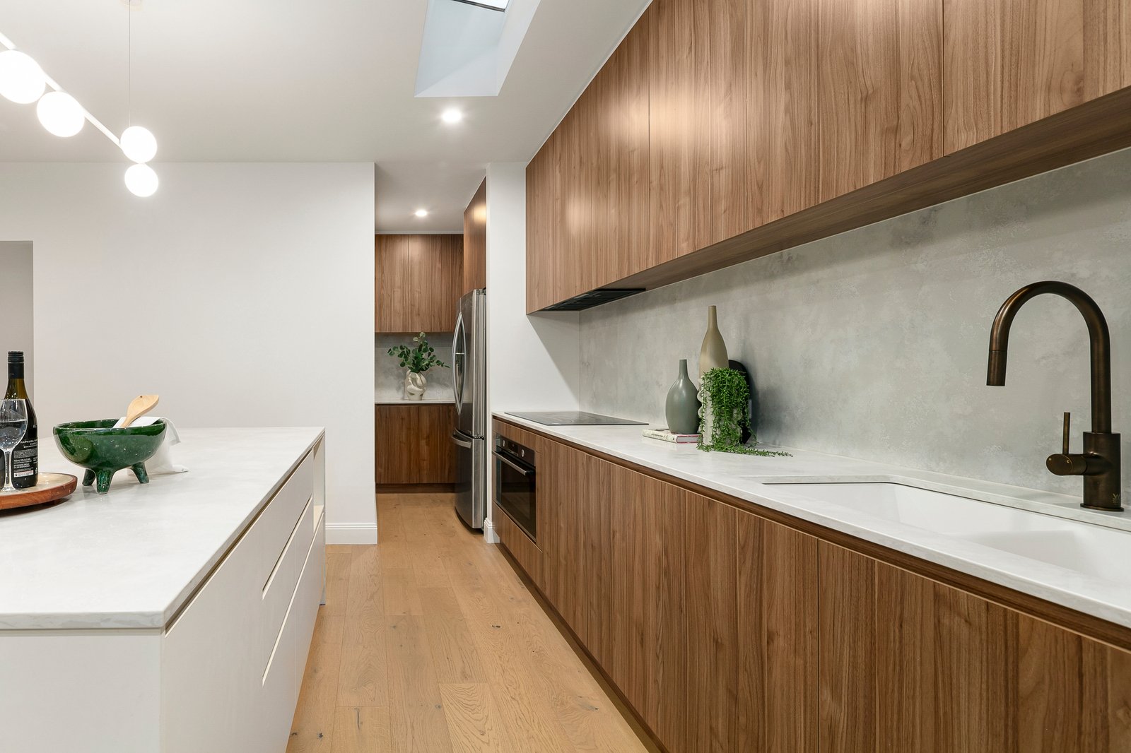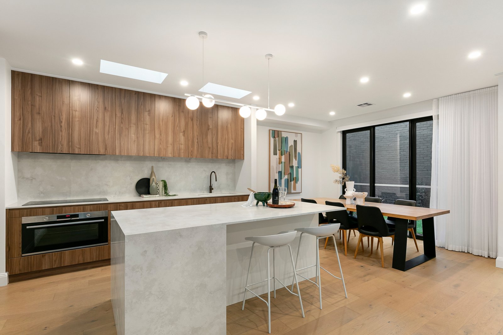The heart of the home is an open-plan kitchen, living and dining domain crafted with exacting detail. Walnut cabinetry paired with stone benchtops and splashbacks creates a palette of refined warmth. Brass tapware and an integrated dishwasher, induction cooktop and under-bench oven meet a walk-in pantry - every element calibrated for style and daily ease.