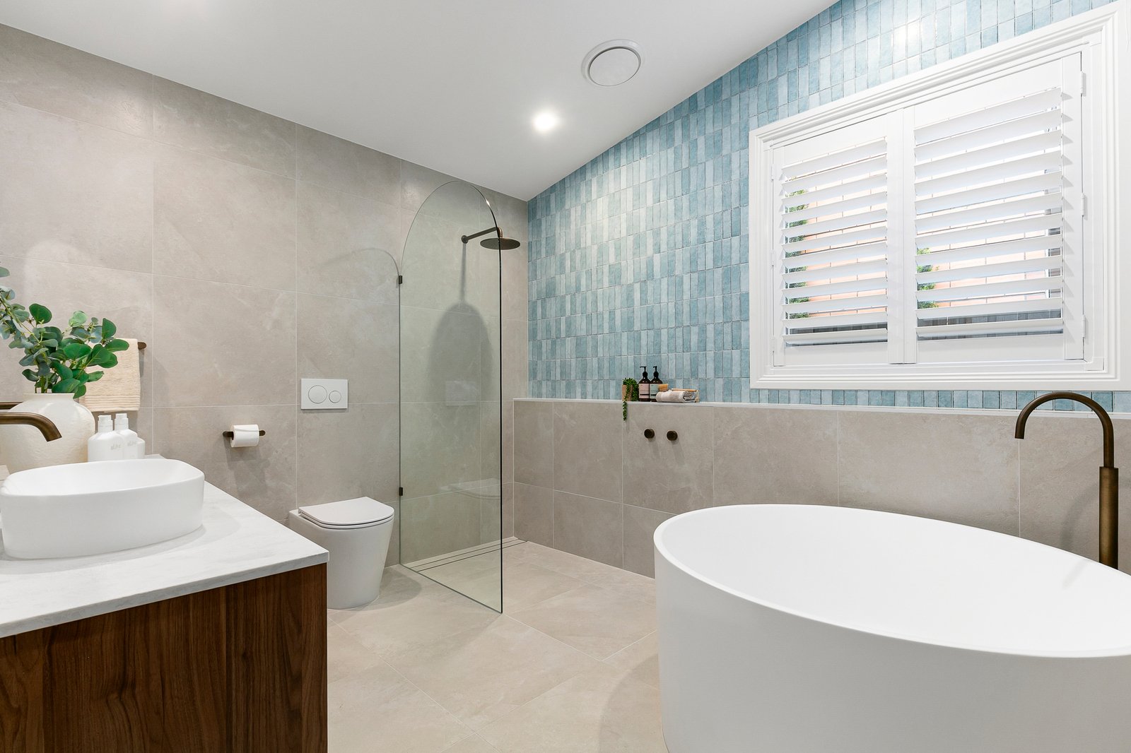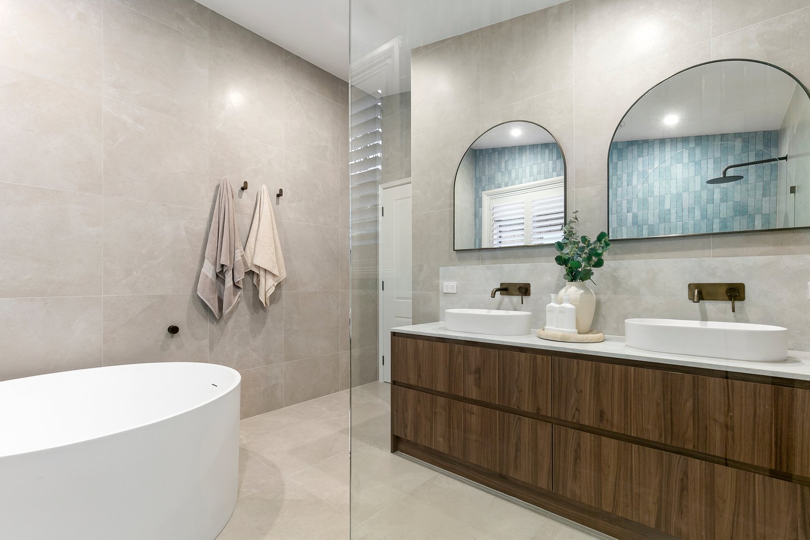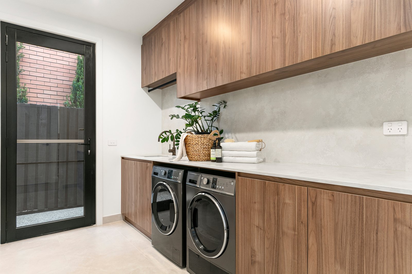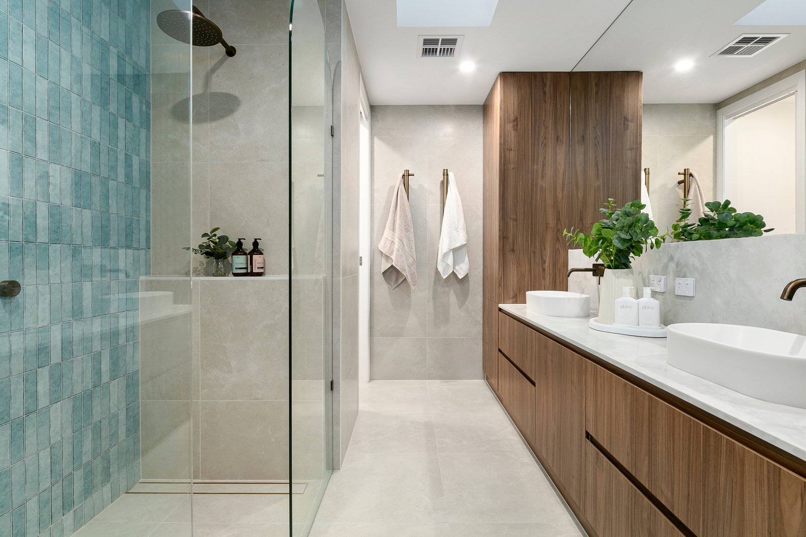 Downstairs, three beautifully proportioned bedrooms sit off a gracious hallway - each with built-in wardrobes and study desks, ideal for family life or flexible working arrangements. The central family bathroom is nothing short of a showstopper; free-standing round bath, dual sinks with white stone tops, wall-to-ceiling grey tiles punctuated by turquoise accents, arch mirrors and brass fixtures - all underpinned by walnut cabinetry that exudes bespoke quality. A full laundry with matching walnut joinery, stone surfaces and external access adds exceptional practicality.