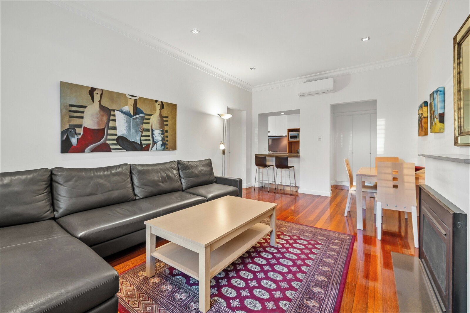 The bright open plan living area is fitted with plantation shutter blinds and a split system heating and cooling unit for year round comfort, while the modern kitchen features a stylish breakfast bar, stone bench tops and ample storage.
