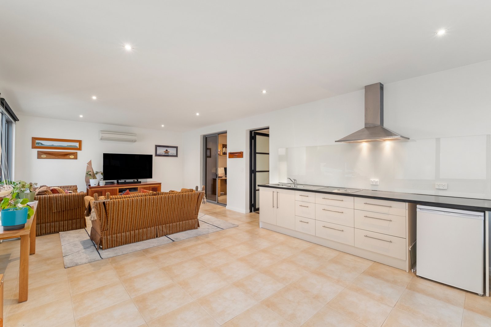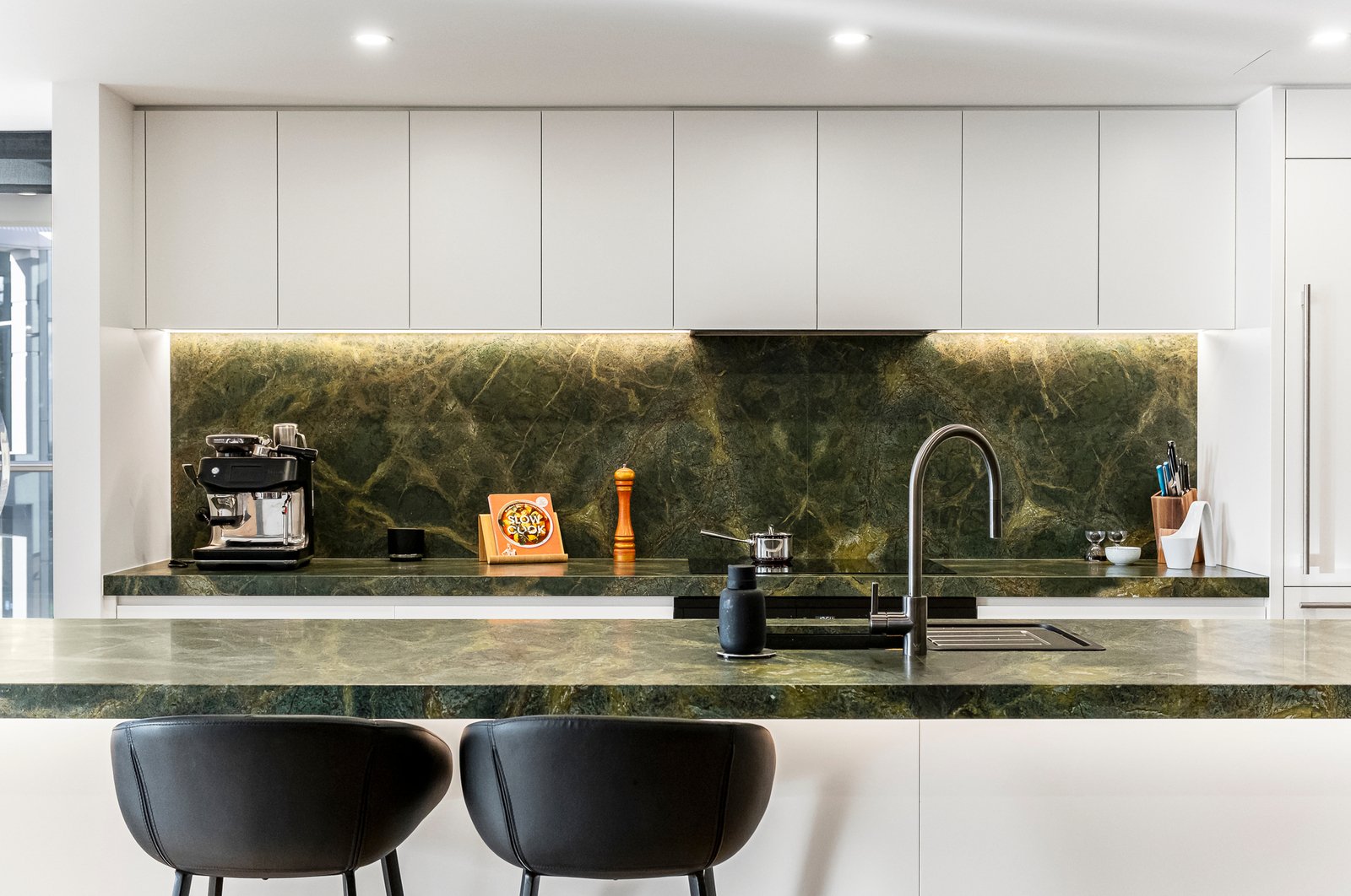 Anchoring the residence, a magnificent as-new kitchen centres on a striking honed-granite island bench inspired by its beachside surrounds. Premium Miele appliances, including a 900mm oven, induction cooktop and dishwasher, pair with integrated Sub Zero refrigeration, while LED-lit granite continues into the full butler’s pantry with Zip tap and extensive custom storage.