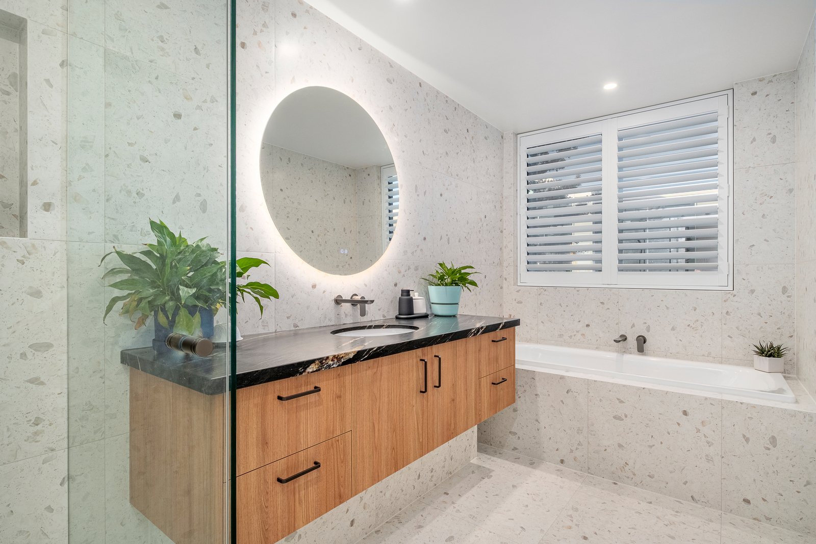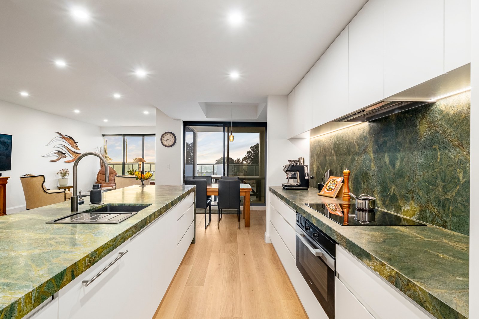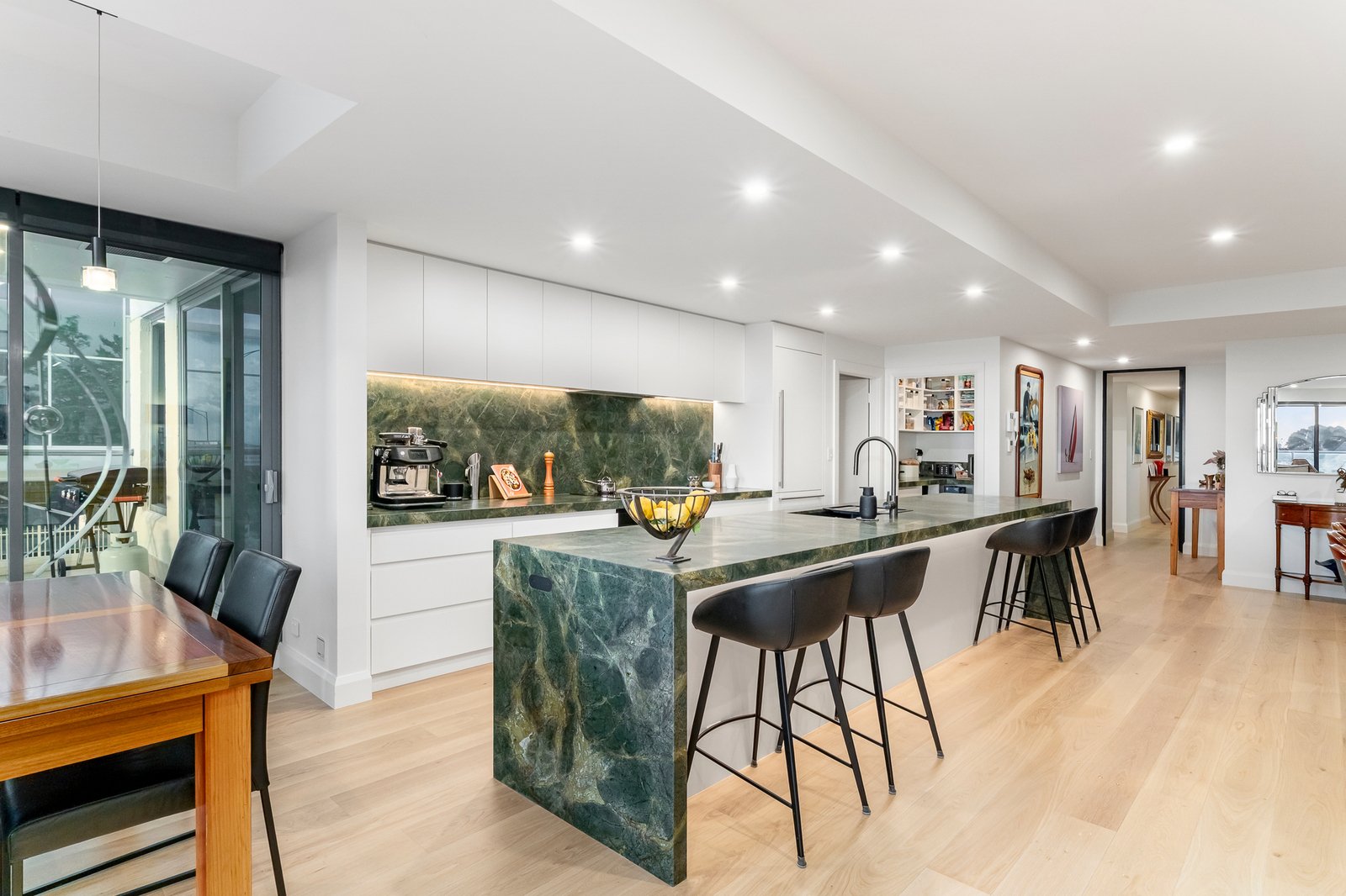 Enjoying peaceful privacy and a beautiful bay outlook, the main suite offers terrace access, bespoke joinery, a walk-in robe and a dual-vanity ensuite with heated towel rail. It is one of two luxuriously reimagined bathrooms showcasing contemporary terrazzo tiles, granite surfaces and dual rain showers. A guest powder room and generous laundry reflect the same level of thoughtful design.