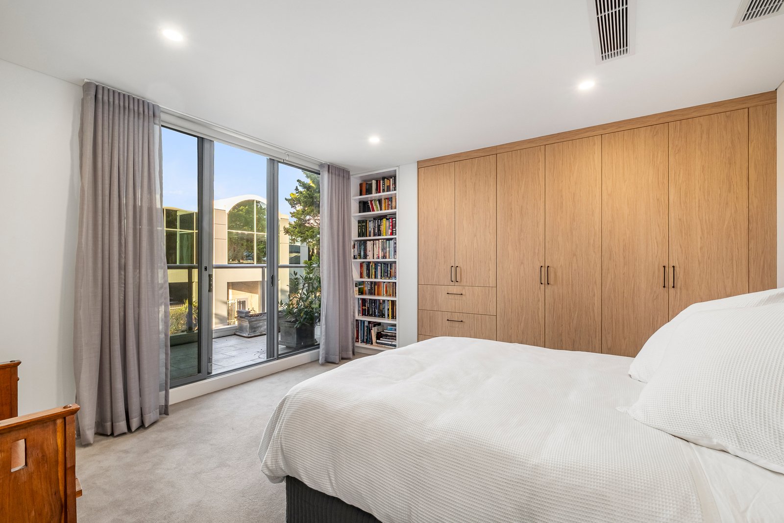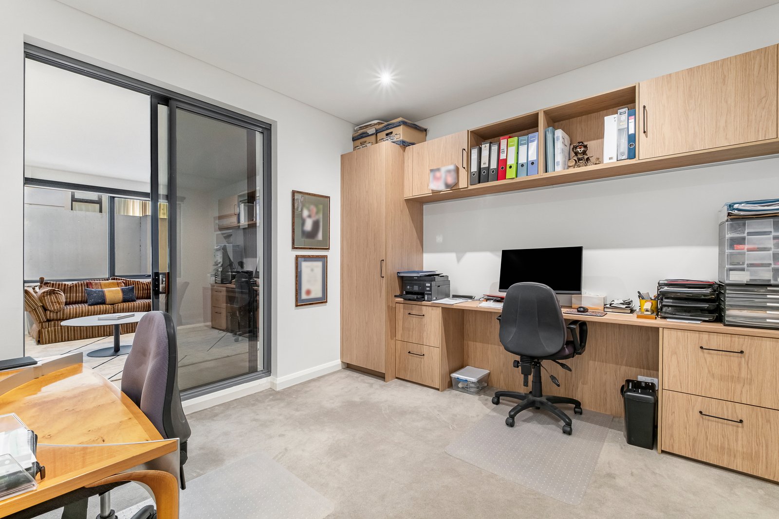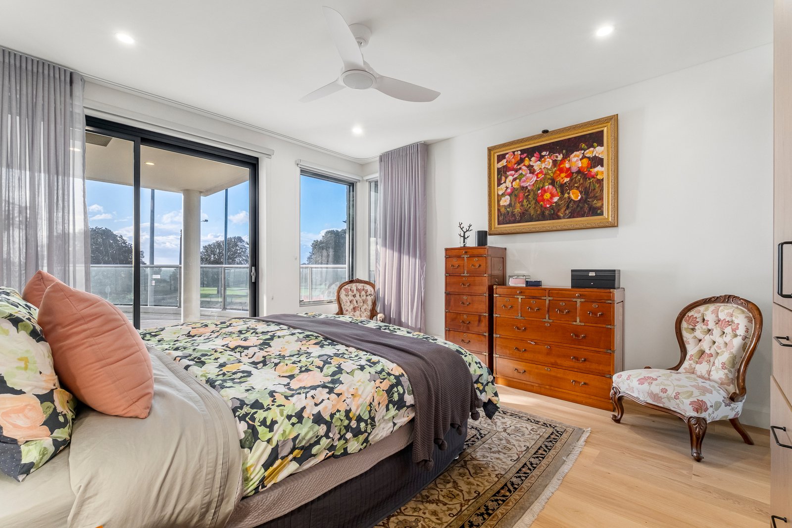 Three additional bedrooms enhance flexibility, two with built-in robes opening to a north-facing balcony, and one custom-fitted as a study or optional fourth bedroom. A substantial second living zone, filled with natural light and complete with kitchenette/bar, offers the ideal retreat for family living and guests. Sought-after extras include a utility room, wide-board oak floors, auto-blinds (living), sheers and individually zoned ducted heating and cooling.