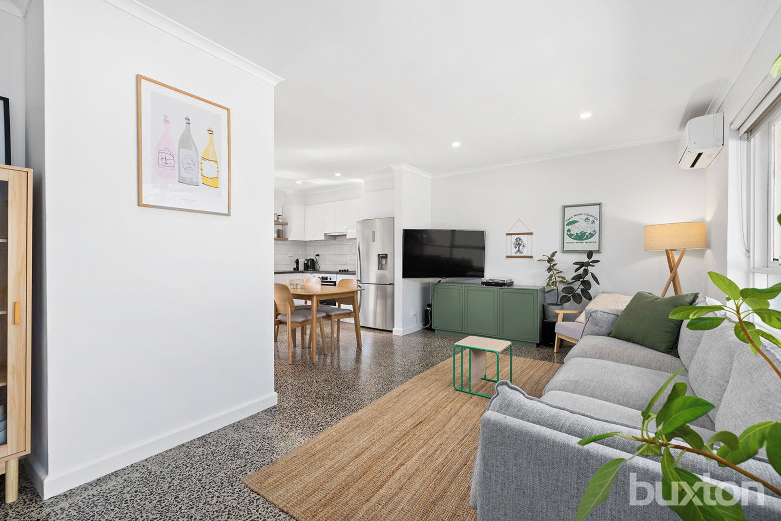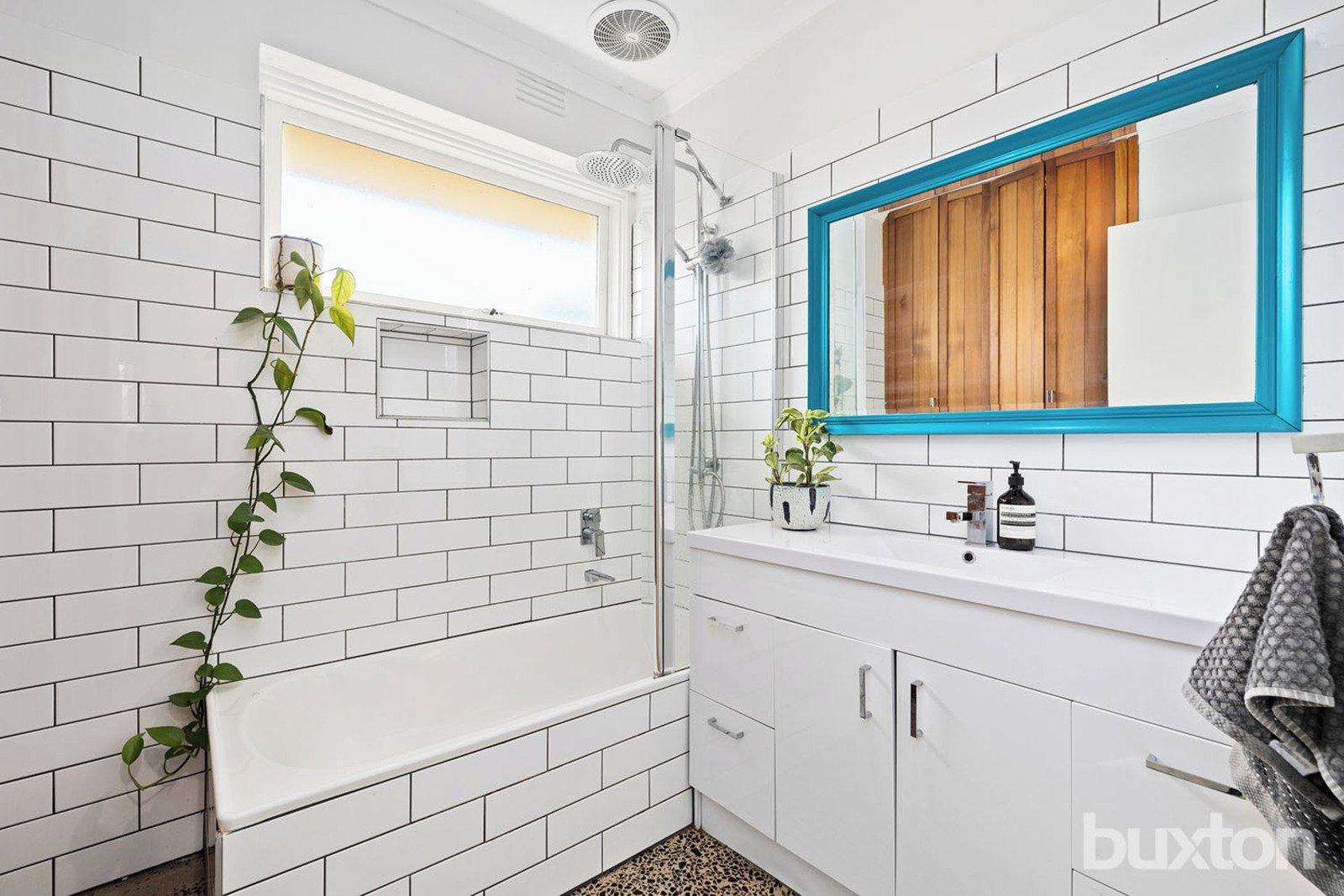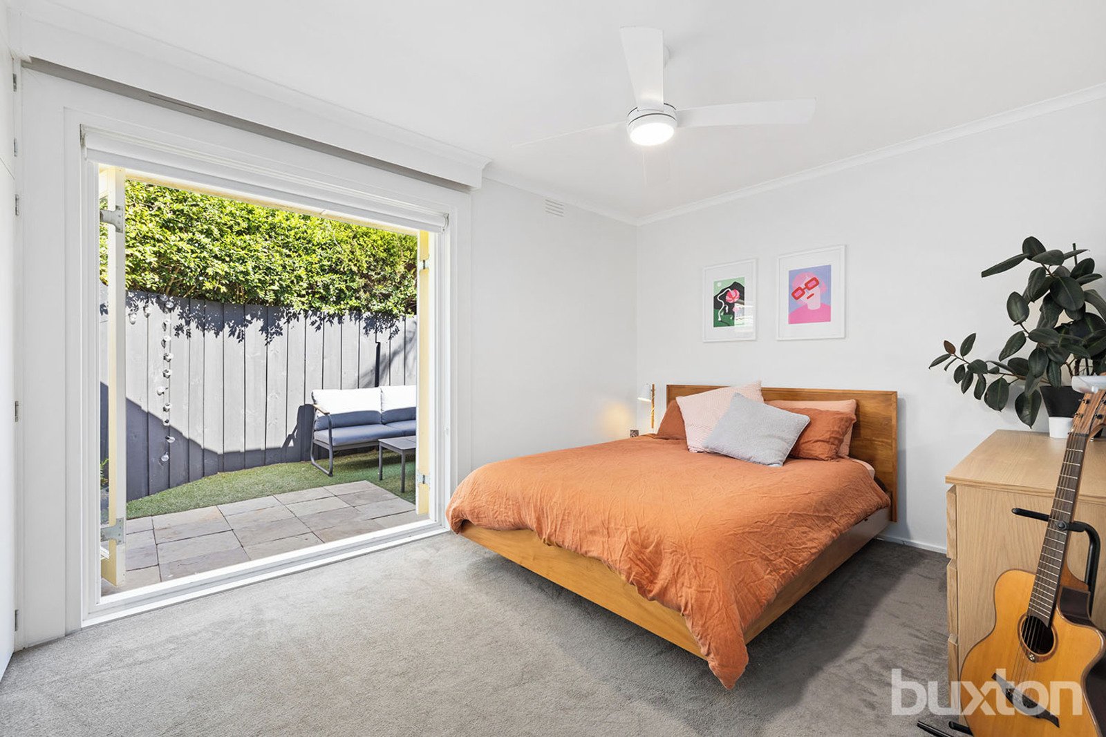 Both bedrooms are well-sized, with the main bedroom featuring French doors to a small private garden. The bathroom includes subway tiles and terrazzo-style flooring, and the laundry is neatly concealed behind cedar doors.