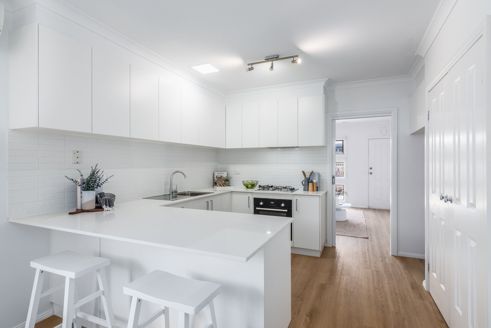 The home then opens into a generous, sunlit open-plan kitchen, dining and second living zone. The kitchen is well-appointed space showcases stone benchtops, a Bosch oven and cooktop, and a Fisher & Paykel double DishDrawer. Glass sliding doors lead out to a spacious, sun-soaked deck overlooking a leafy backdrop—perfect for entertaining, unwinding or enjoying the garden without the maintenance.