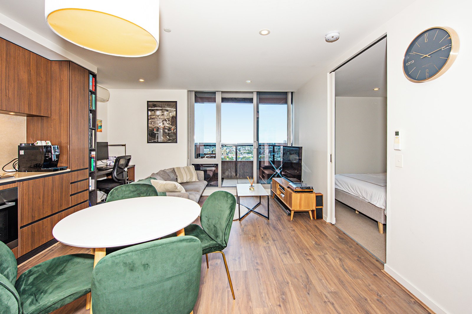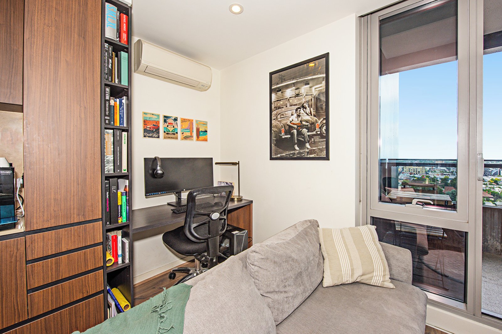 Offering quality features throughout, the home’s light filled interior boasts one bedroom with mirrored built in robes, a study nook within the living space and a sleek central bathroom. Add to this an open plan lounge/dining area with a sleek adjoining kitchen. This spotless kitchen features stone benchtops, timber cabinetry, stainless steel cooking appliances and a dishwasher.