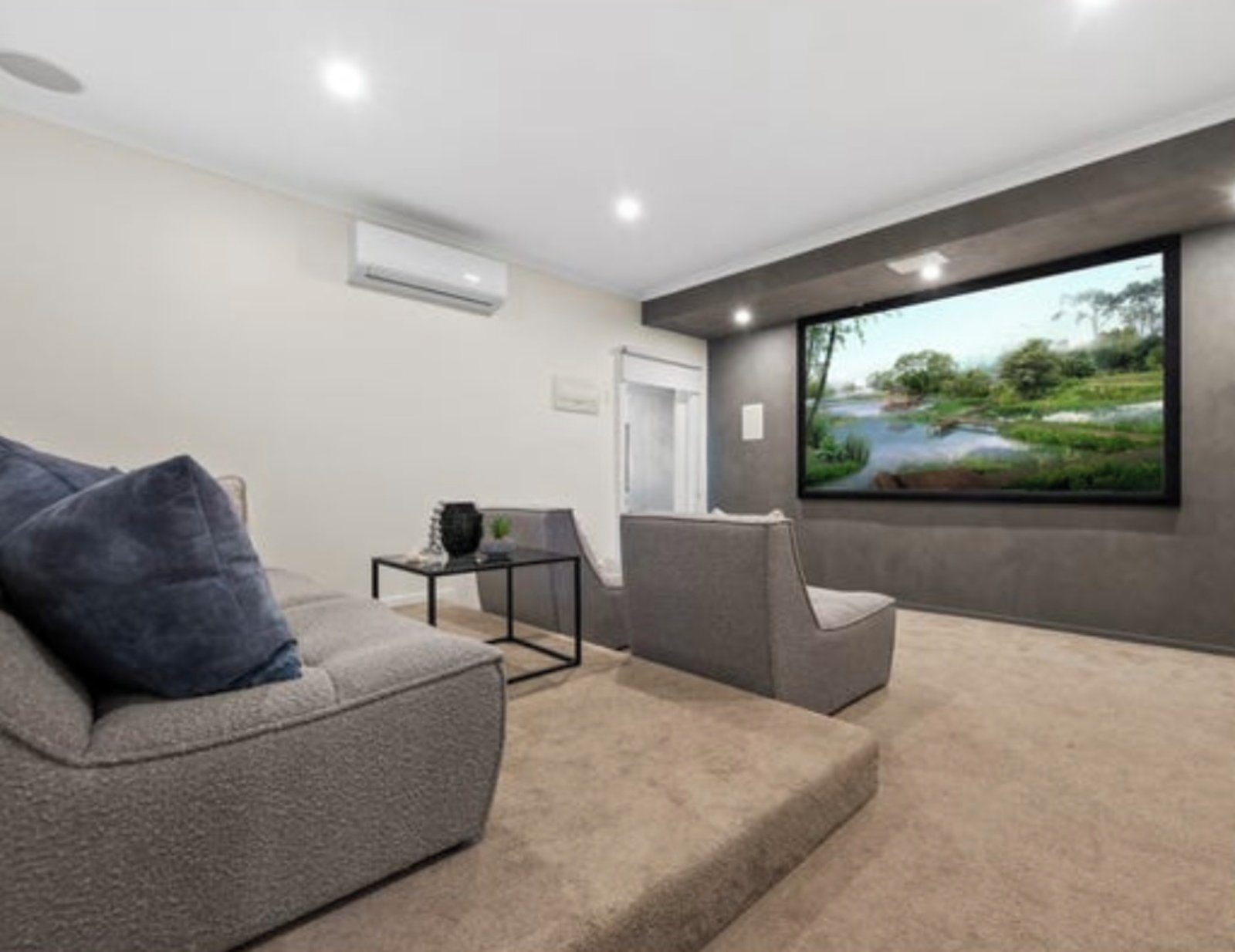 At the heart of the home, the entertainer’s kitchen is a standout — featuring stone benchtops, a breakfast bar, extensive storage, and a full suite of premium Westinghouse appliances including three ovens, gas cooktop, microwave, and dishwasher. A servery window opens directly to the pool area, creating an effortless indoor–outdoor flow ideal for busy households and weekend entertaining. The adjoining sunlit dining area and sky-lit living room, complete with a gas fireplace, form inviting everyday gathering spaces, while a separate theatre room offers a quiet sanctuary for movie nights or children’s downtime.
