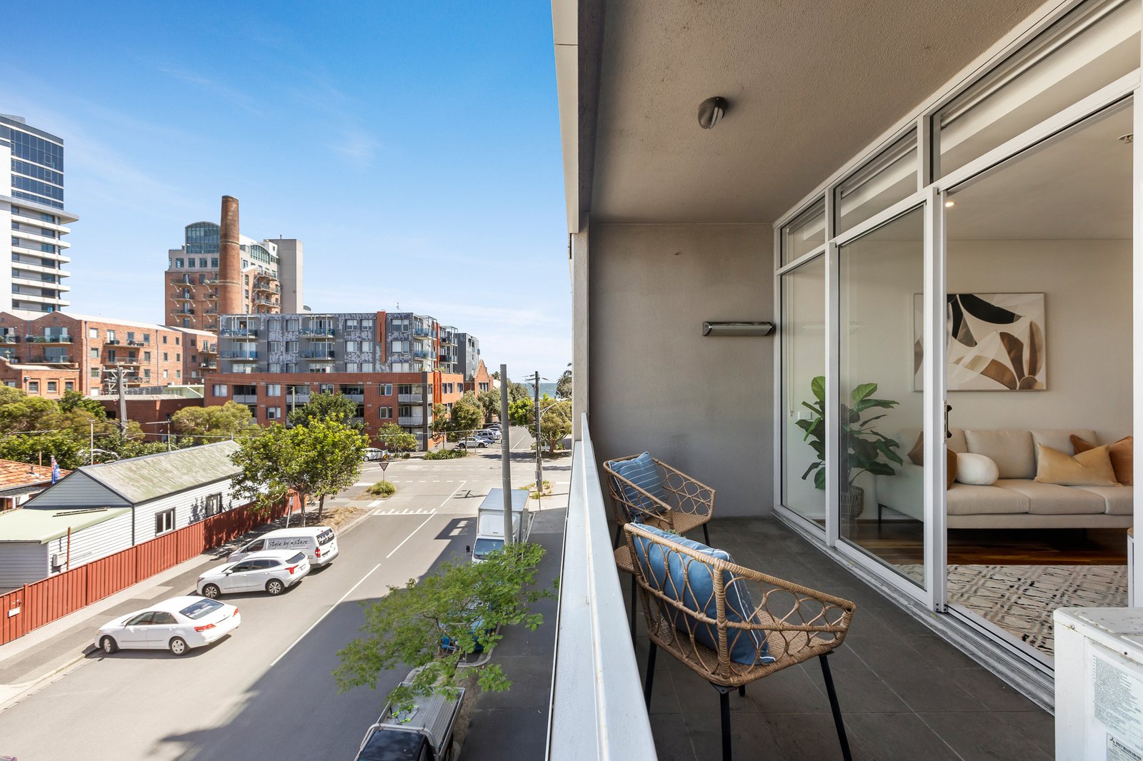 The light-filled interior boasts generous open-plan living and dining, complemented by warm timber floors and flowing seamlessly to a private balcony with views across Port Melbourne’s iconic streetscape and glimpses of the bay. The kitchen is both stylish and functional, featuring stone benchtops and gas cooking, while the sleek central bathroom includes convenient laundry facilities and reinforces the home’s contemporary feel. Two bedrooms with built-in robes provide comfortable and peaceful accommodation.