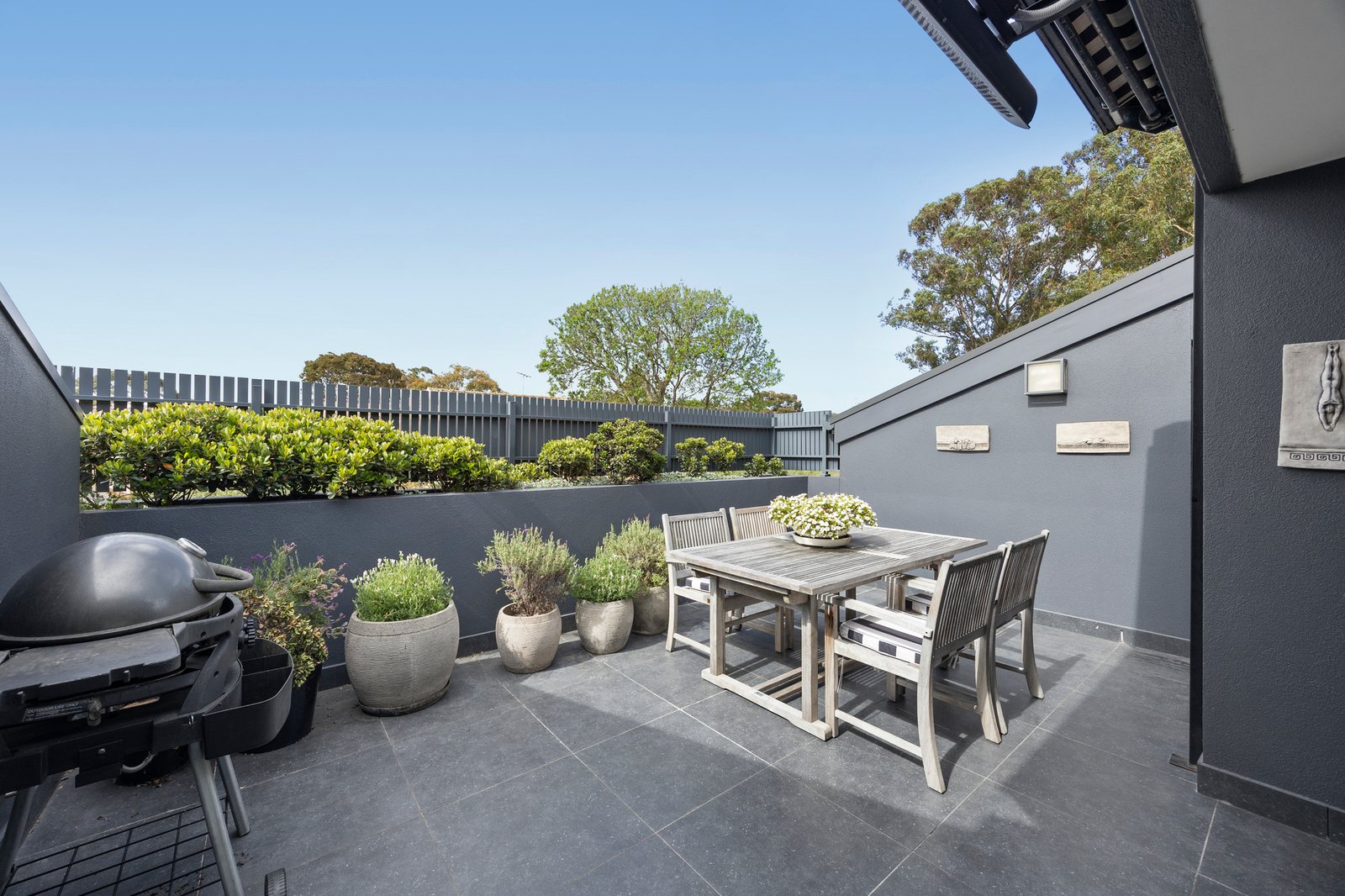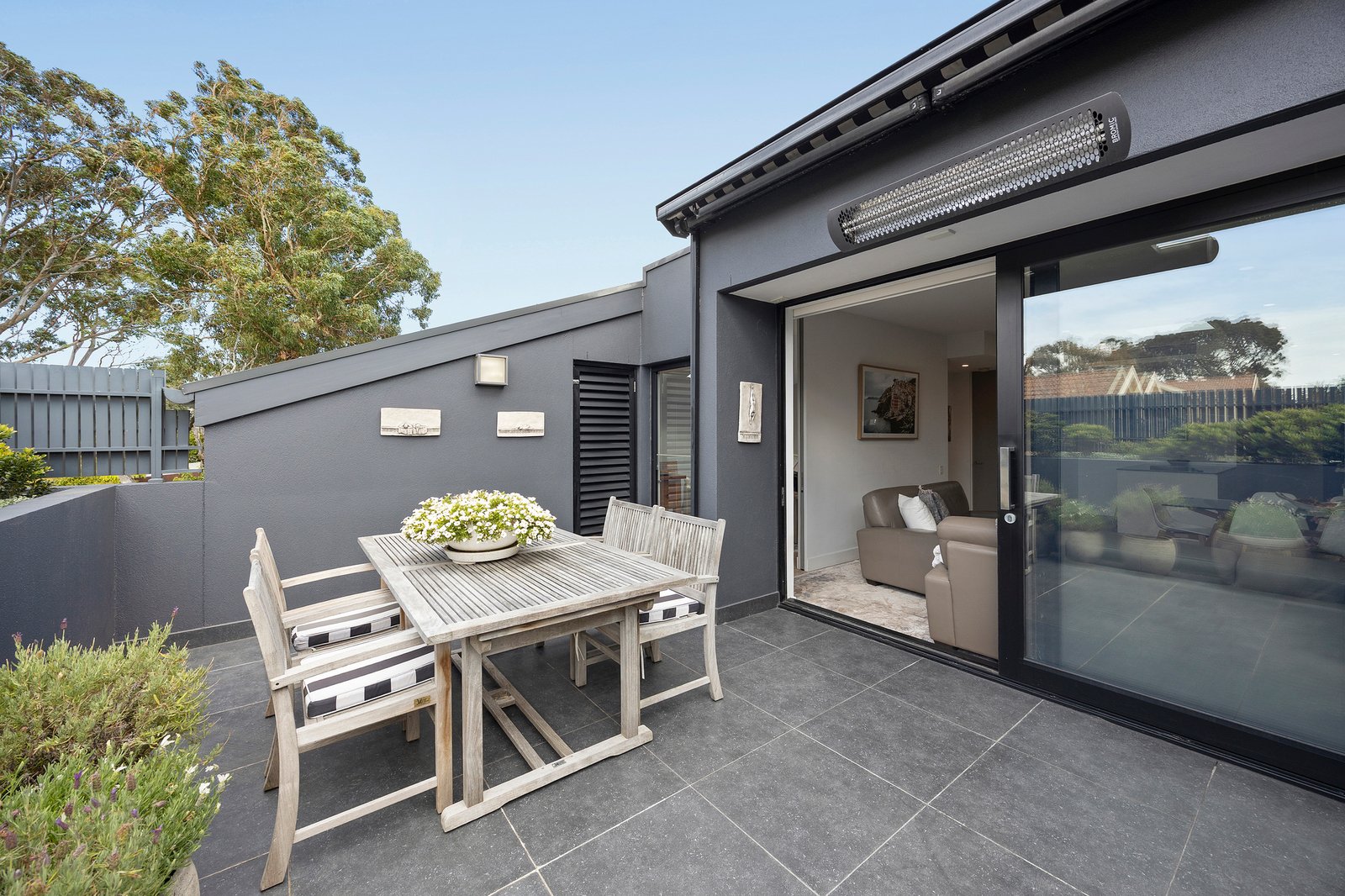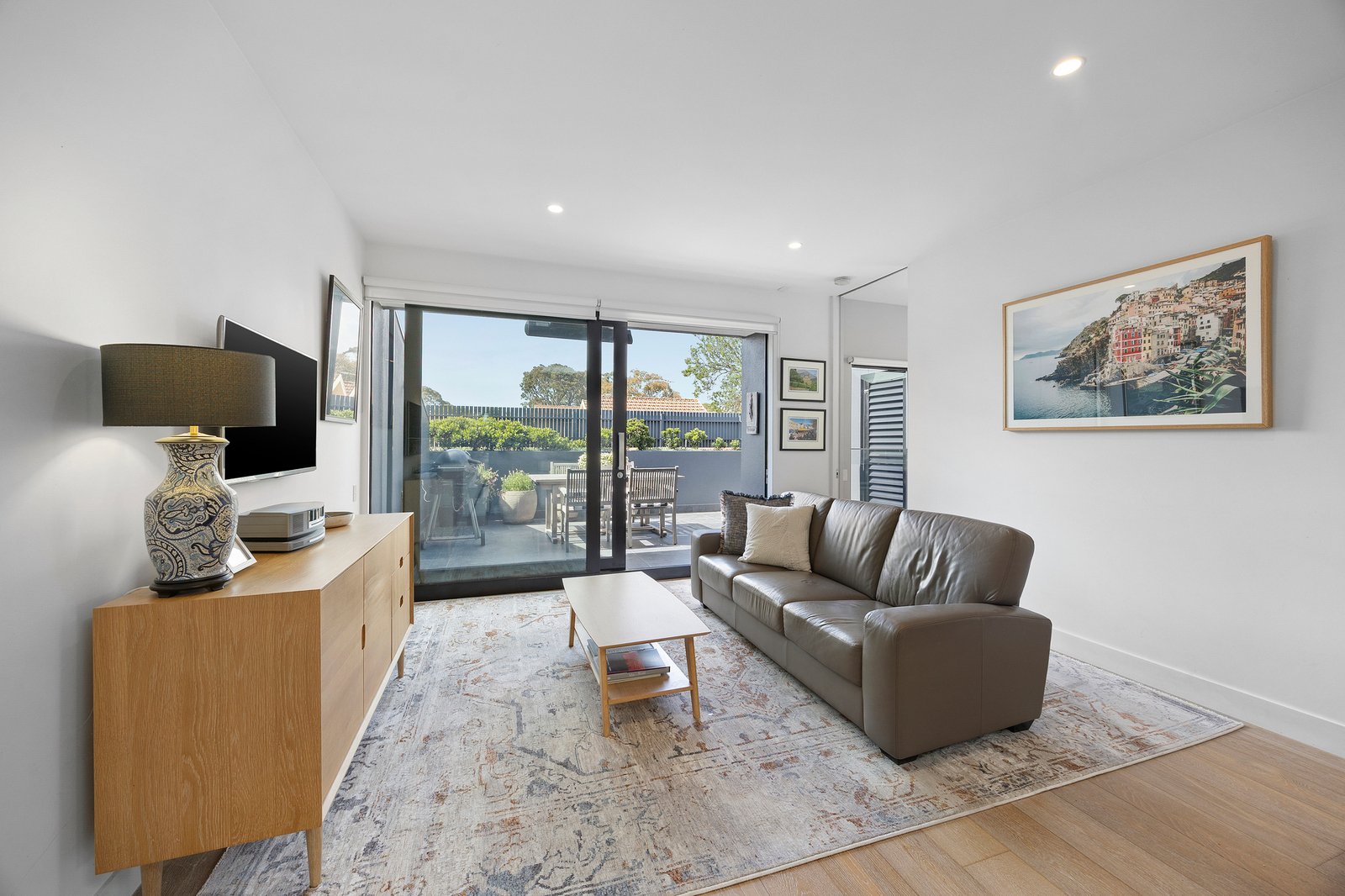 A wall of sliding glass extends the interiors to a broad balcony terrace, an elegant setting for unhurried evenings and effortless al fresco entertaining, enhanced by an electric awning and outdoor heating for year-round enjoyment.