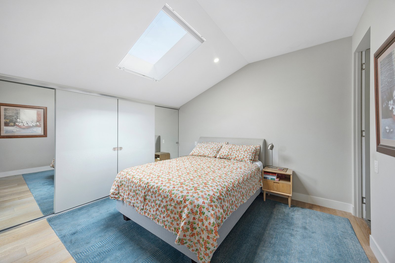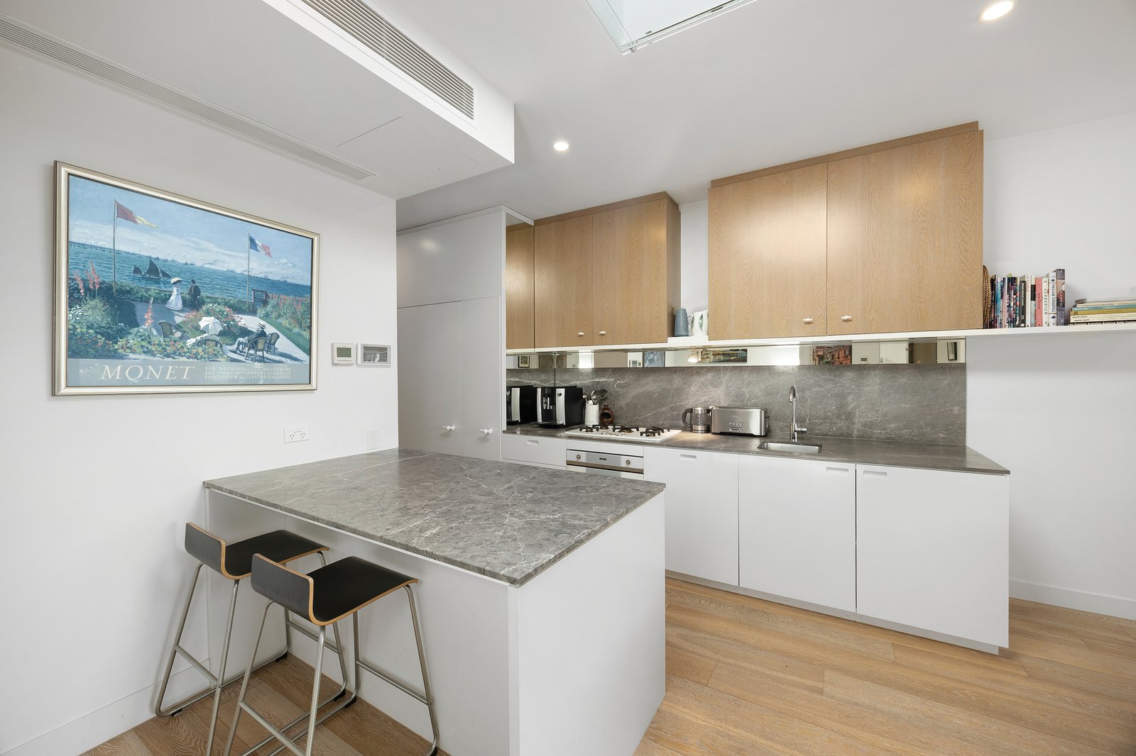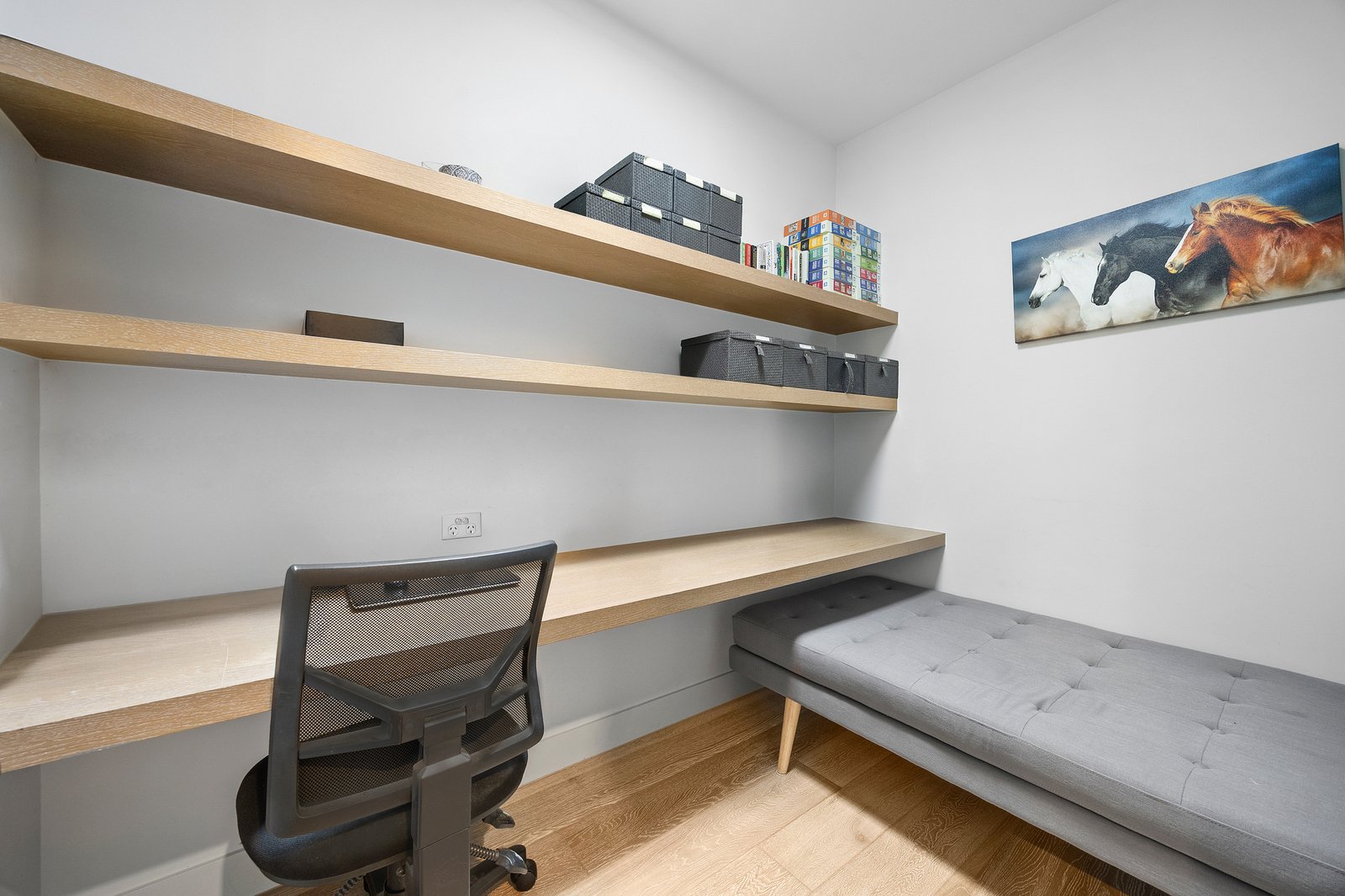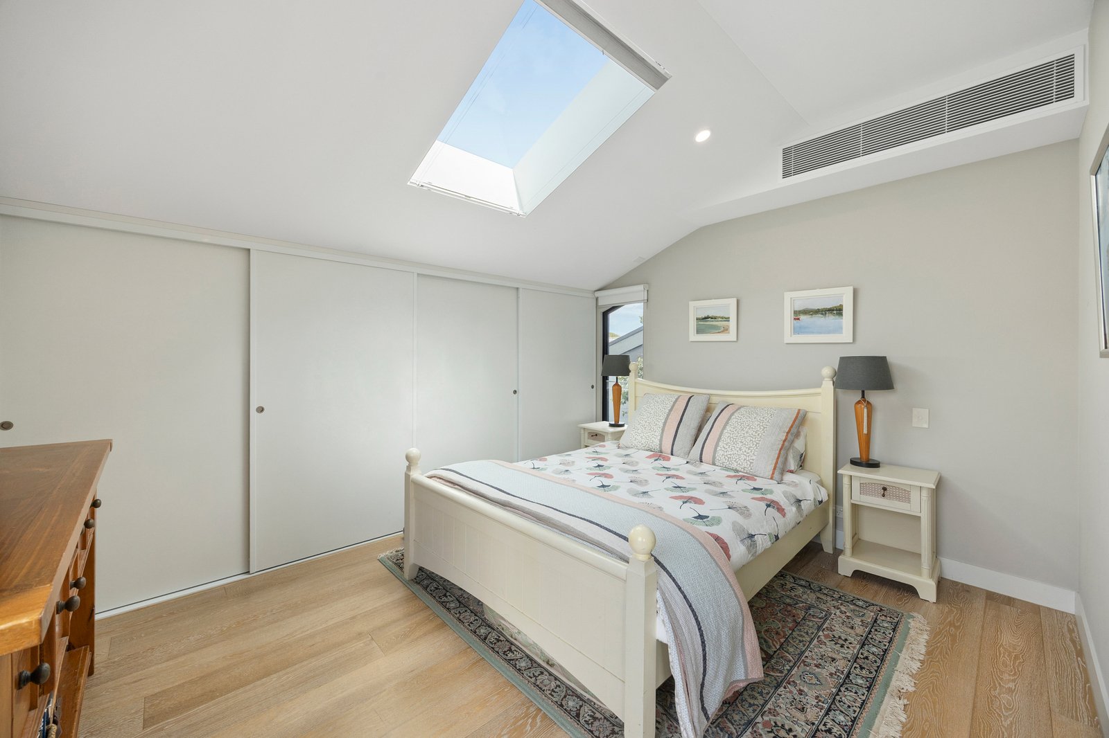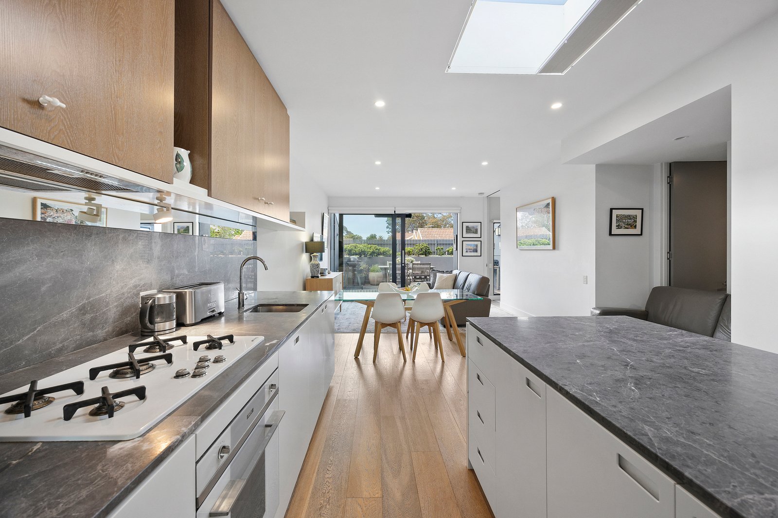 Inside, skylights positioned throughout the home draw natural light deep into the interiors, illuminating wide engineered oak floors and a thoughtfully designed home office with built-in desk and shelving. A generous Euro laundry is cleverly concealed to maintain the home’s seamless aesthetic.