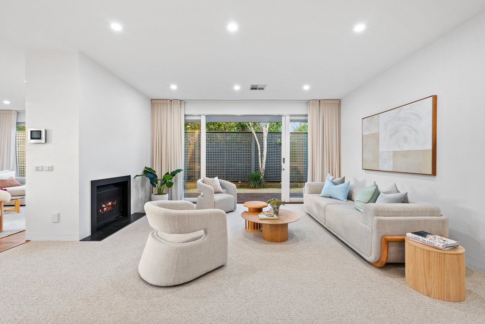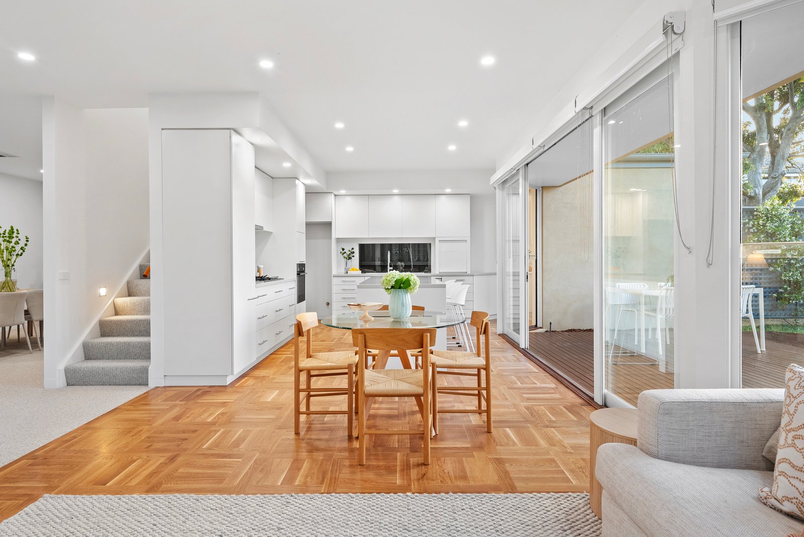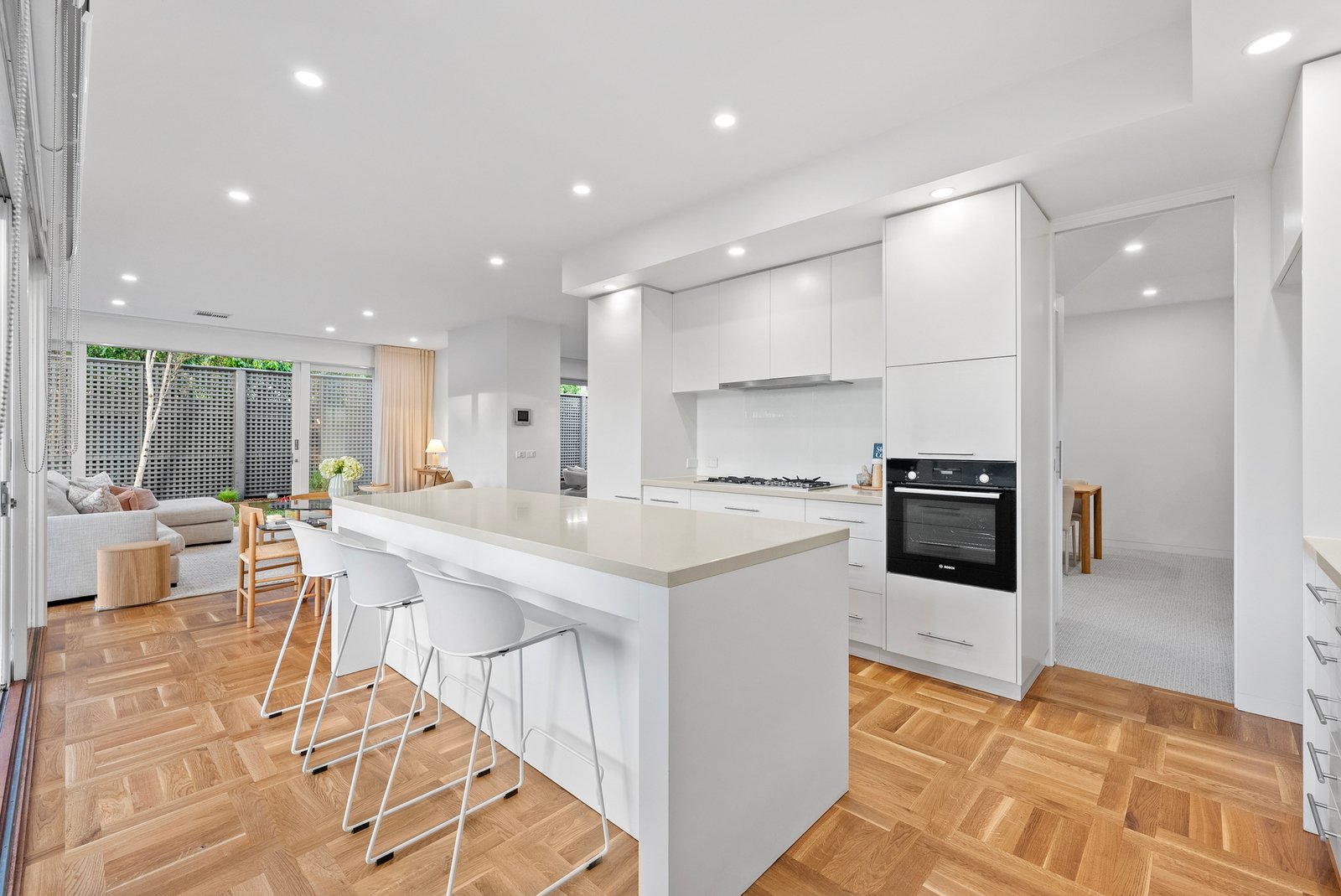 The informal living domain continues the home's stunning aesthetic, merging with a stone-topped Bosch kitchen and breakfast bar. Parquetry floors introduce warmth and continuity, while the space opens to an expansive al fresco deck framed by picturesque greenery - an idyllic backdrop for memorable and unhurried gatherings.