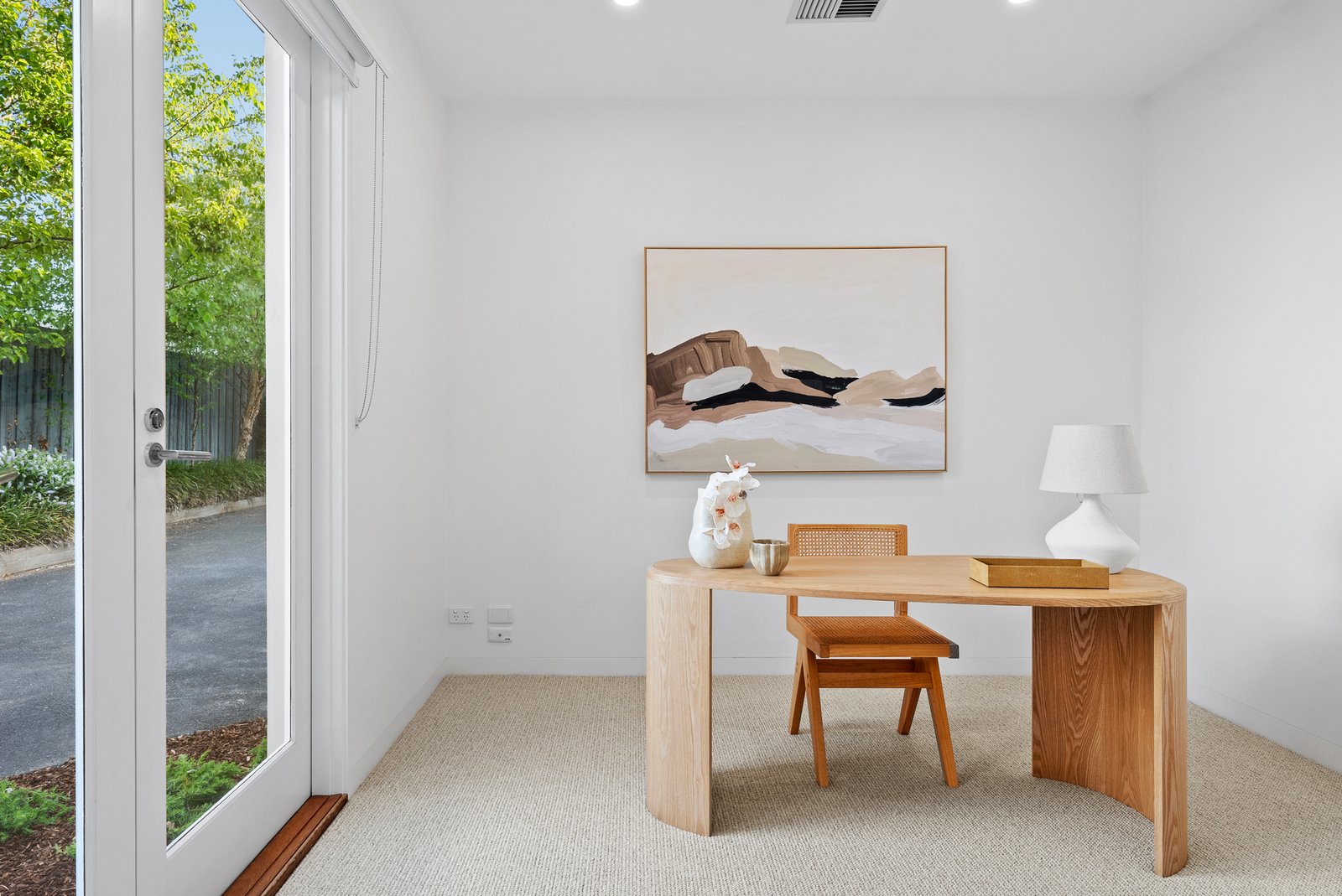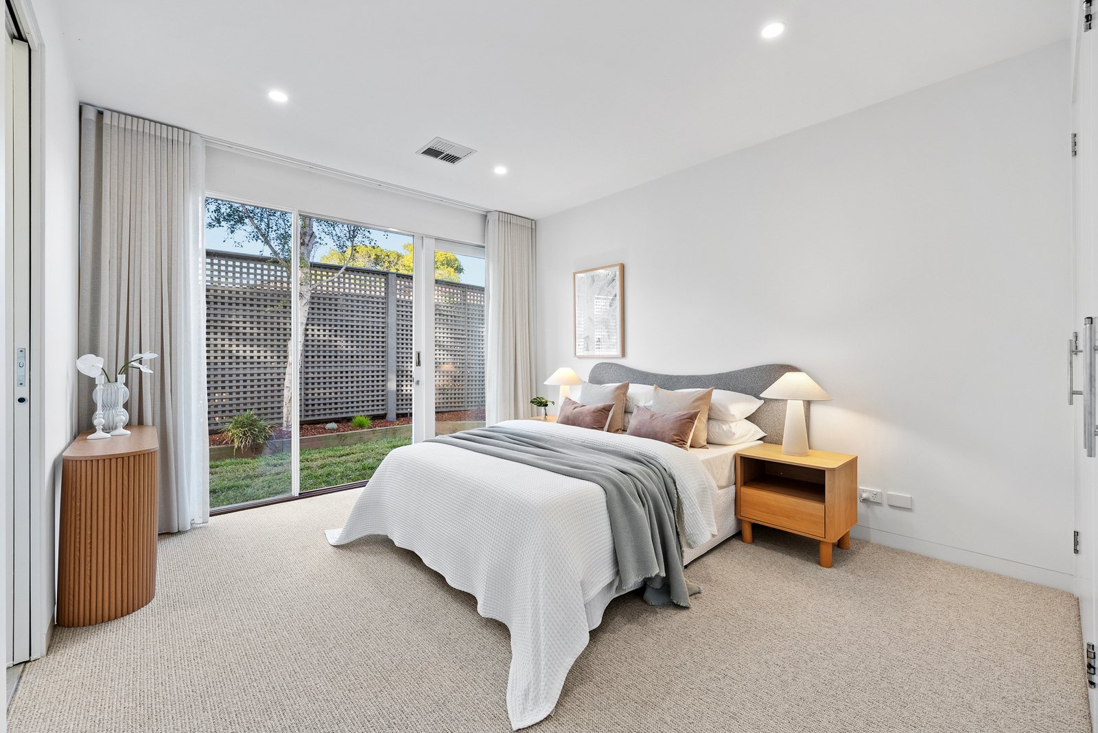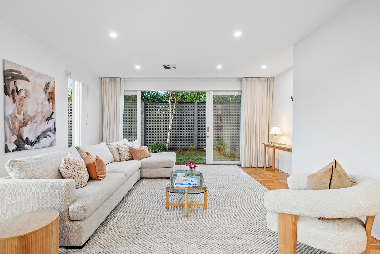The informal living domain continues the home's stunning aesthetic, merging with a stone-topped Bosch kitchen and breakfast bar. Parquetry floors introduce warmth and continuity, while the space opens to an expansive al fresco deck framed by picturesque greenery - an idyllic backdrop for memorable and unhurried gatherings.