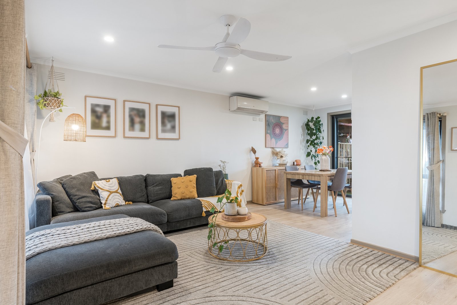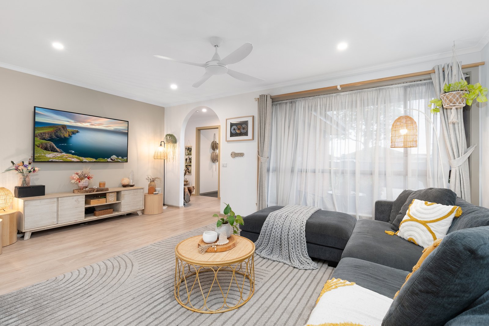 - Light filled lounge with floating floorboards flowing through the main spaces of the home
