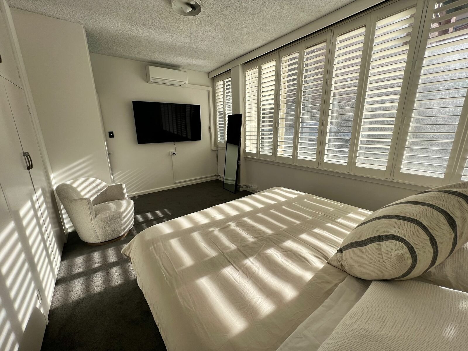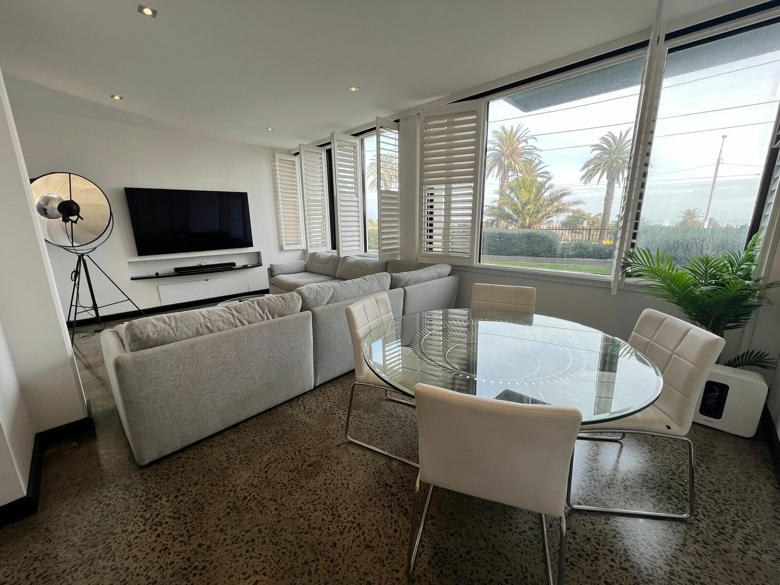 · Expansive open-plan living and dining showcasing polished concrete floors, split-system heating and cooling, and stunning bay and Palais Theatre views.