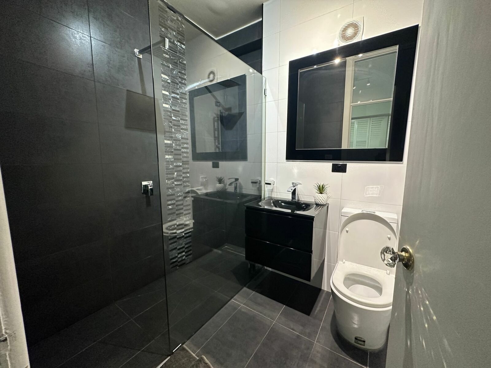 · Two stylish bathrooms with floor-to-ceiling tiles, one featuring a double rainfall shower and the other with shower over bath.