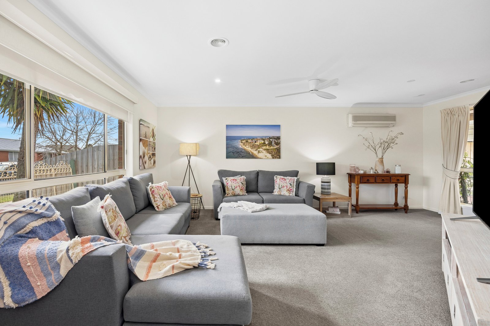 - Light‑filled living room featuring ceiling fan, split system heating and cooling for year-round comfort