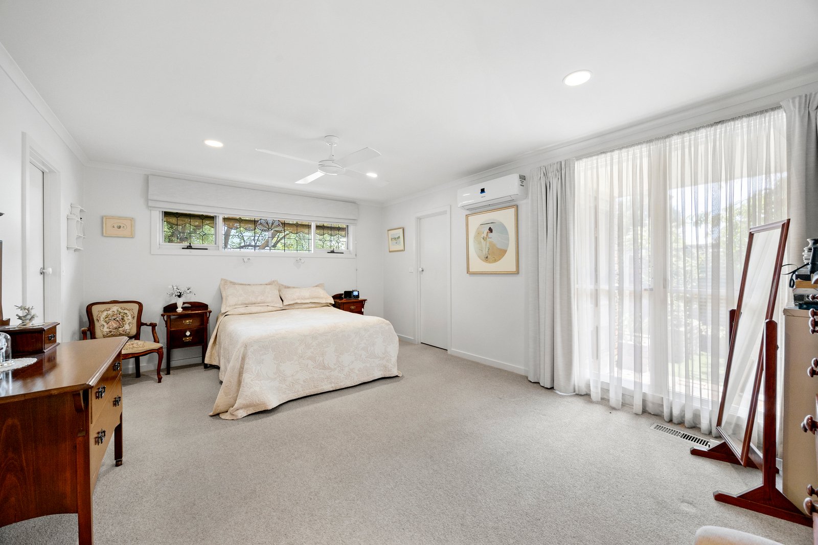 Accommodation includes two oversized bedrooms, each with its own ensuite. The main bedroom is exceptionally generous, featuring two walk-in robes, while large windows throughout capture tranquil garden aspects and reinforce the home’s secluded setting.