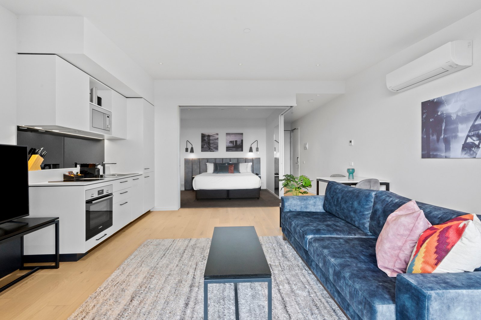 The luxury bedroom is positioned centrally within the apartment and can be completely opened up to the living or closed off via a series of stacker doors to provide peace and privacy when required. The stunning bathroom is spacious and light, featuring floor-to-ceiling tiles, terrazzo style feature wall, modern vanity with stone benchtop and high-quality fittings and tapware. A European laundry completes the functional floorplan making excellent use of the space.