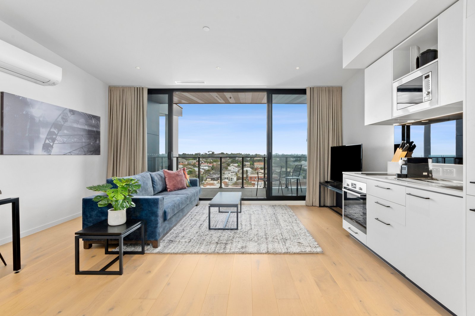 Beautifully restored, the original section of the building forms the foyer and R-Café, providing a welcoming and secure entry into the building. Entering the apartment, you are immediately drawn down the hallway to the majestic view to the east and out to the glistening bay. The considered plan has the open plan living, dining and kitchen area effortlessly connecting with the balcony via floor-to-ceiling glass sliders and taking in the picturesque outlook at every opportunity. The sleek kitchen features quality cabinetry, striking black glass splashback, stone bench tops, integrated dishwasher, Bosch oven and electric cook top.