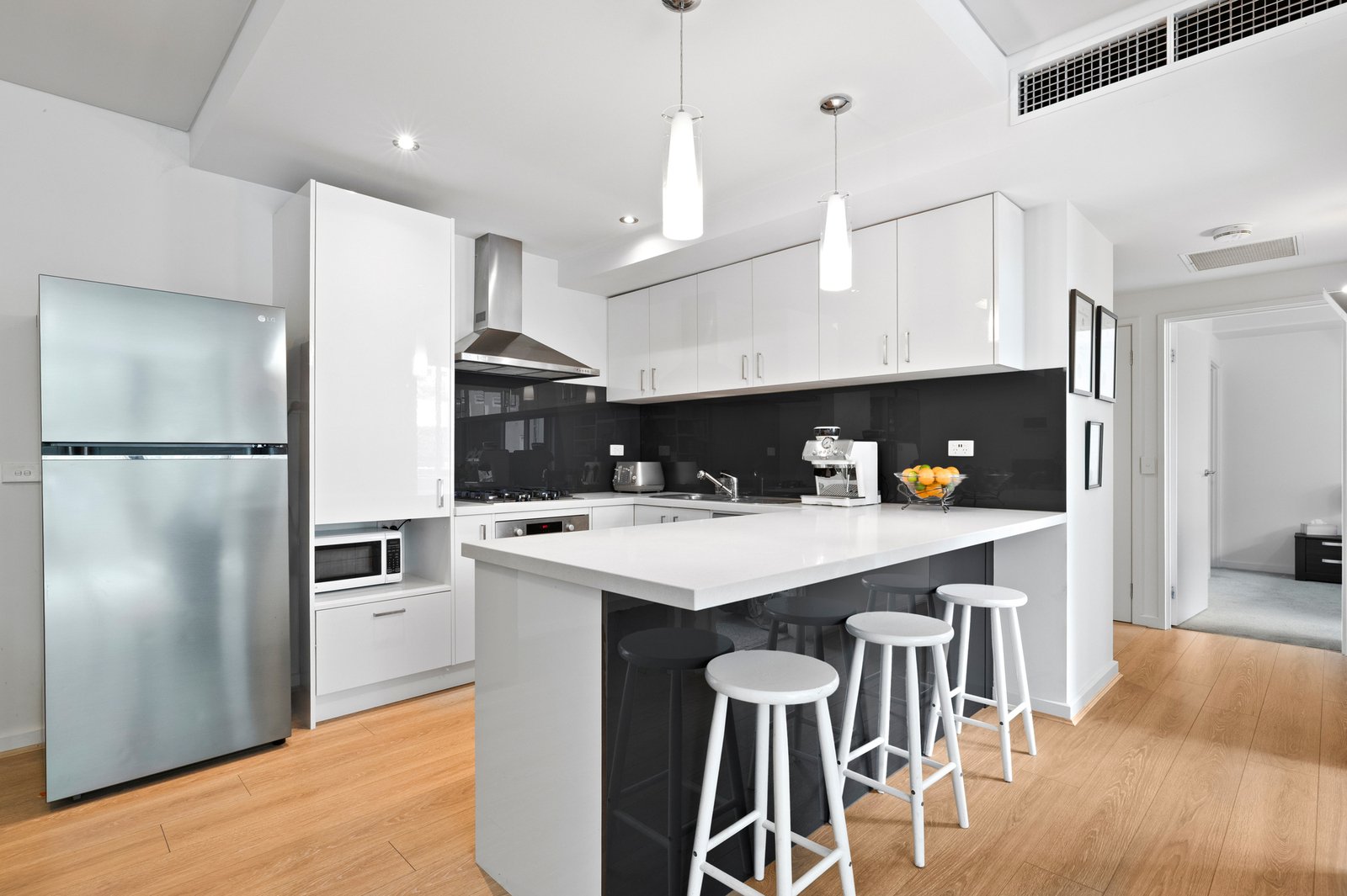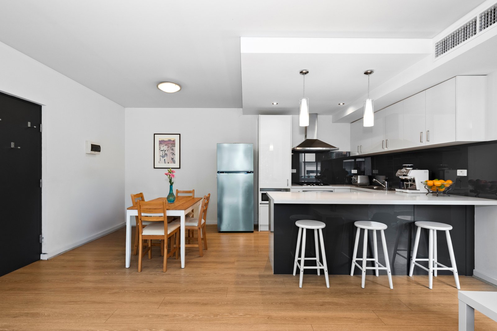 A bright open plan living and dining area, filled with natural light, flows seamlessly onto a private balcony. The fully appointed kitchen features stone benches, quality appliances, and a smart layout with ample bench and cupboard space.