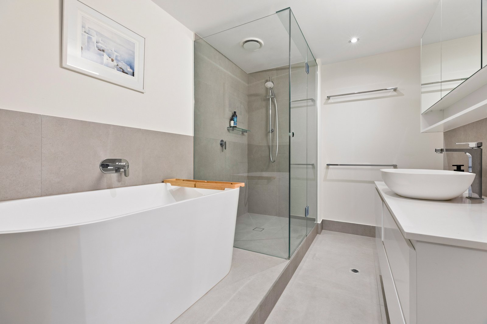 Both bedrooms are generously sized, with built-in robes and ceiling fans. The main bedroom has direct access to the main bathroom, which includes a walk-in shower, separate bathtub, and modern vanity with mirrored cabinets. A powder room and a well-designed laundry with bench and cupboard storage add functionality.