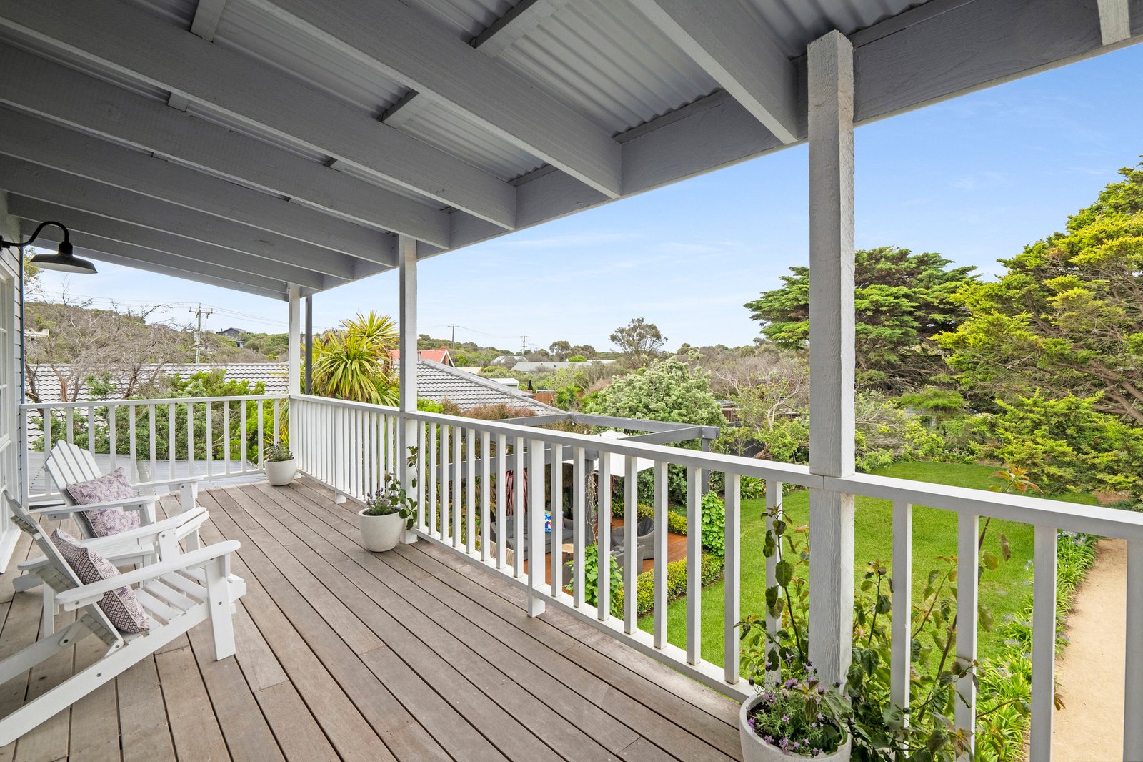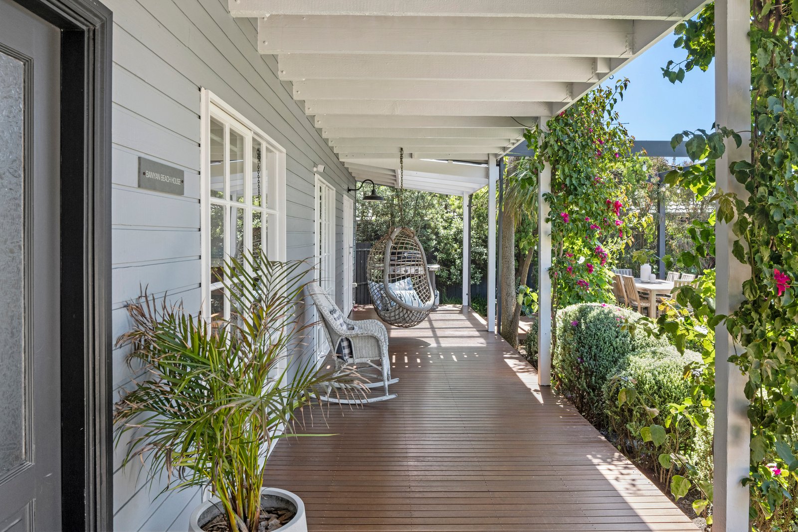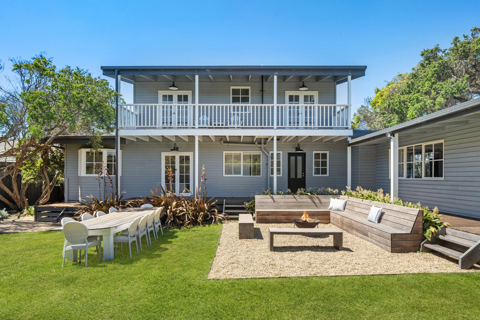 Secure gates introduce layered landscaping and a crisp weatherboard facade, where a restrained Hamptons influence is quietly expressed through decks and balconies on either side. A firepit set within the front garden creates an additional outdoor gathering point among the native gardens, reinforcing the home’s relaxed, open-air orientation.