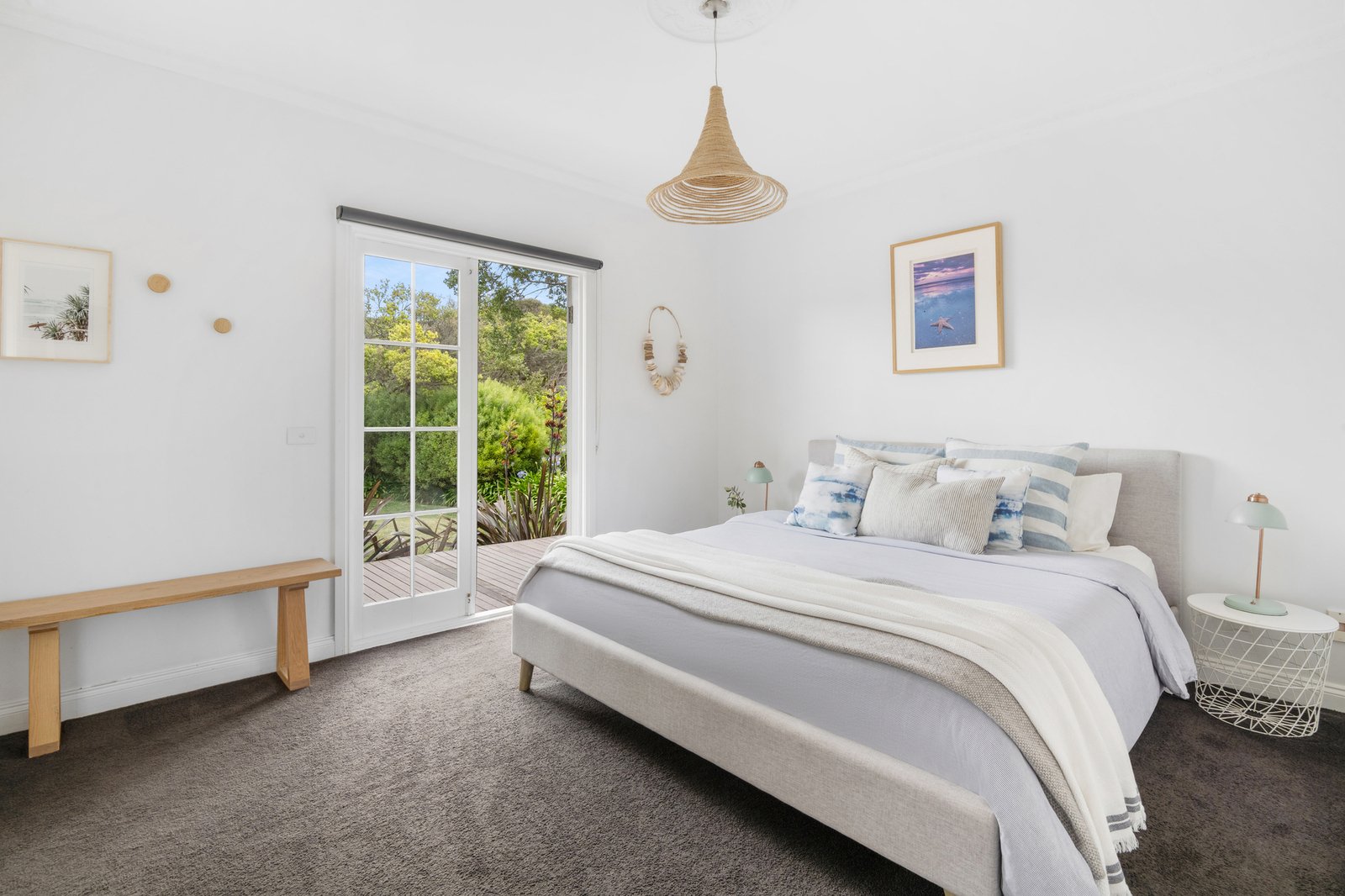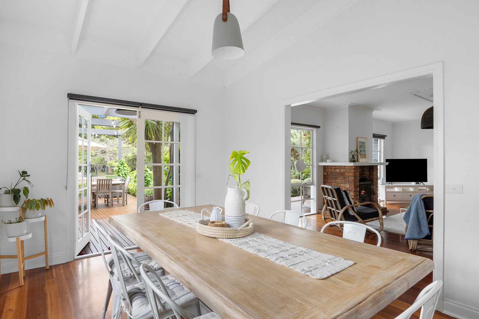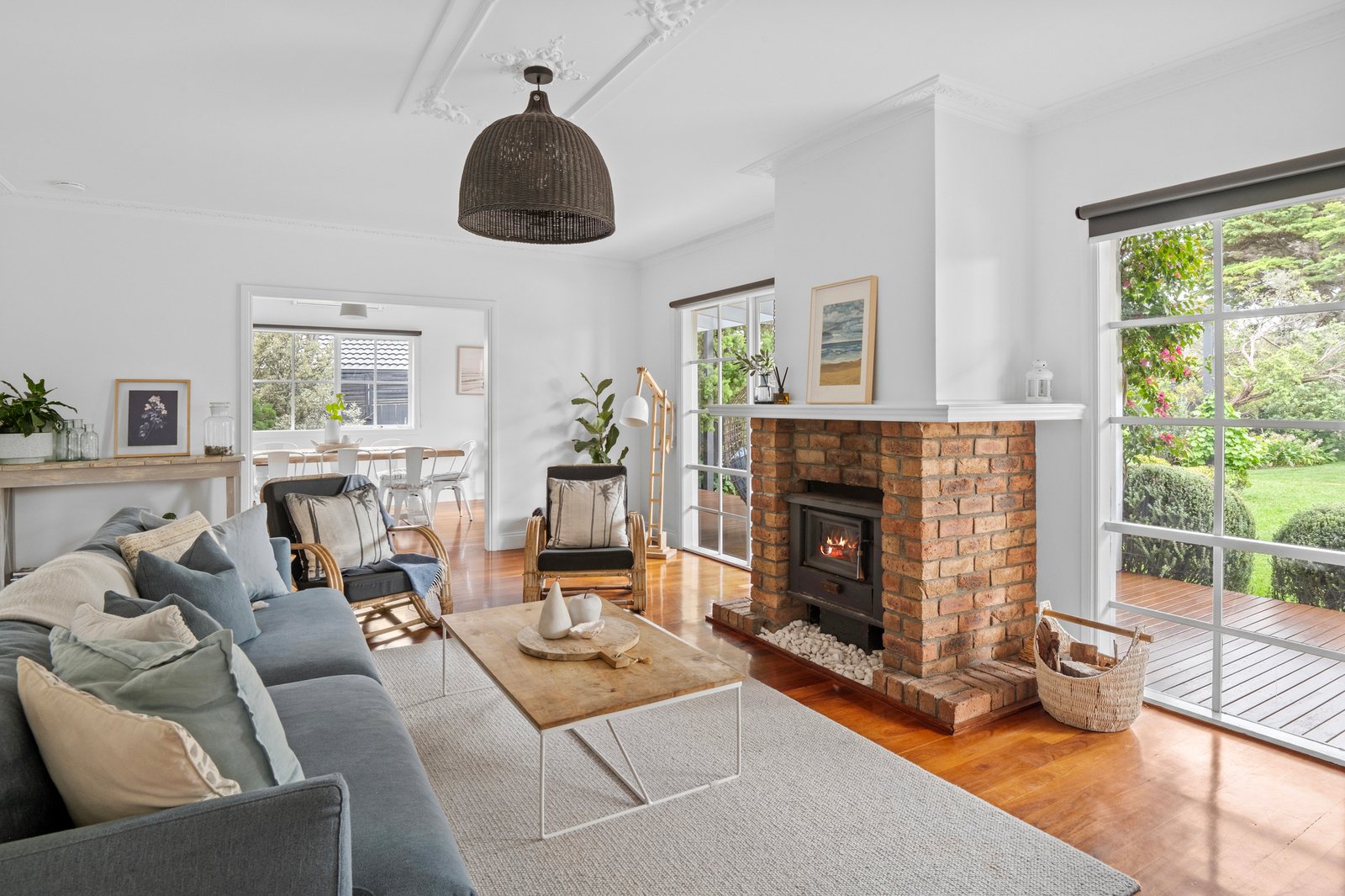Downstairs, the atmosphere is one of ease and retreat, unfolding around a spacious fireside living domain that opens to a north-facing alfresco deck. Garden outlooks extend across the lawned grounds and tree house, forming a calm and private backdrop for entertaining and unhurried post-beach dinners, with the nearby kitchen integrated seamlessly through stone finishes, electric cooktop and wall oven.