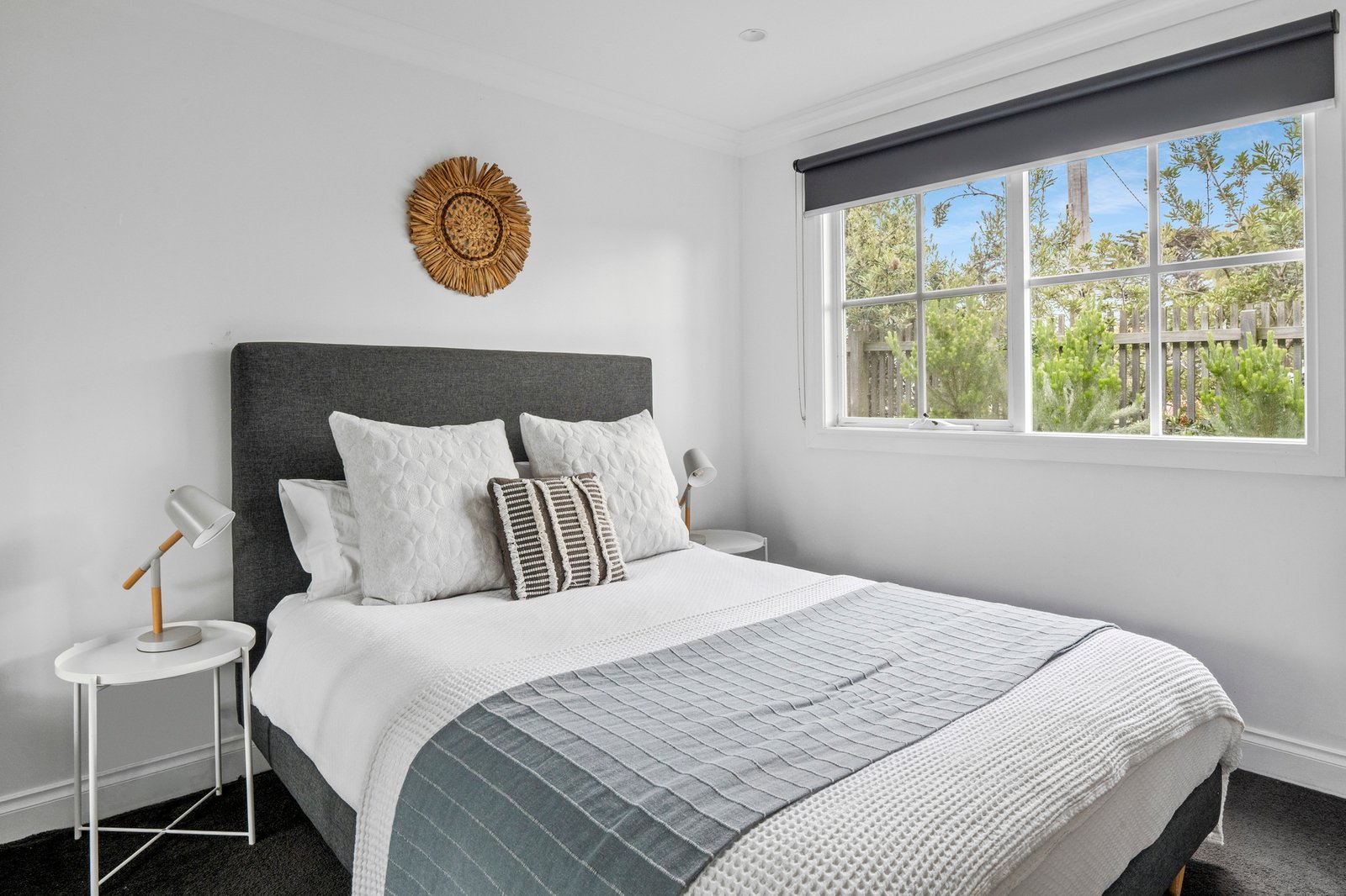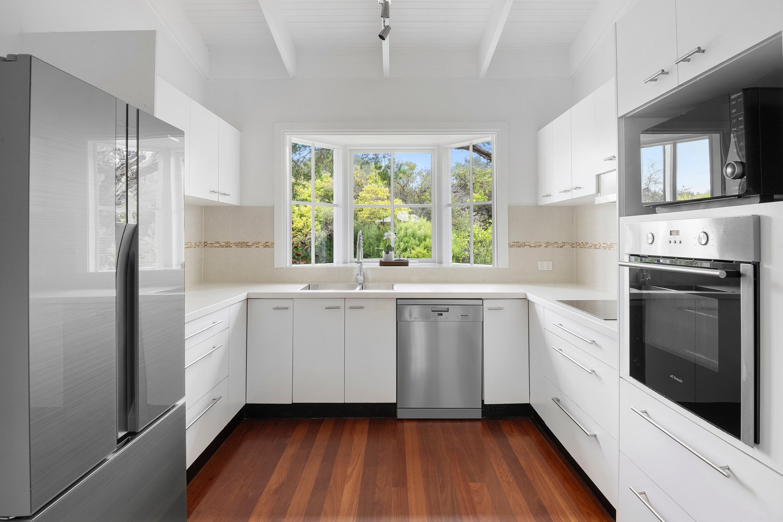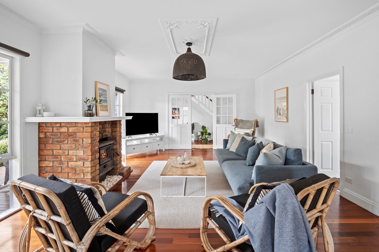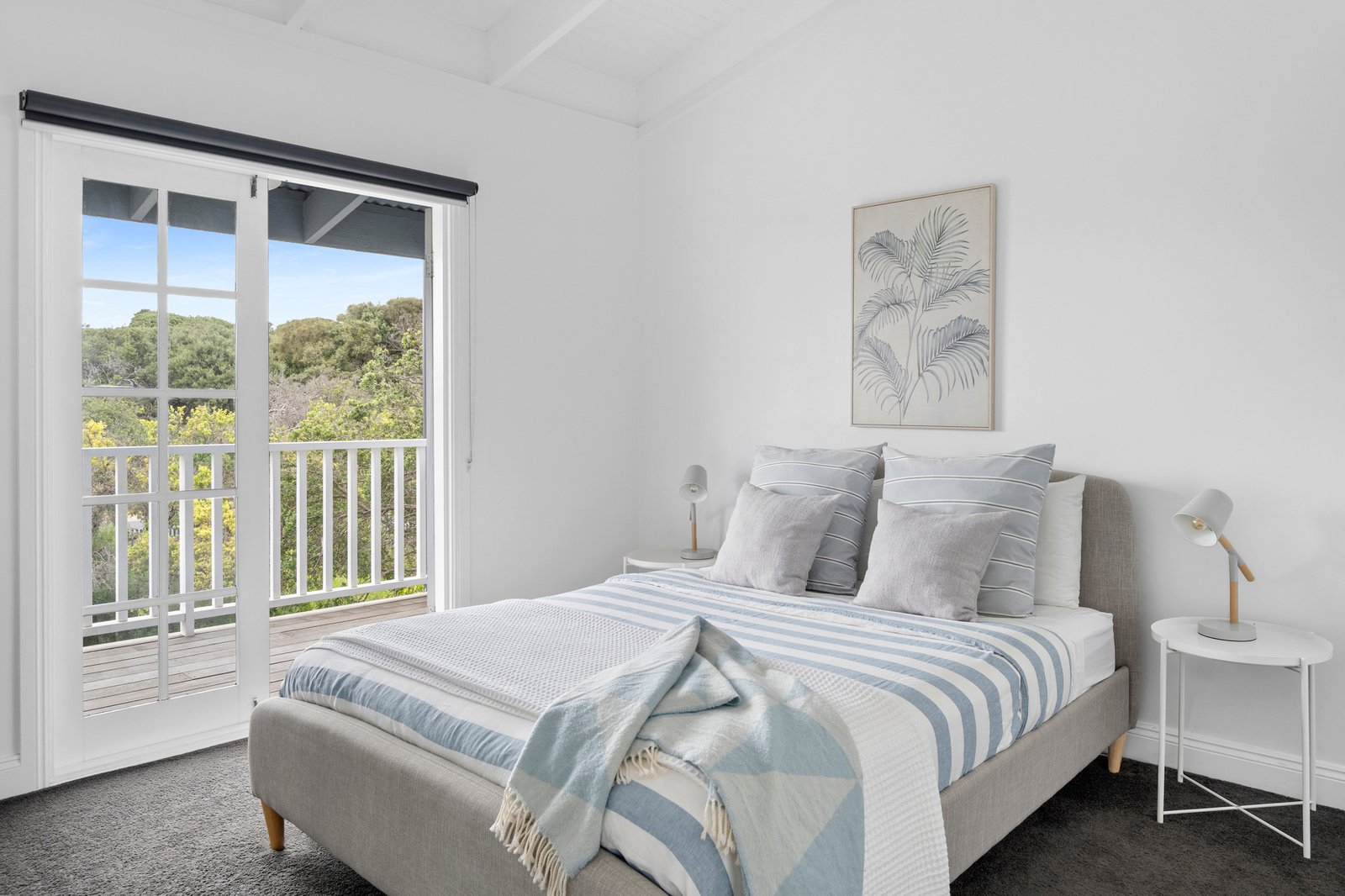 Downstairs, the atmosphere is one of ease and retreat, unfolding around a spacious fireside living domain that opens to a north-facing alfresco deck. Garden outlooks extend across the lawned grounds and tree house, forming a calm and private backdrop for entertaining and unhurried post-beach dinners, with the nearby kitchen integrated seamlessly through stone finishes, electric cooktop and wall oven.