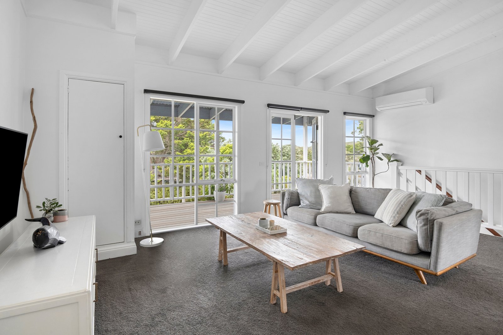 Also on this level, the primary suite enjoys deck access via French doors, a walk-in robe and ensuite with a bath, while upstairs is reserved for three robed bedrooms, a main bathroom and an additional living area with balcony access, forming a zone ideal for teenagers or extended family.
