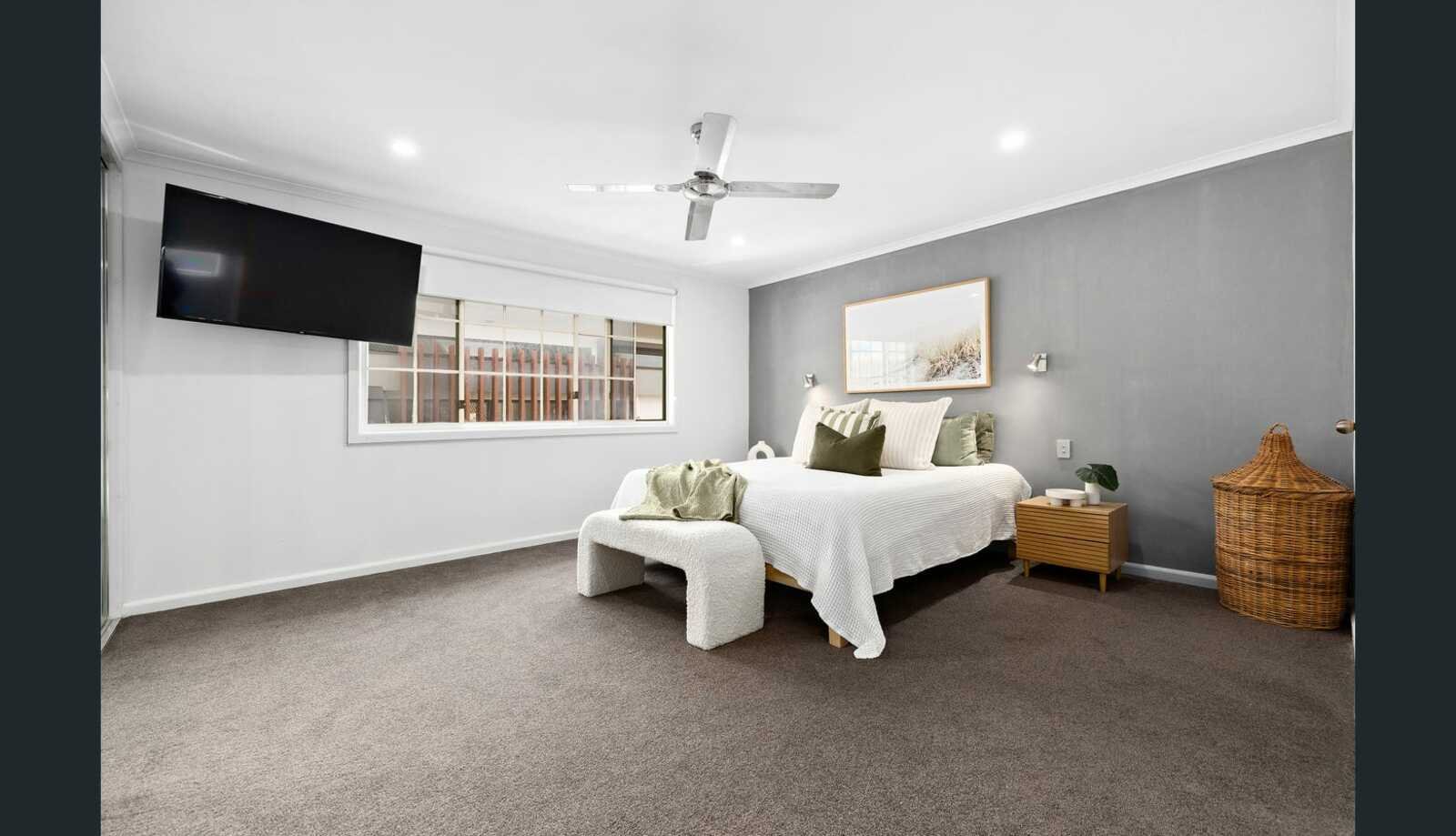 The gourmet kitchen is anchored by a stone island bench with waterfall edges and pendant lighting, and is equipped with a family sized stainless steel gas cooktop and oven, teppanyaki grill at the bifold bar window, overhead skylights, excellent storage and a breakfast bar. The adjoining living and dining areas are bathed in natural light and extend through bifold doors to a large decked alfresco area overlooking a fully paved backyard and solar-heated swimming pool, ideal for summer entertaining and relaxed weekends at home.