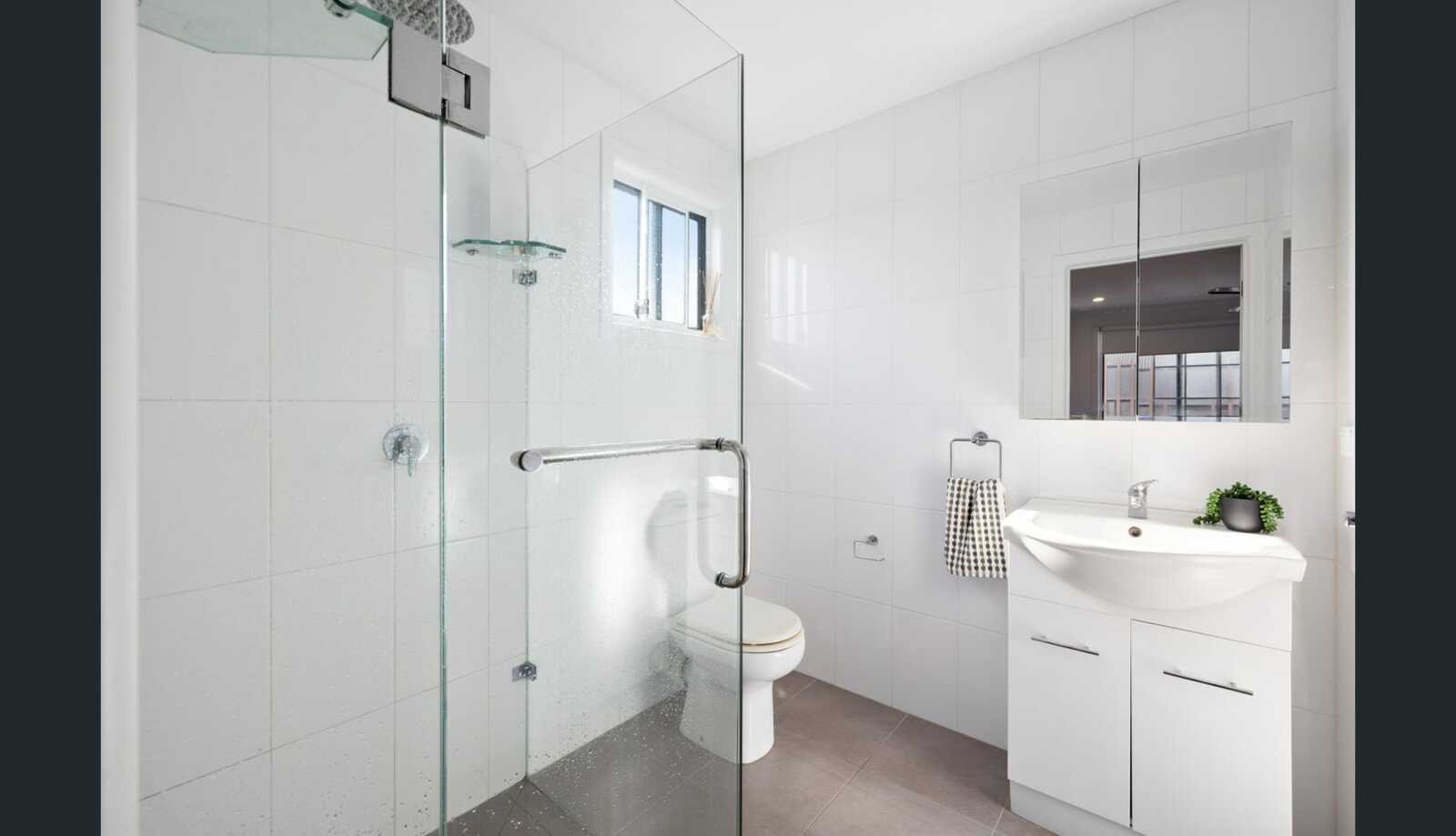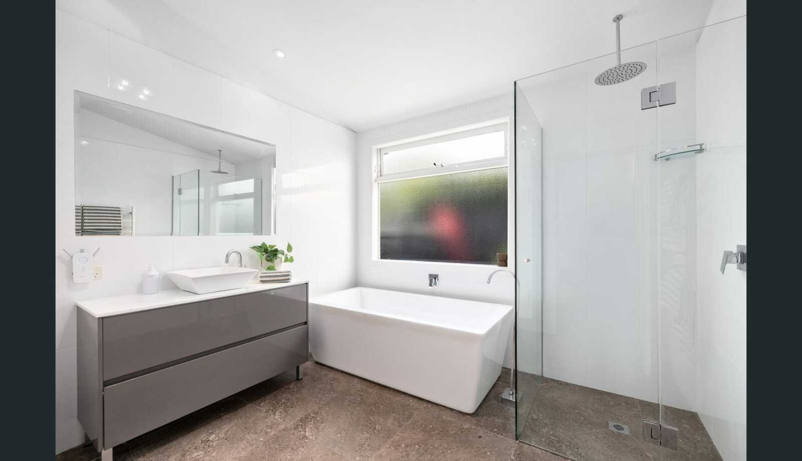 The ground floor also comprises two generous bedrooms one with built-in robes, serviced by a stylish central bathroom with floor-to-ceiling tiling, bathtub and rain shower. A full-size laundry, powder room and walk-in storage room further enhance the functionality of this level.