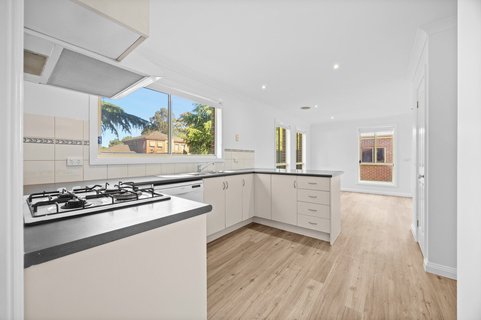 - Kitchen equipped with 600mm gas cooktop, oven, dishwasher, walk in pantry