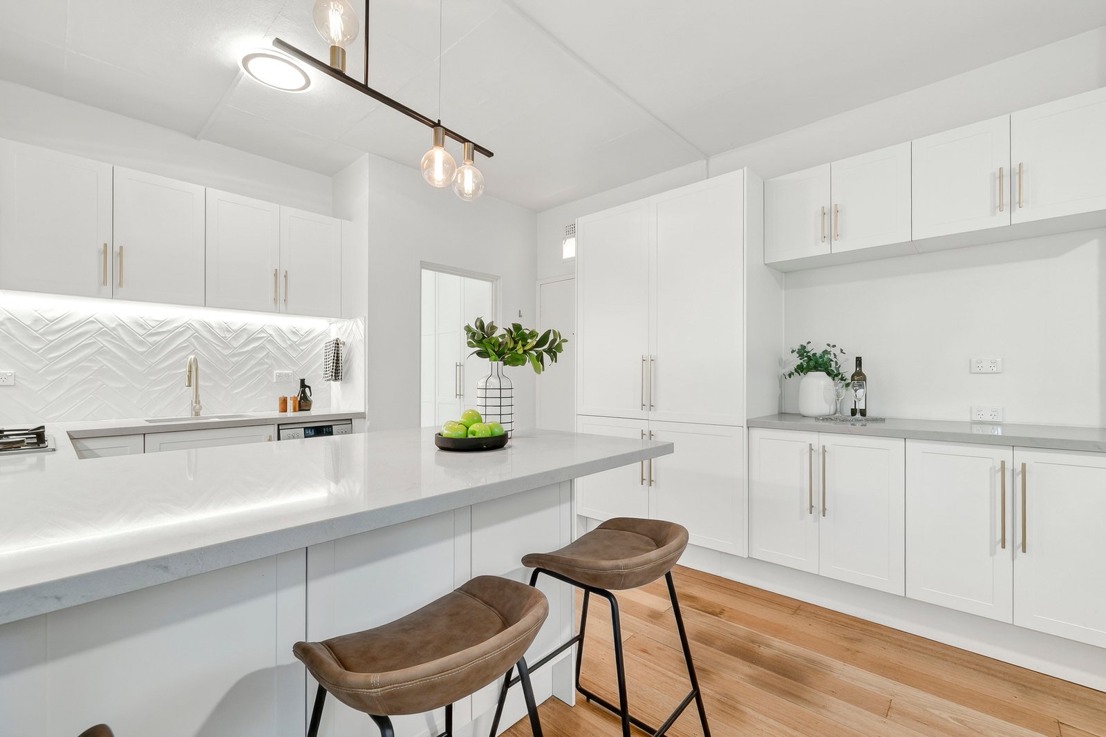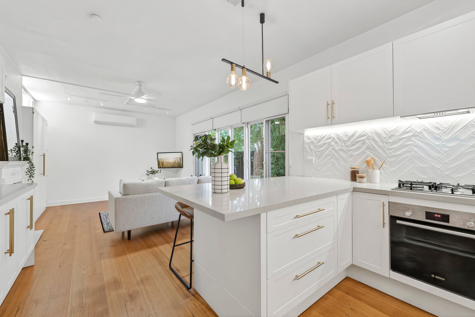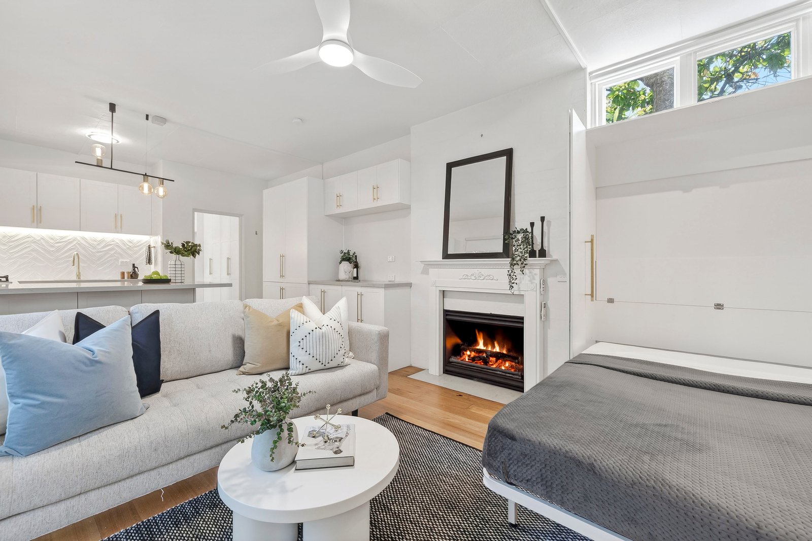 Graced with a ground-floor position at the front of a boutique group of mid-century units, this renovated STUDIO home is appointed in a streamlined style, with stainless-steel and integrated appliances to the stone kitchen, expansive stone benchtops incorporating dining, a luxe bathroom with laundry facilities, timber floors throughout, and a pull-down queen bed adjoining the spacious living zone.