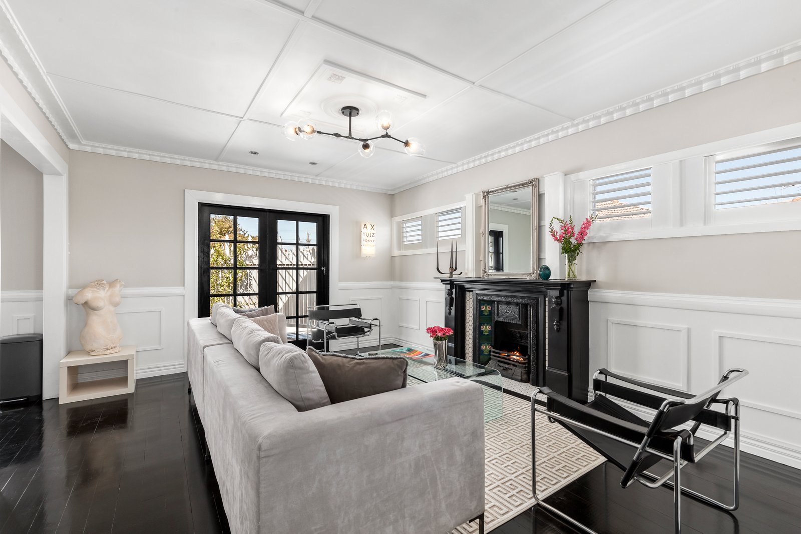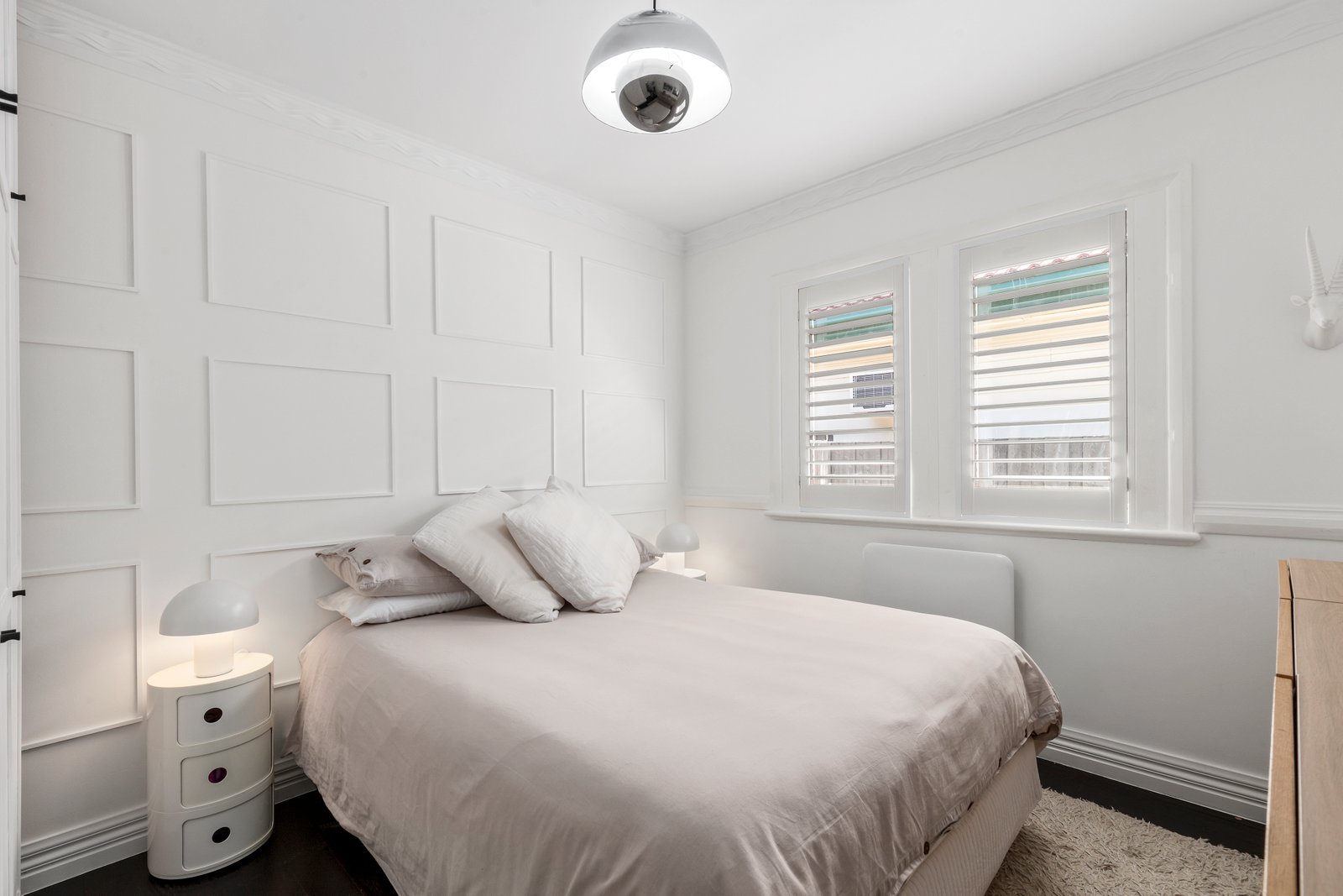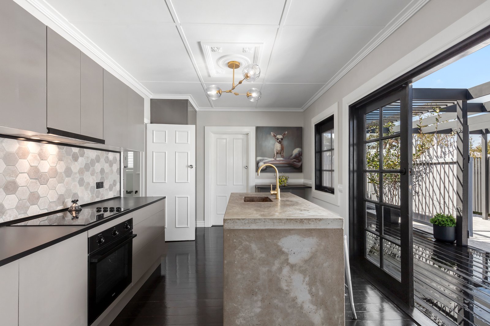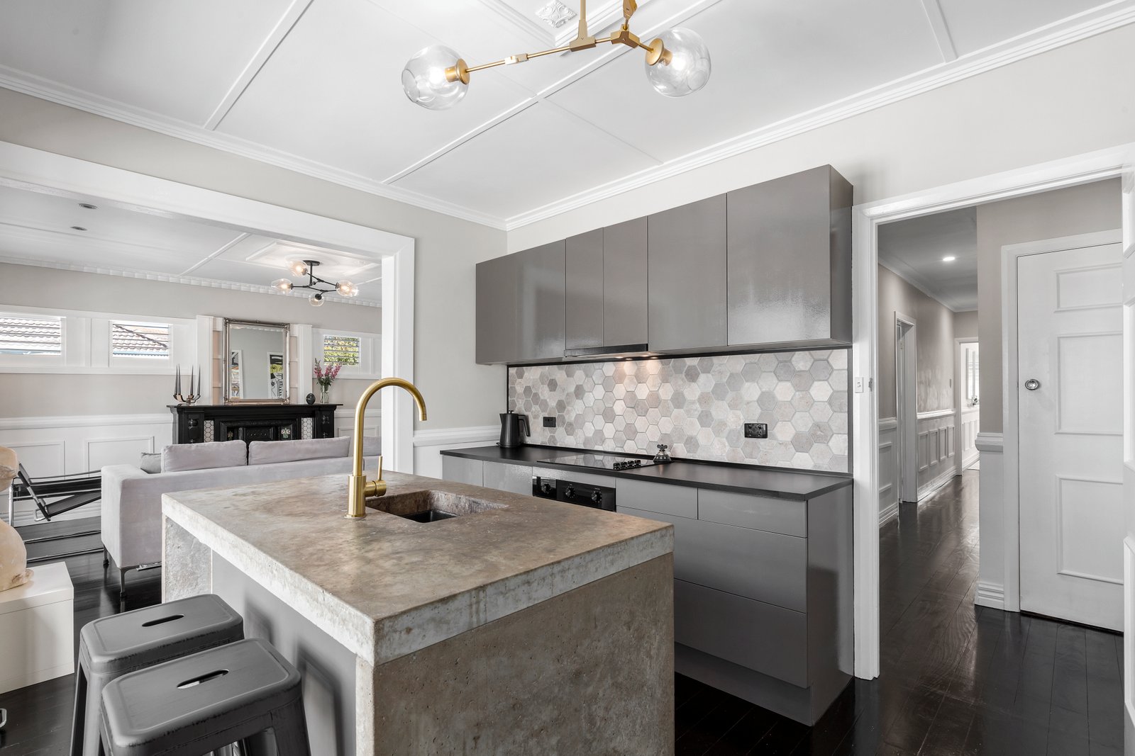 Step inside to discover dark-stained original hardwood floors contrasting beautifully with fresh white walls, custom panelling, and statement pendant lighting in each room. The kitchen makes a bold statement, featuring a custom-designed concrete island that provides seating space and discreet utility storage. Ideal for both entertaining and casual family meals, this kitchen is as practical as it is impressive.