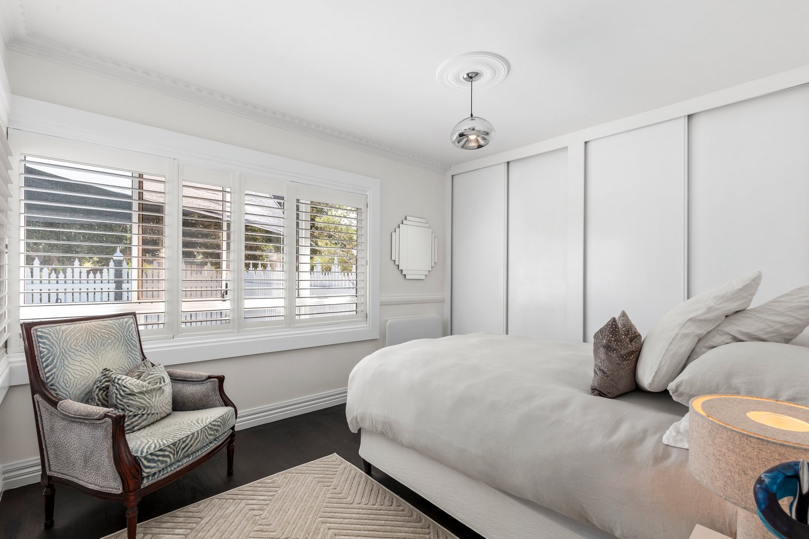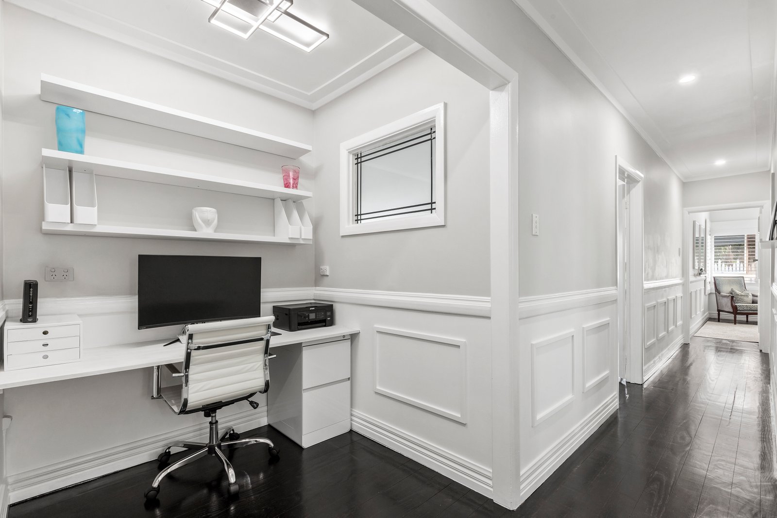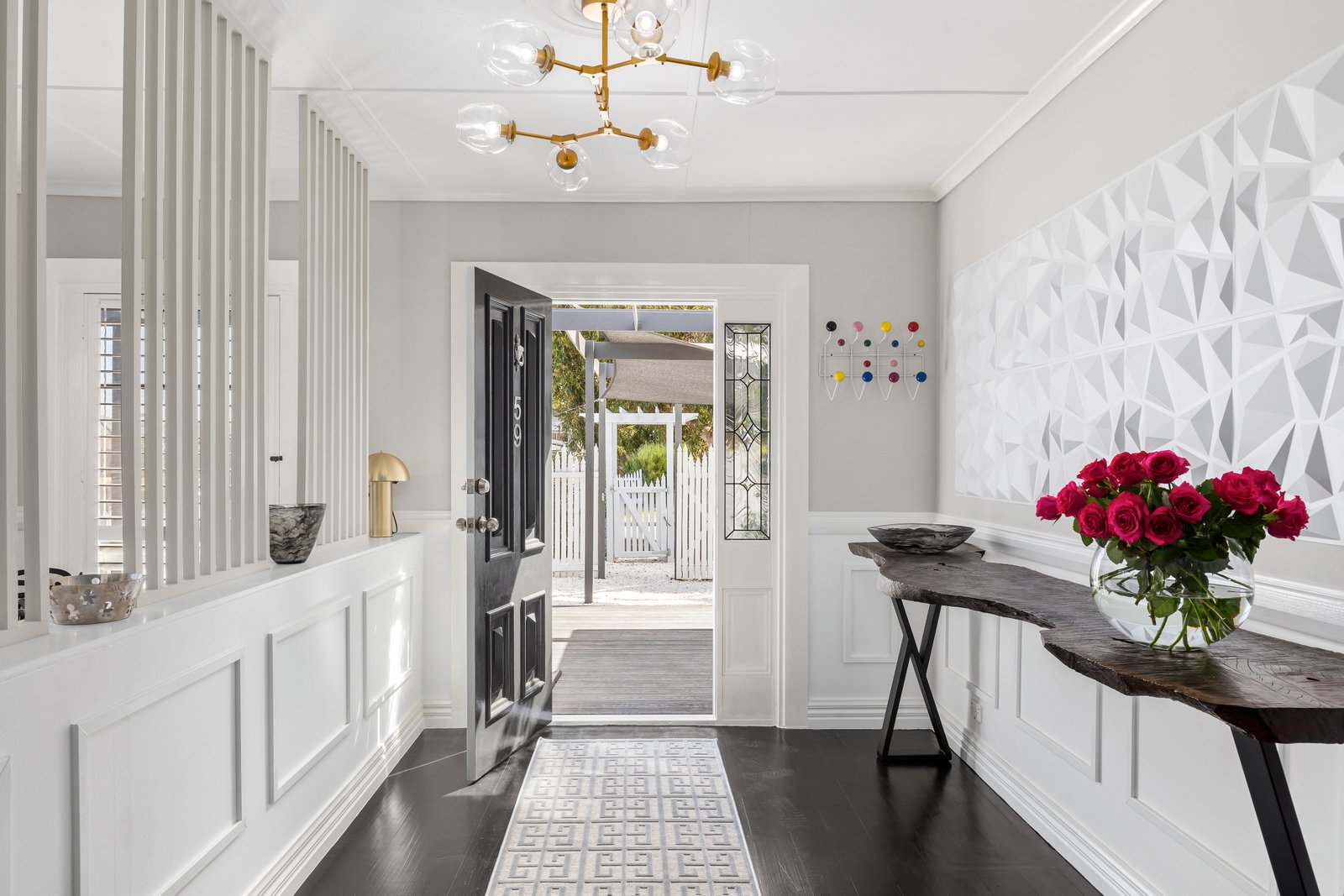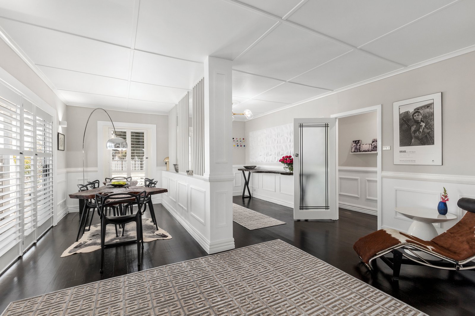 Step inside to discover dark-stained original hardwood floors contrasting beautifully with fresh white walls, custom panelling, and statement pendant lighting in each room. The kitchen makes a bold statement, featuring a custom-designed concrete island that provides seating space and discreet utility storage. Ideal for both entertaining and casual family meals, this kitchen is as practical as it is impressive.