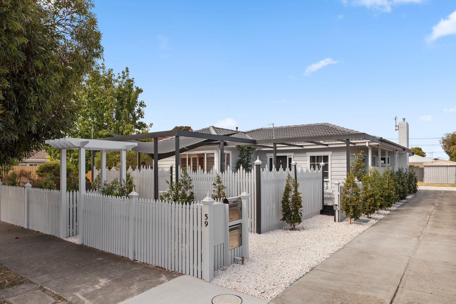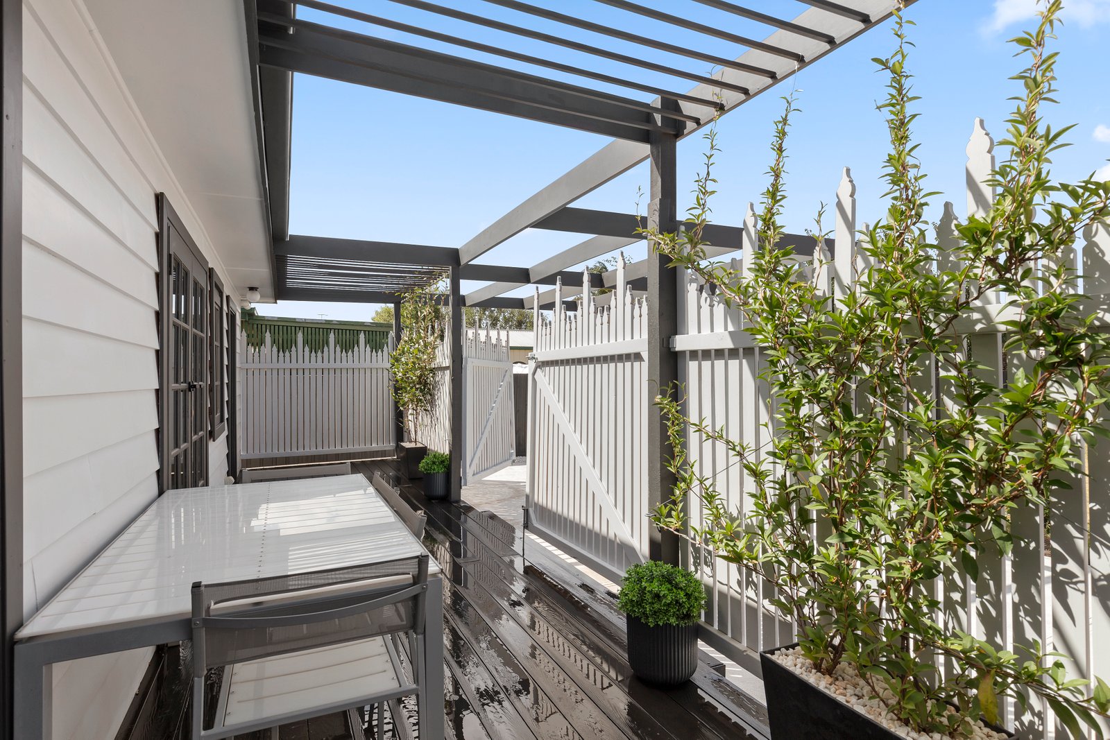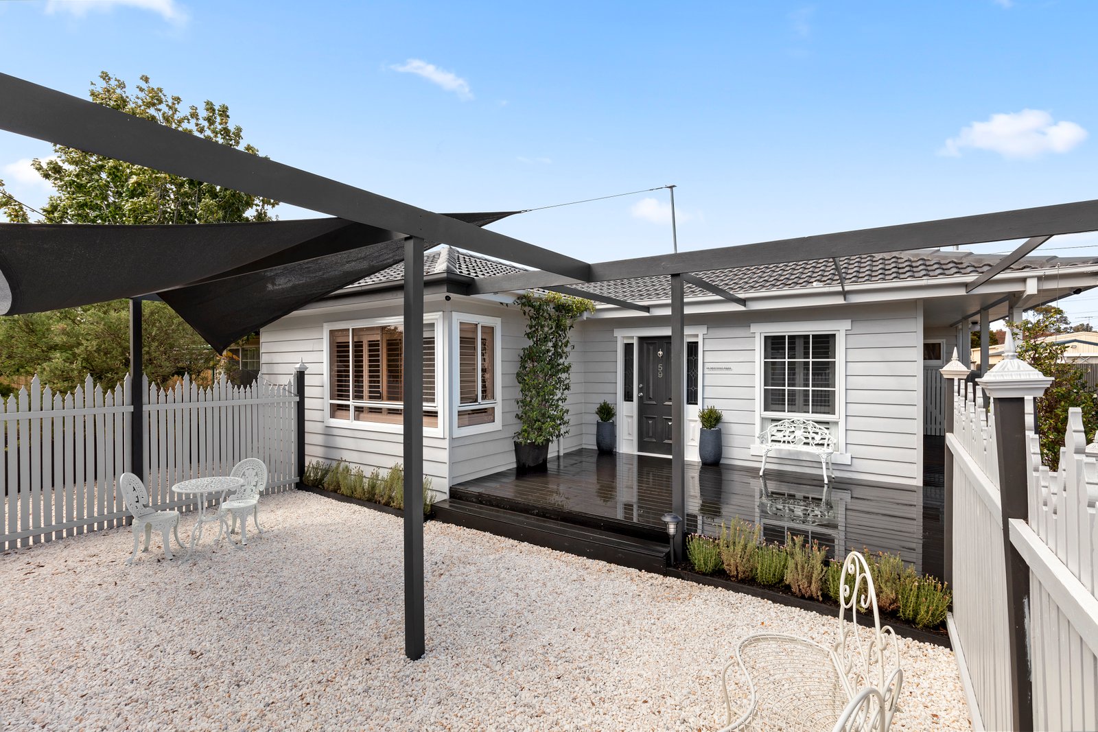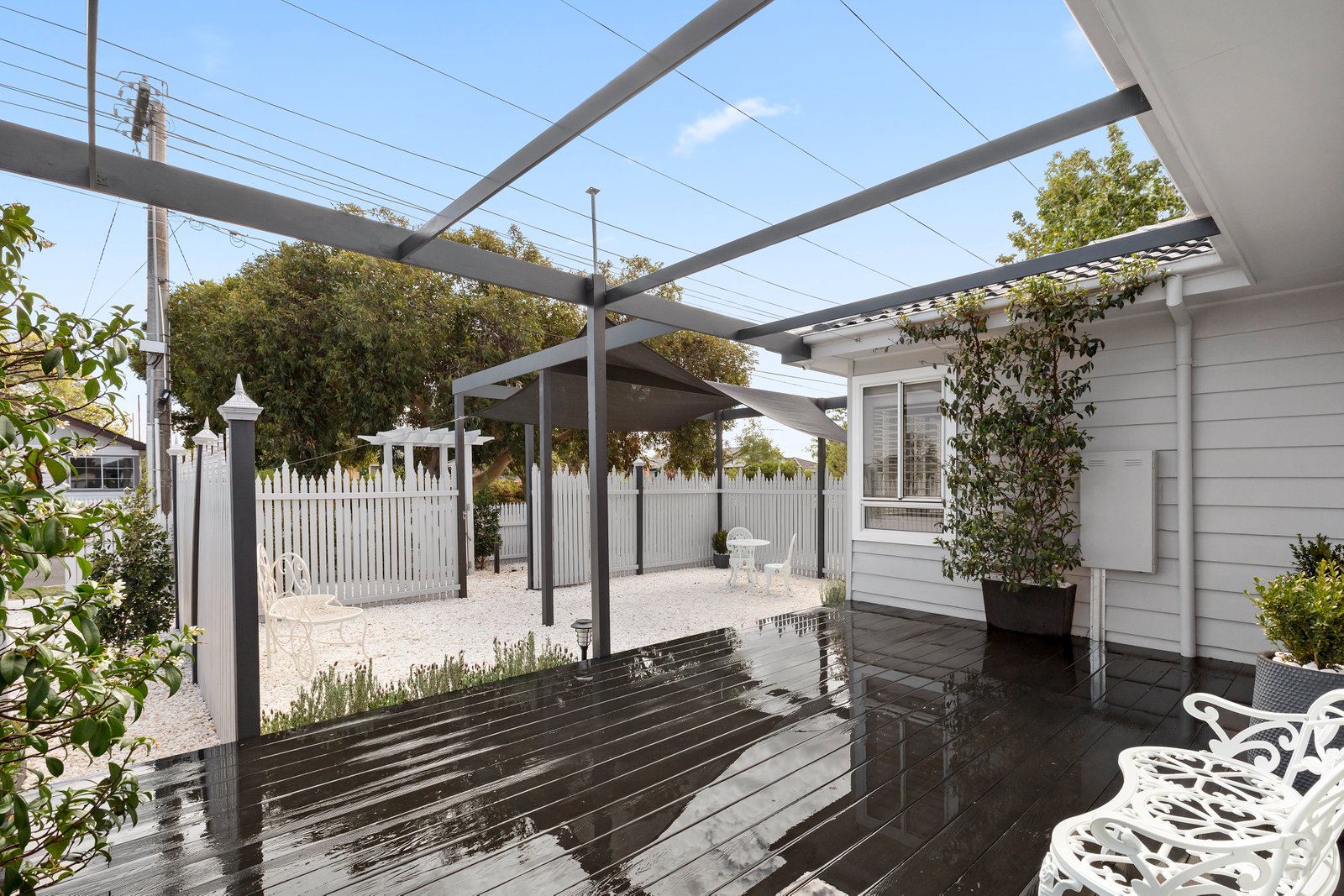 - Low-maintenance front courtyard with white quartz topping, rear deck, and parking for two cars