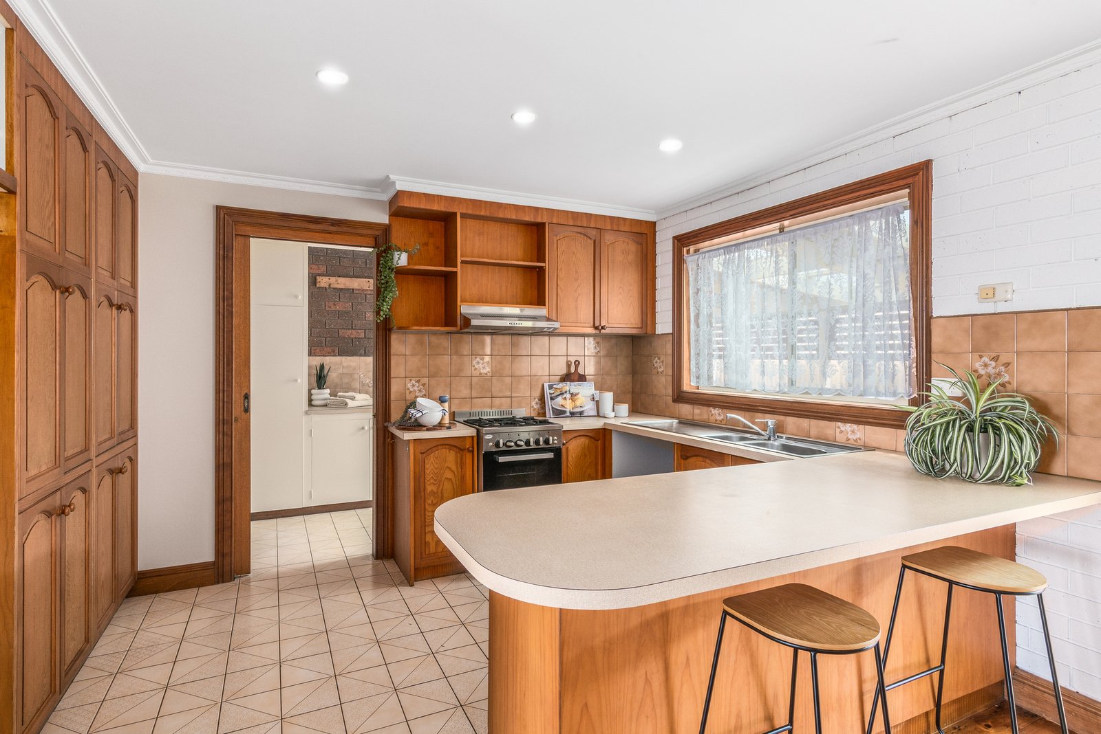 Set back from the road amongst established gardens, the home enjoys a private setting. Entry reveals a spacious open plan layout, featuring light neutral interiors, polished timber floors, downlights, exposed brick detail, and a beautiful bay window. The living and dining areas flow through to a well-appointed kitchen, featuring quality timber cabinetry, stainless steel 600mm oven and cooktop, rangehood, ample bench space and generous storage provisions. The dining space connects with a large undercover alfresco, creating an effortless indoor-outdoor connection, perfect for relaxation or entertaining. Upstairs, two bedrooms include built-in robes, both serviced by a bright bathroom with bath, separate shower, and vanity with storage.