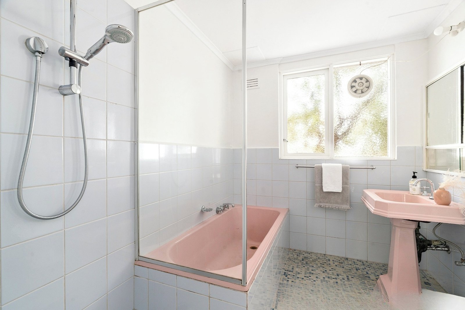 Featuring splayed balconies, timber-framed spandrel panels and elongated windows. Filled with natural sunlight, hardwood floors, and leafy aspects, the apartment offers a traditional entry foyer, an inviting living and dining room opening onto a covered splayed balcony raised amongst the communal greenery, a retro kitchen with stainless steel stove and servery window, two generous bedrooms with built-in robes, and a classic bathroom with charming pink accents.