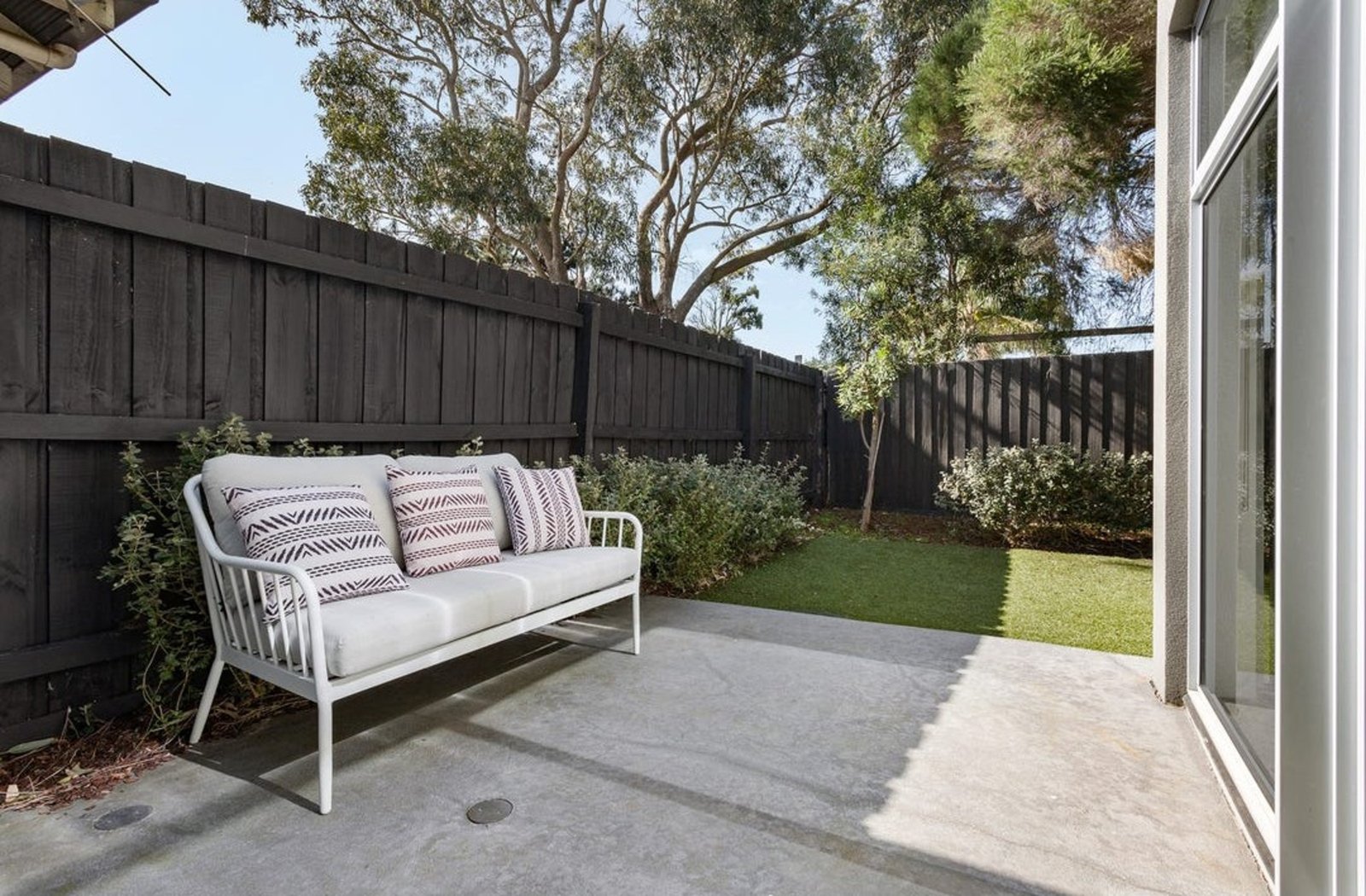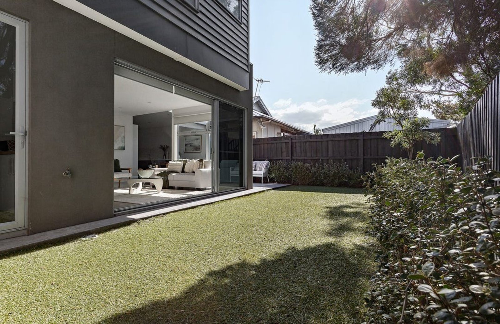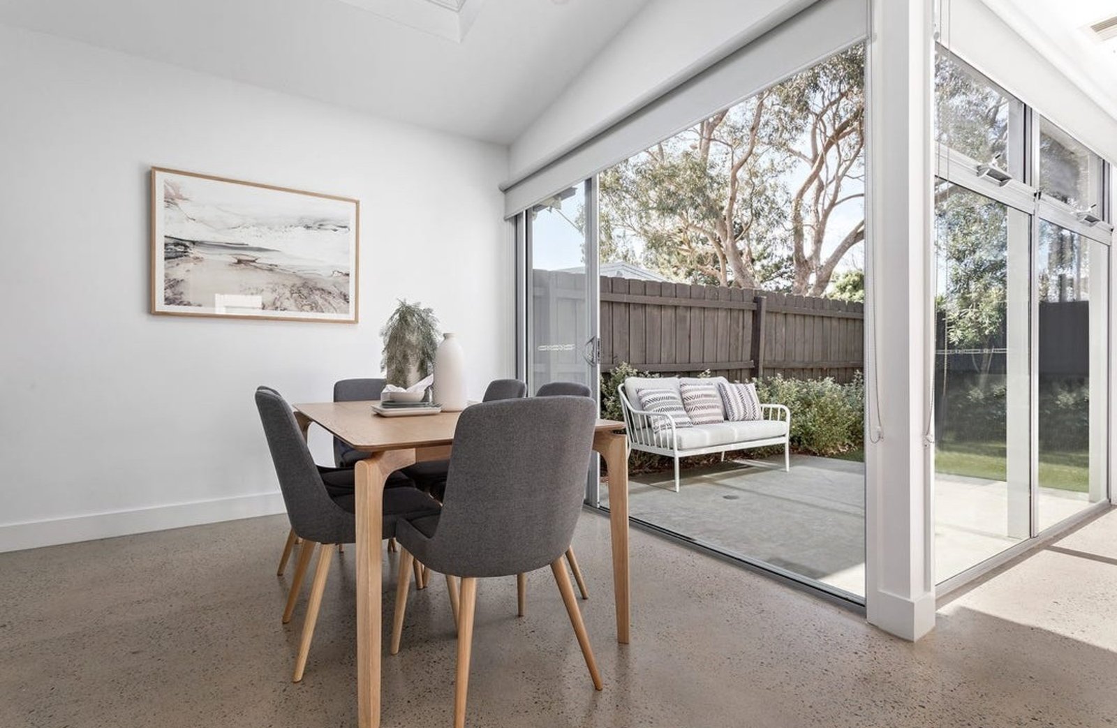 The heart of the home is a bright open-plan living and dining area, anchored by a sleek, stone-finished kitchen with stainless steel appliances and polished concrete floors. Stacking doors open onto a sunny paved entertaining zone and private lawn, perfect for kids, pets, or relaxed outdoor gatherings.