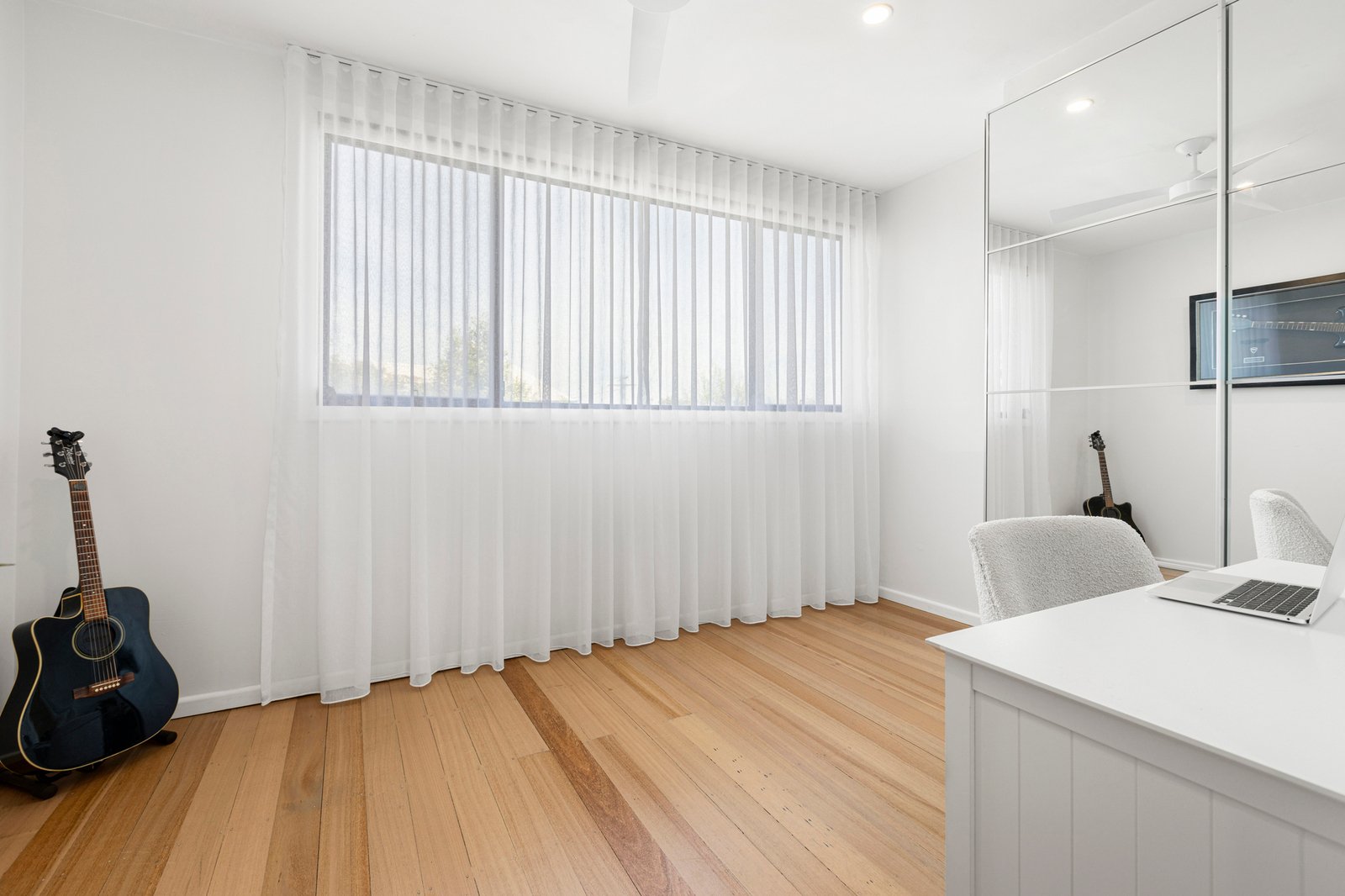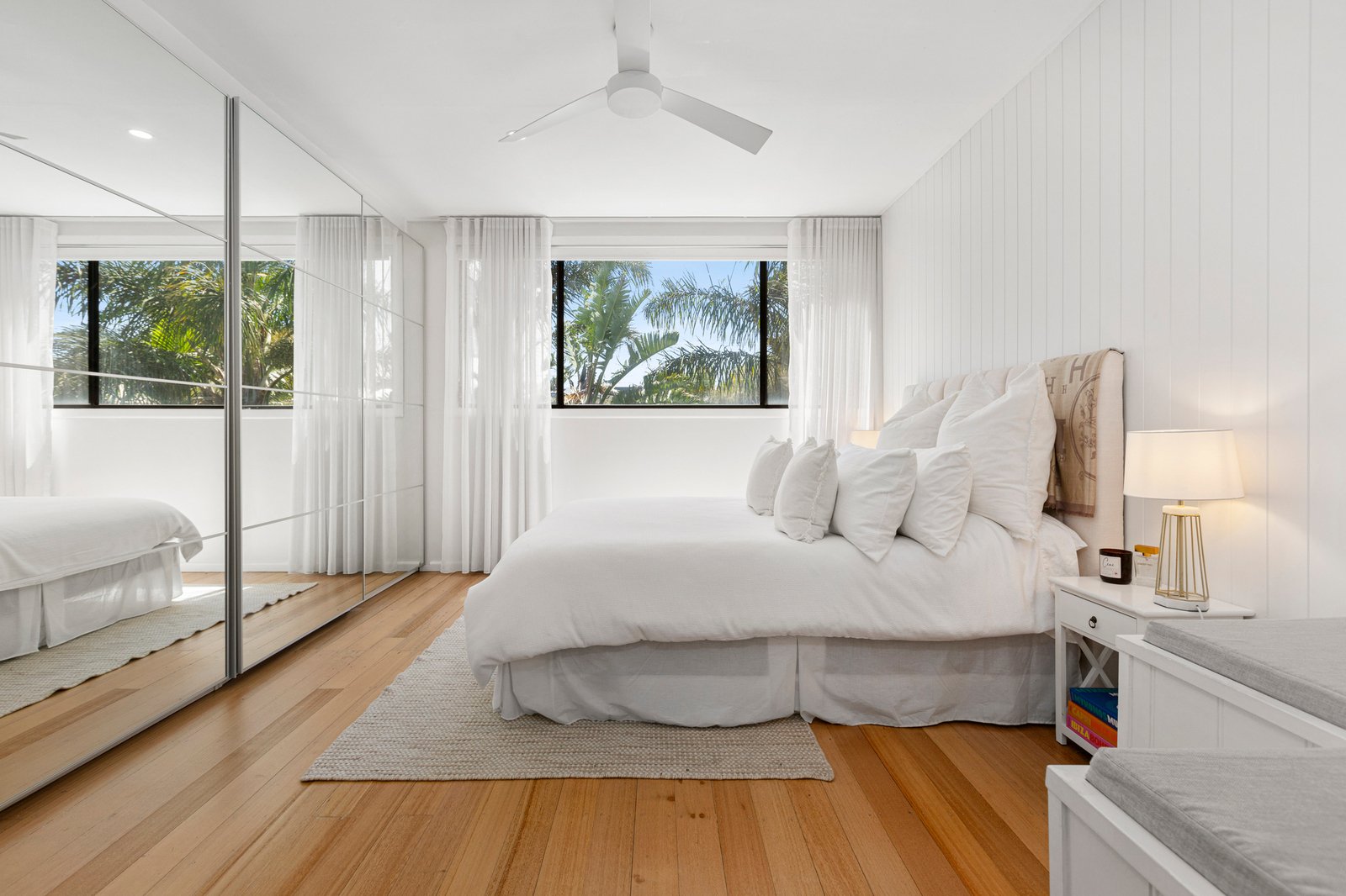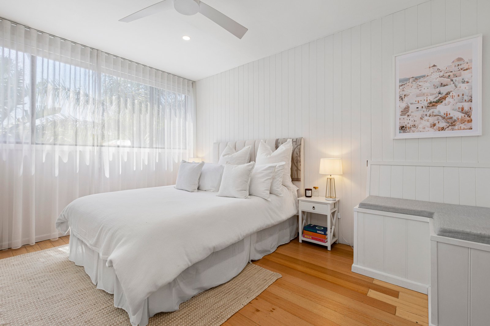 The accommodation is light, calm and thoughtfully designed, featuring two well-proportioned bedrooms filled with natural light. The main bedroom offers a peaceful retreat with soft sheer curtains, timber flooring, ceiling fan and a crisp coastal palette, further enhanced by a charming built-in window love seat—the perfect spot to relax with a book or morning coffee. The second bedroom is equally bright and versatile, ideal as a guest room, home office or study, complete with mirrored built-in robes.