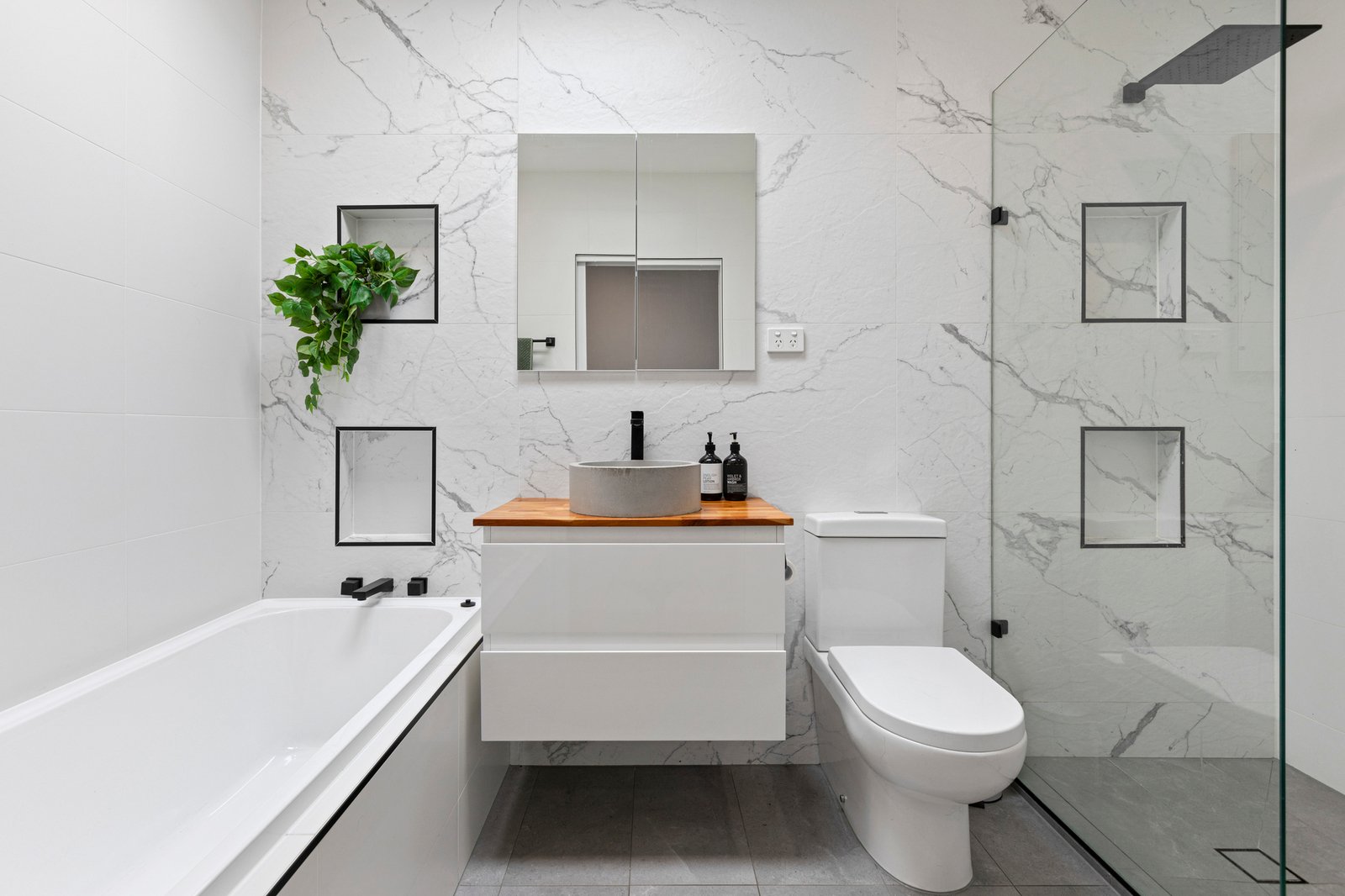 Centrally positioned, the beautifully appointed bathroom features a luxurious rain shower and stylish matte black tapware, delivering a contemporary finish and a sense of everyday indulgence.